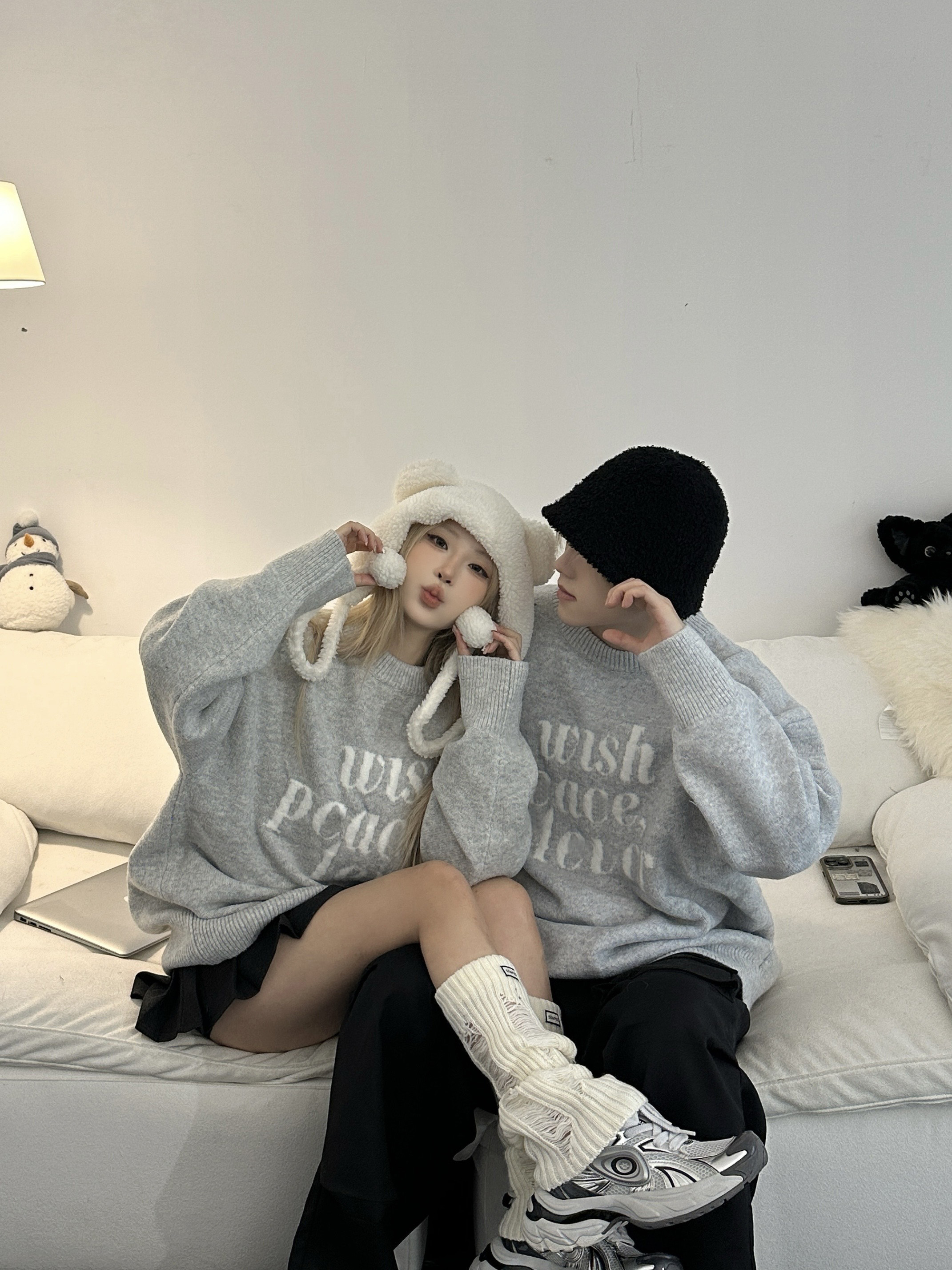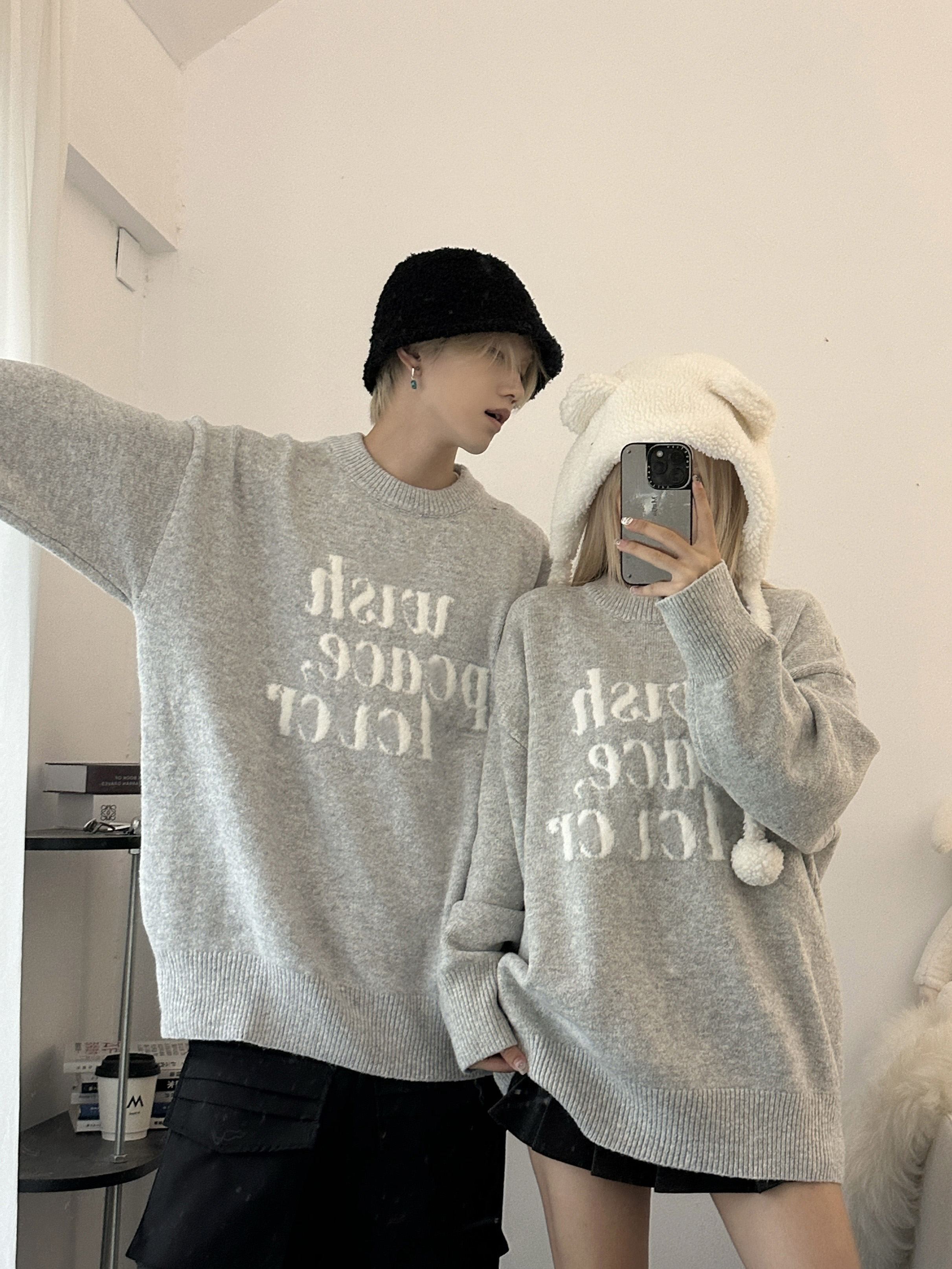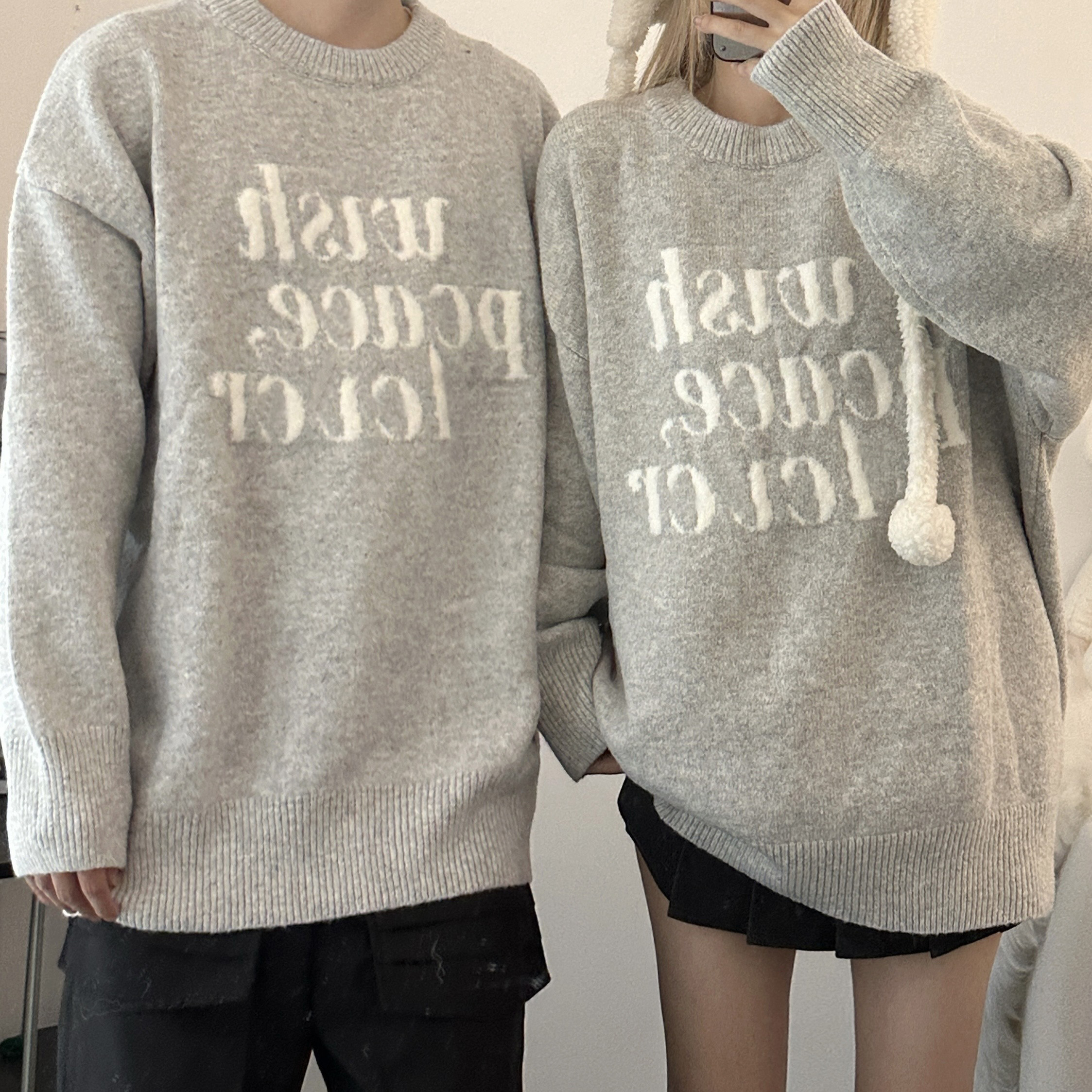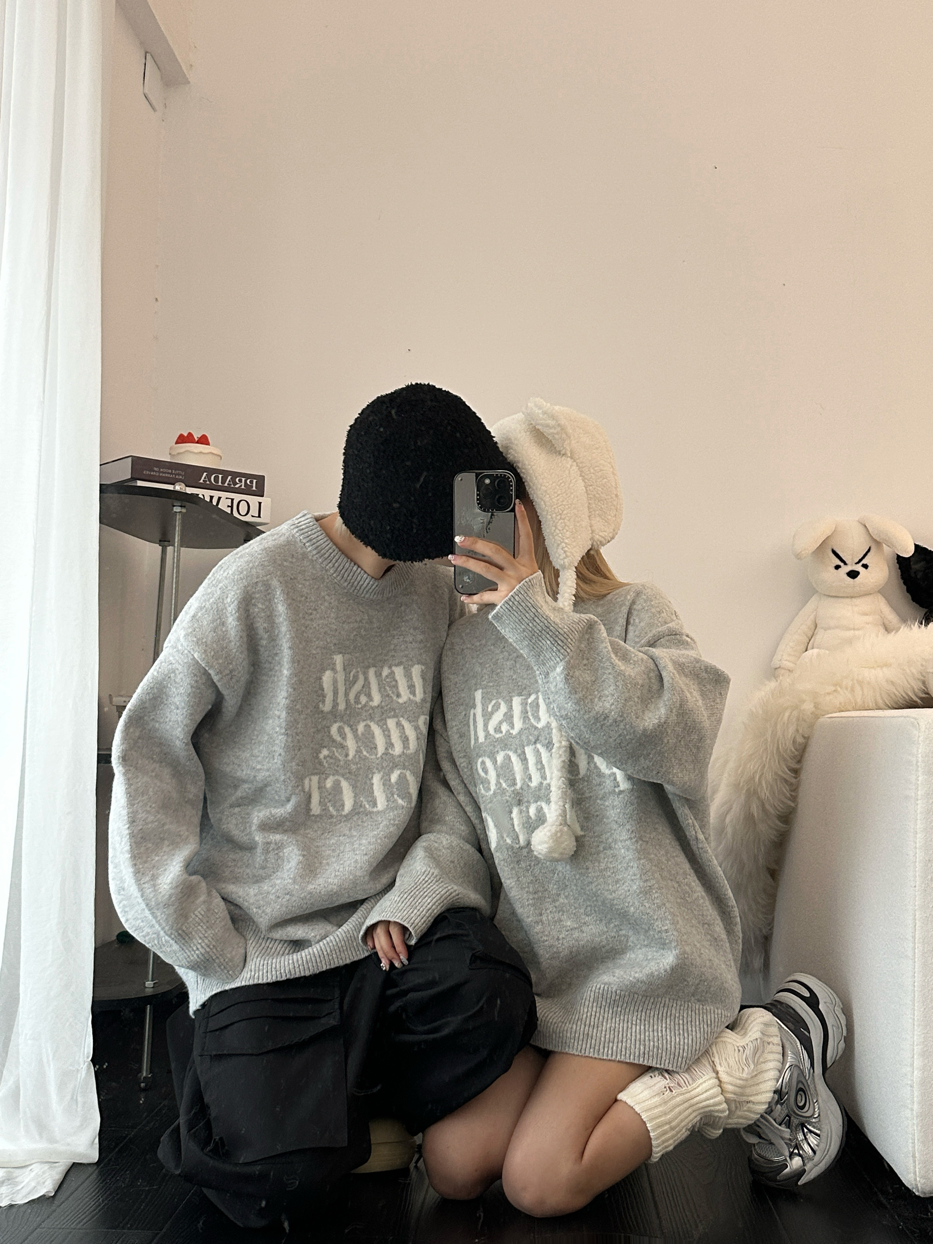 实拍2025秋冬季情侣装男女字母圆领套头毛衣