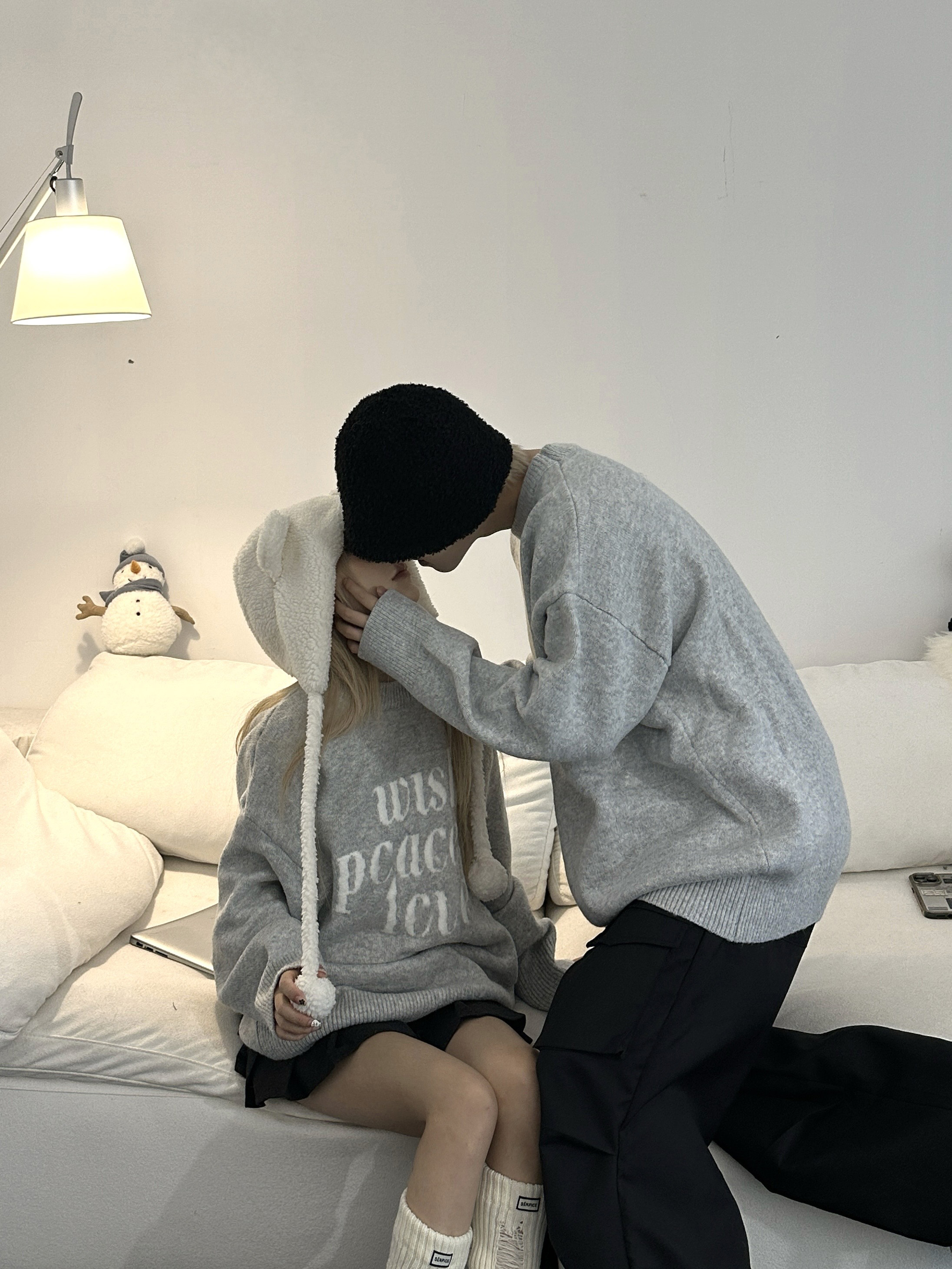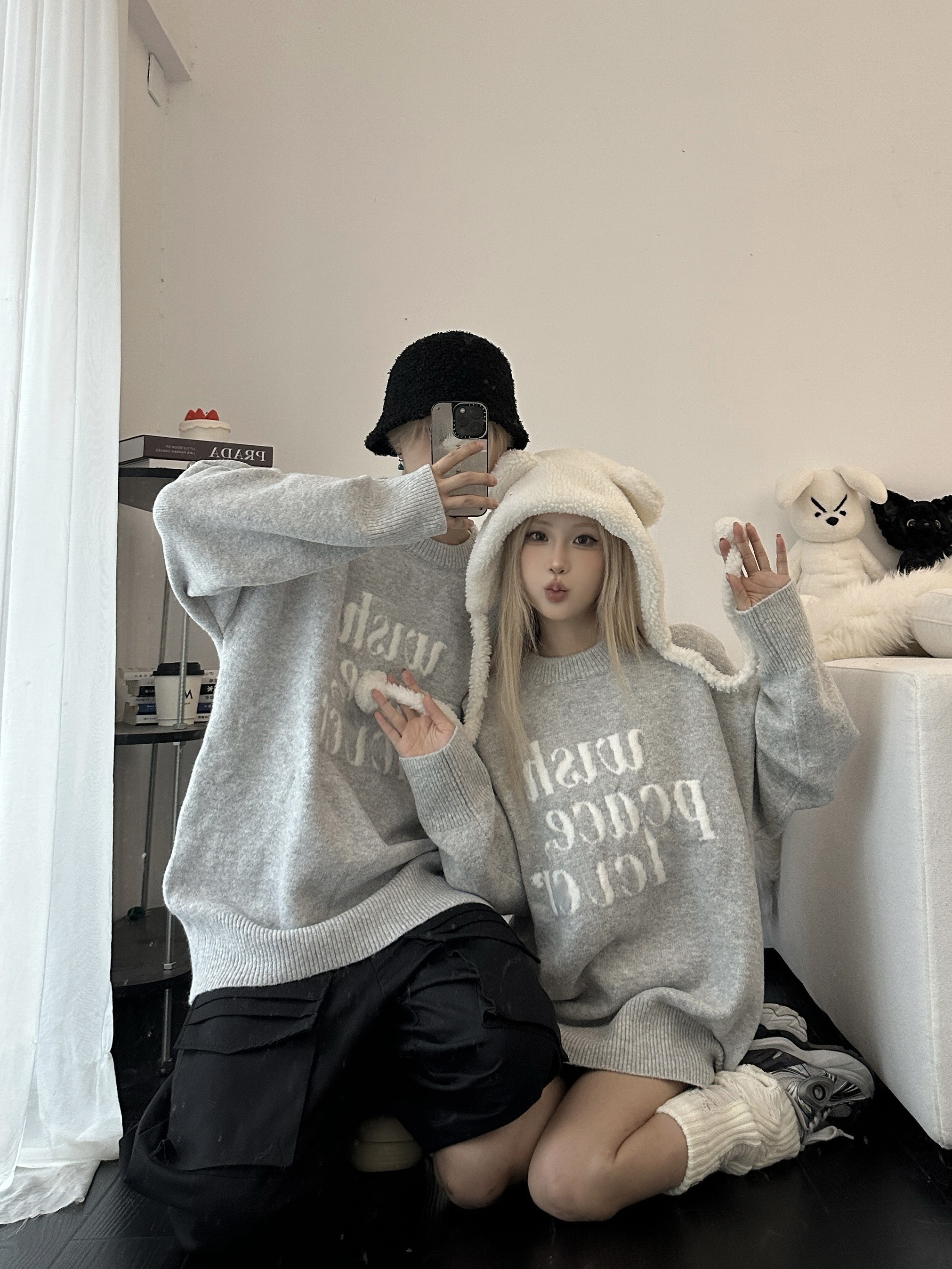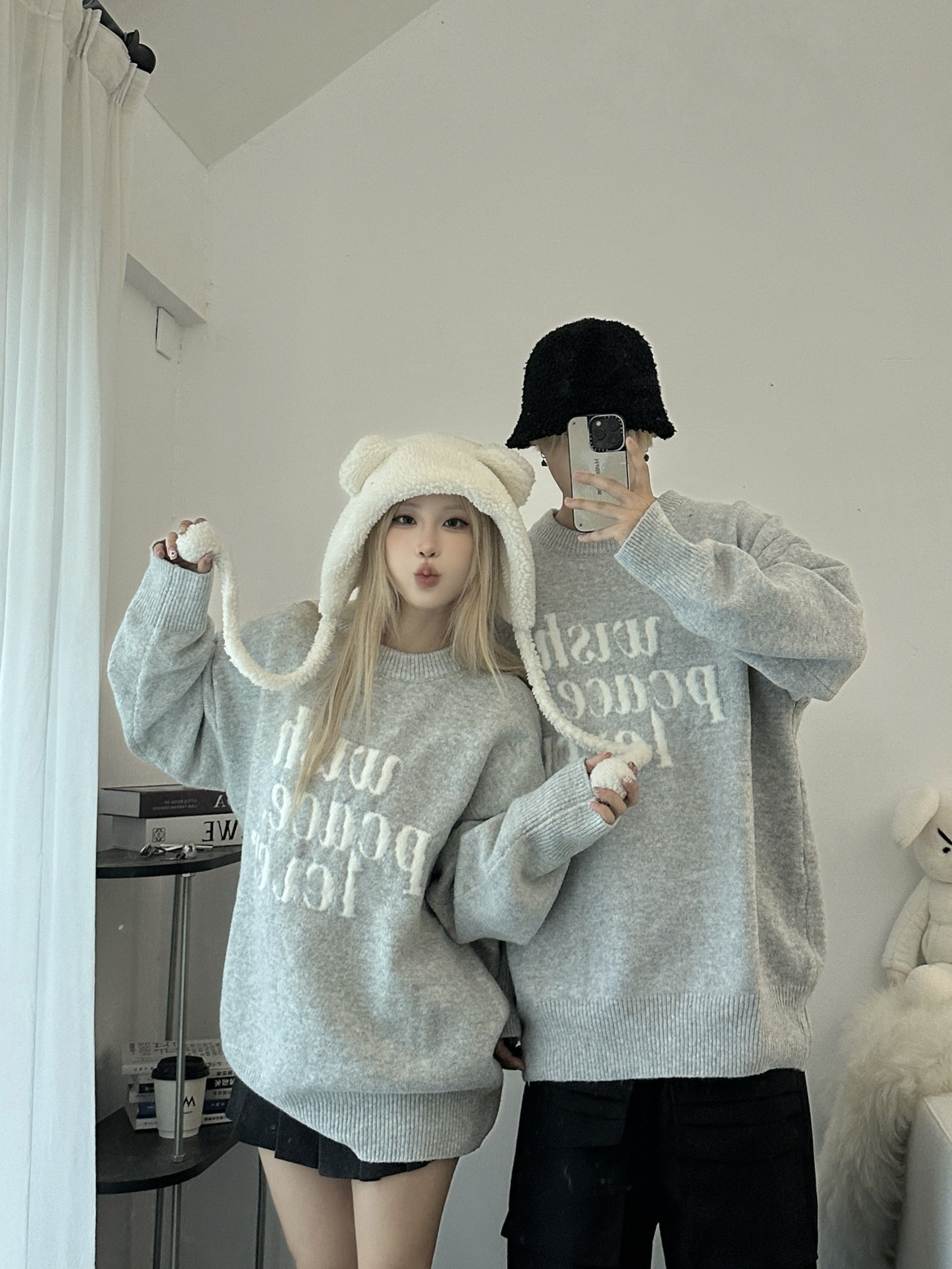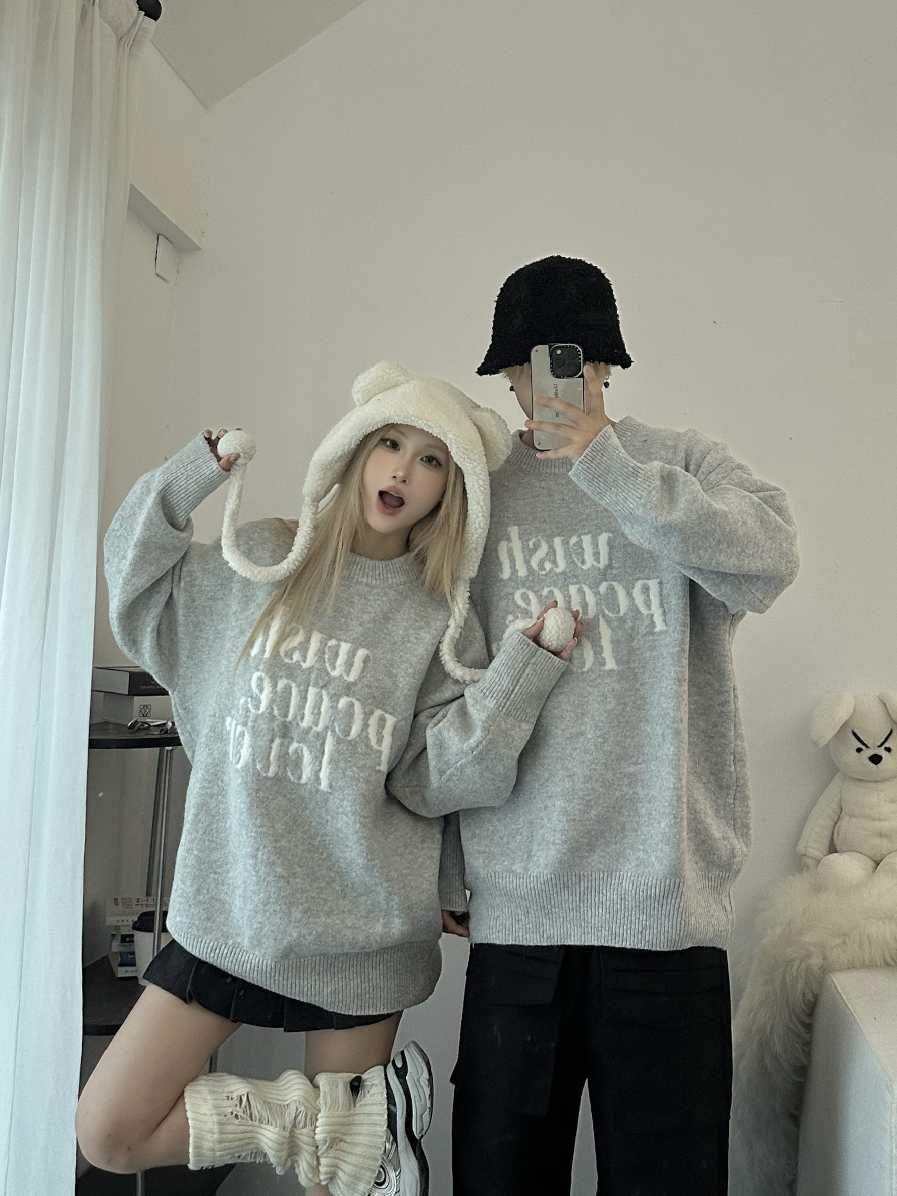 实拍2025秋冬季情侣装男女字母圆领套头毛衣