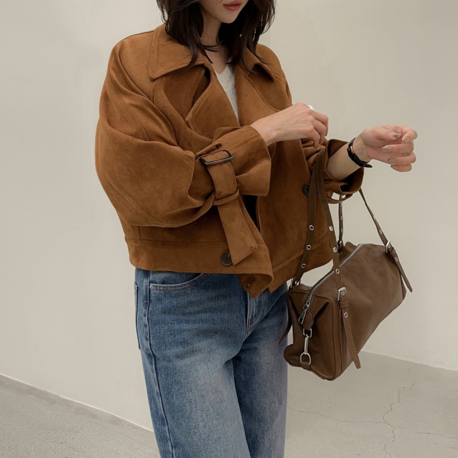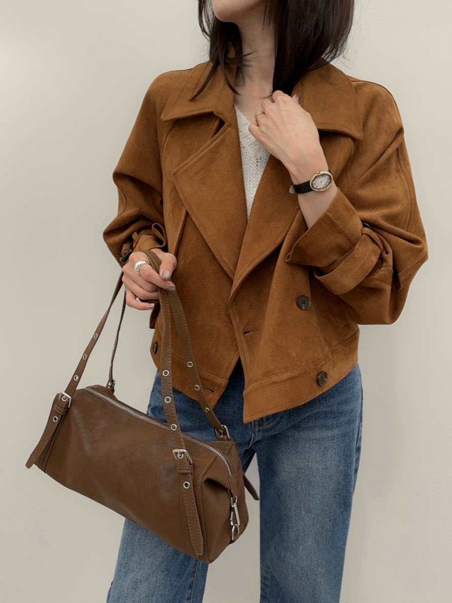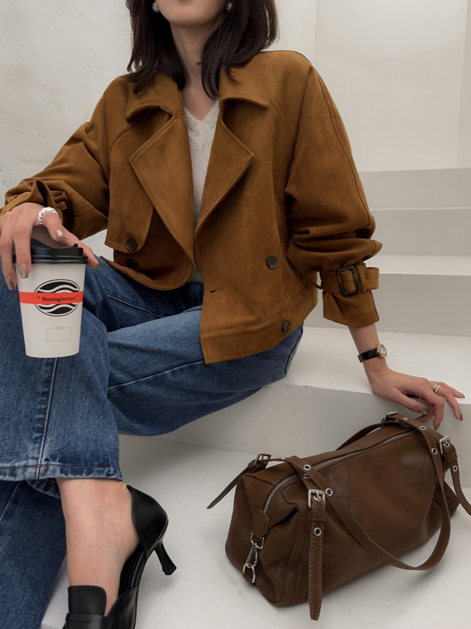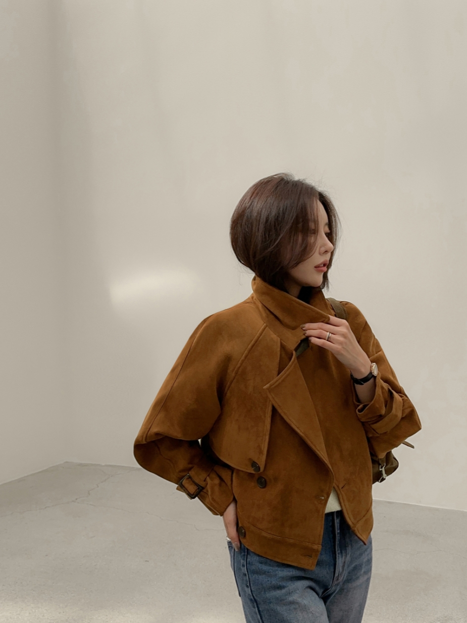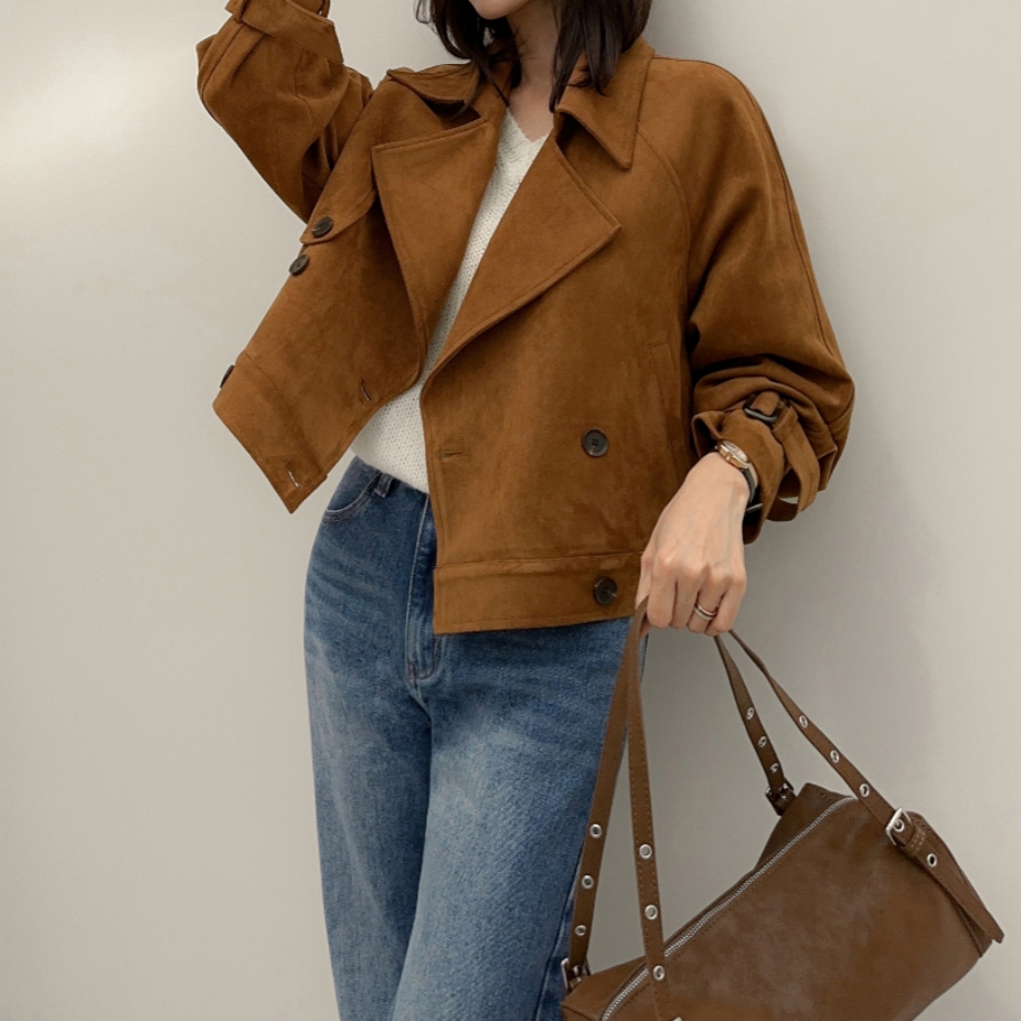 ins 韩国秋冬小众复古翻领高级感气质麂皮绒短款双排扣风衣外套