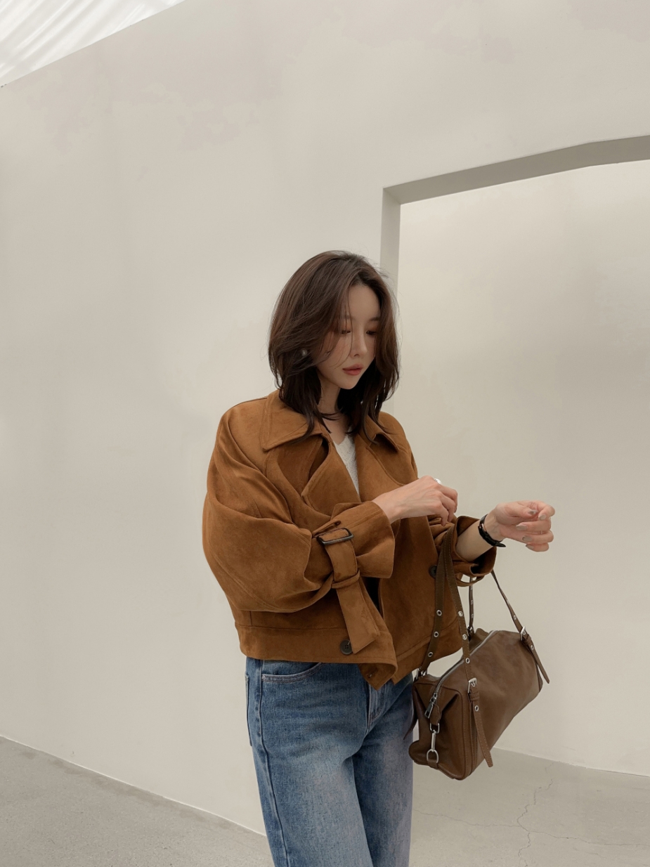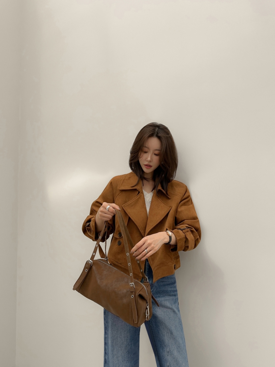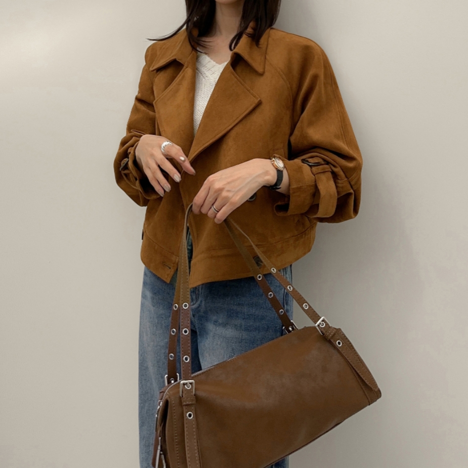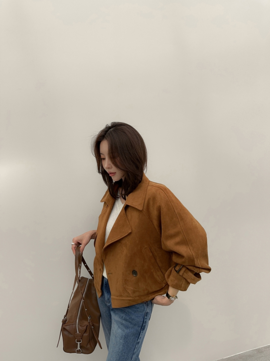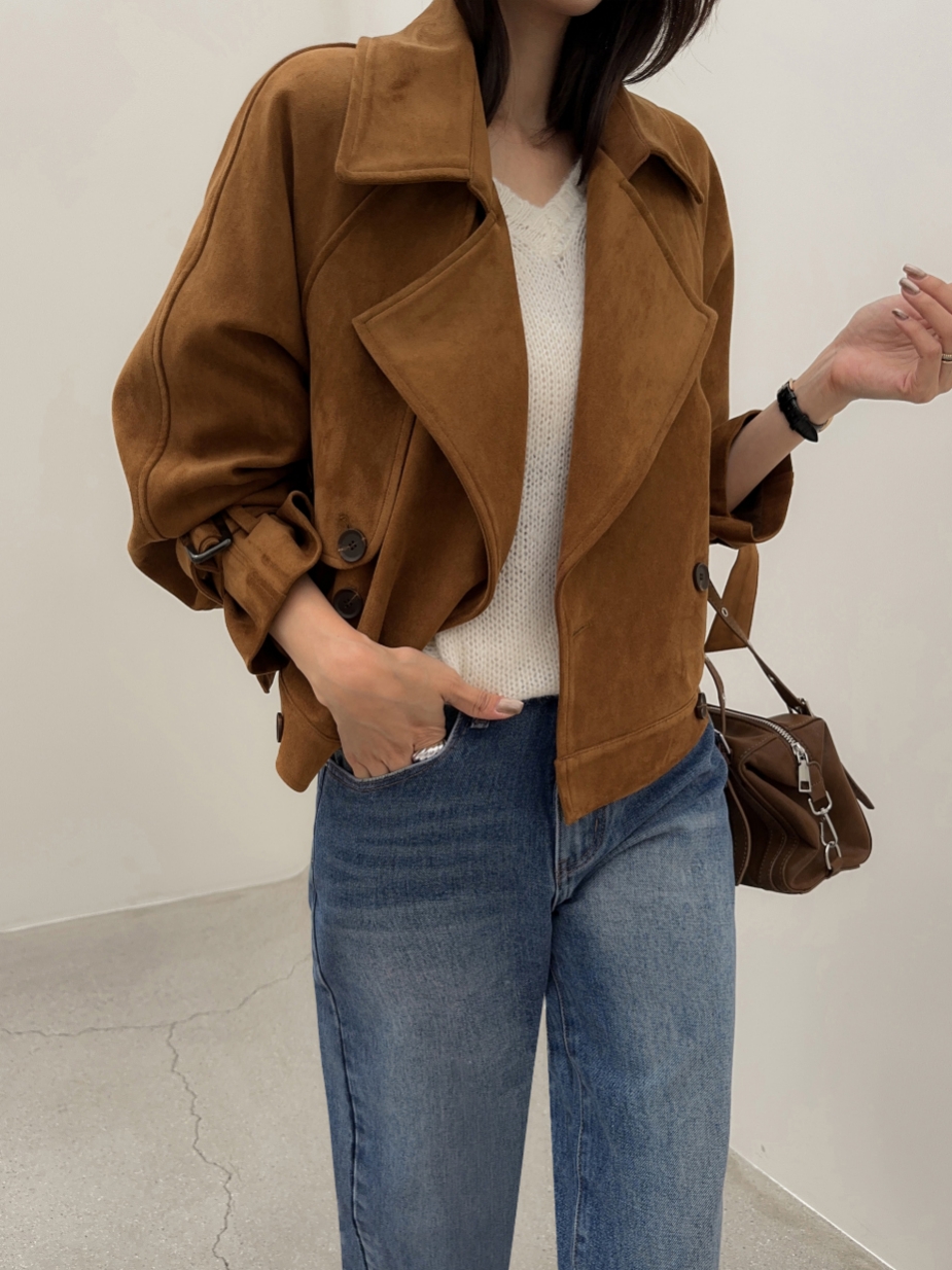 ins 韩国秋冬小众复古翻领高级感气质麂皮绒短款双排扣风衣外套