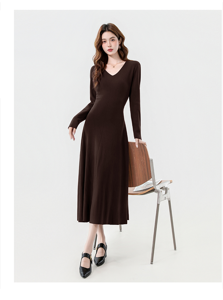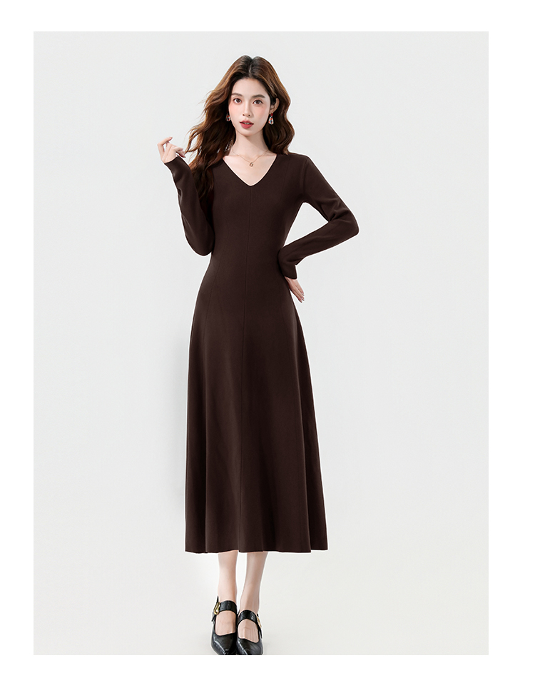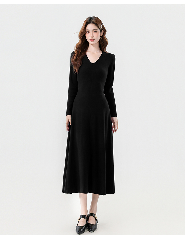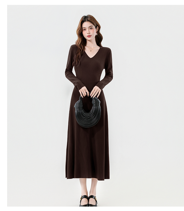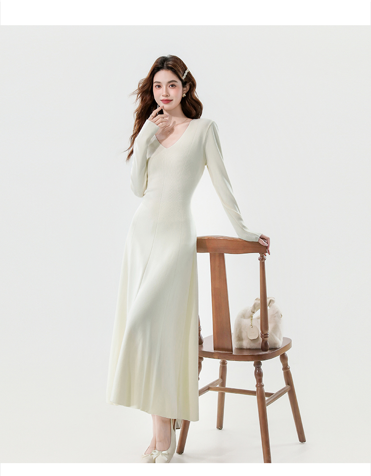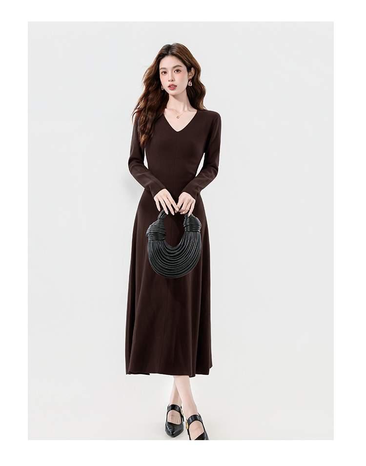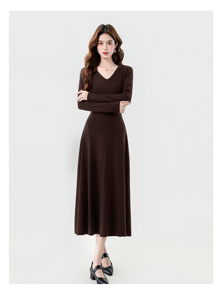实拍2025秋冬新款V领简约优雅气质百搭长款A字针织毛衣连衣裙