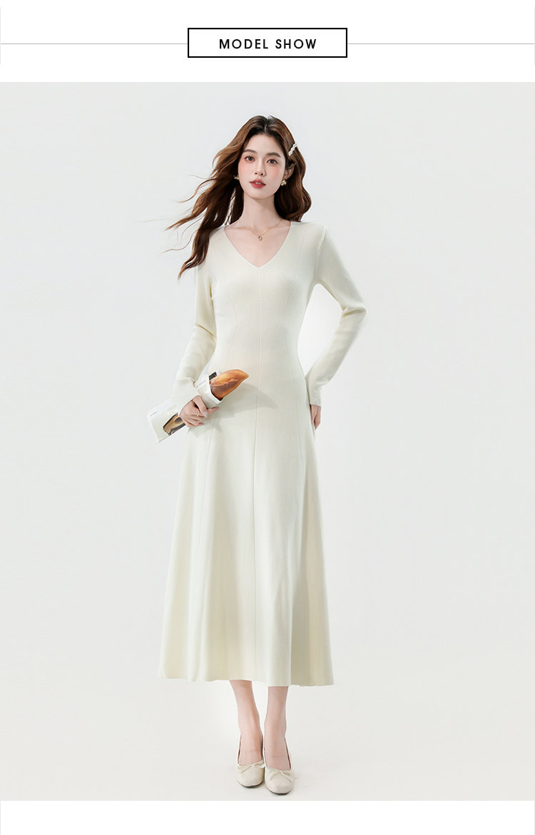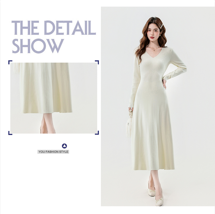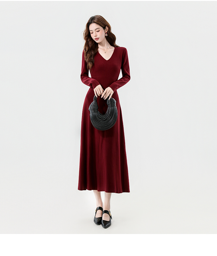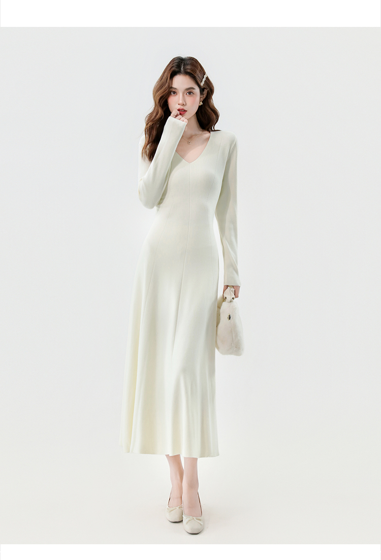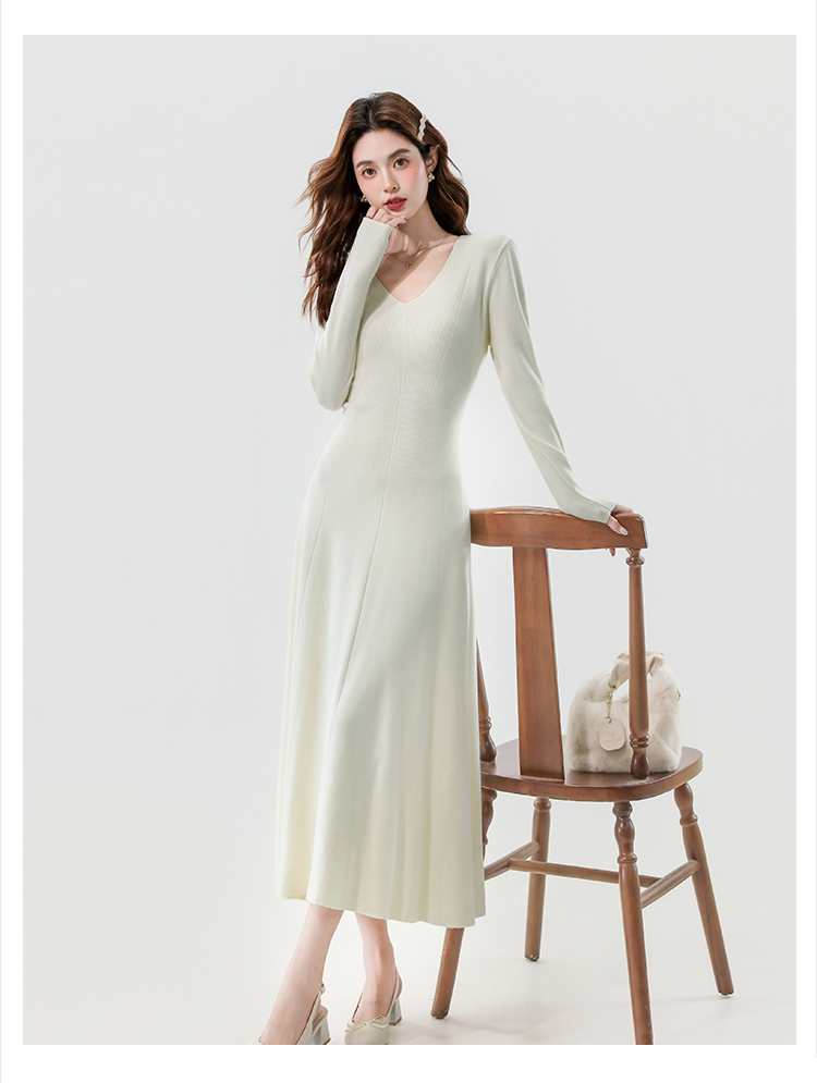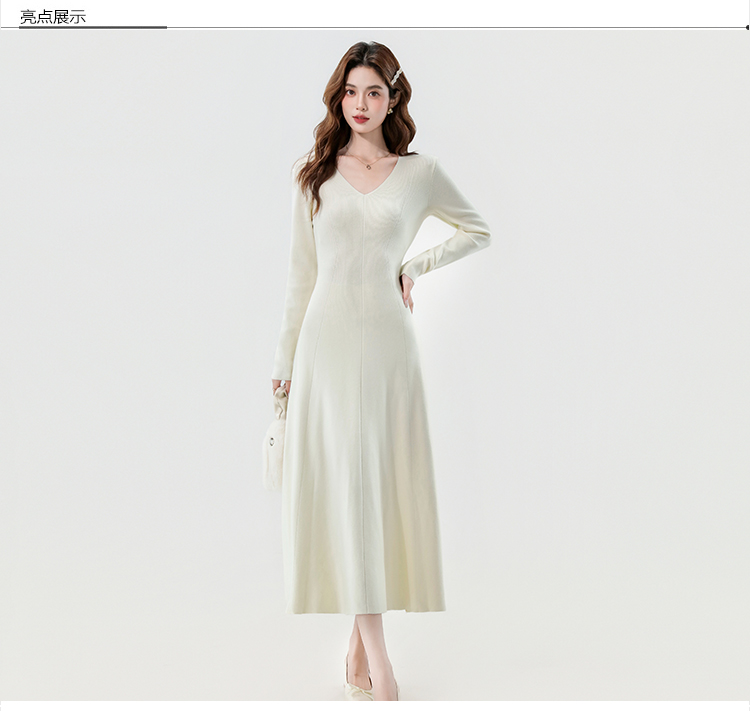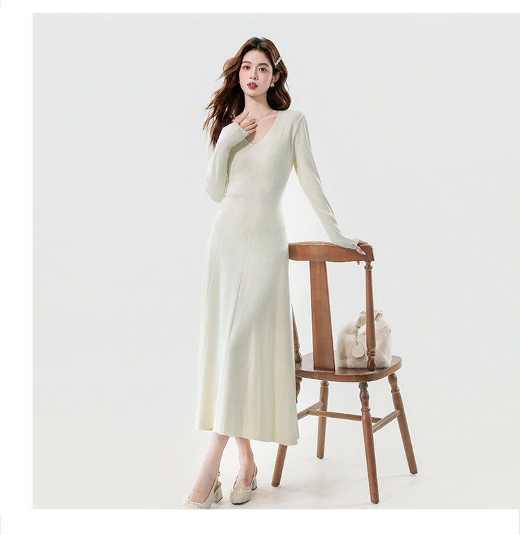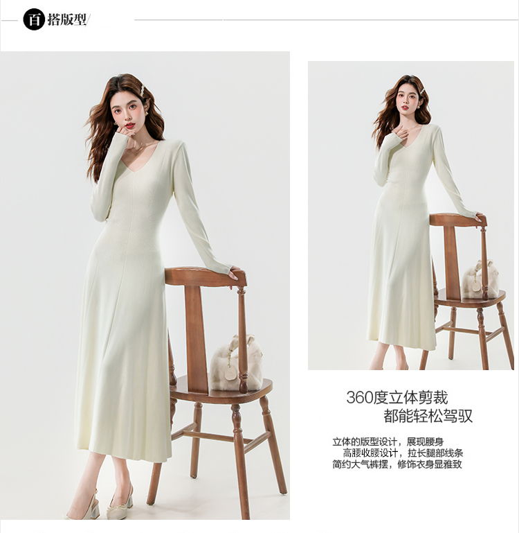 实拍2025秋冬新款V领简约优雅气质百搭长款A字针织毛衣连衣裙