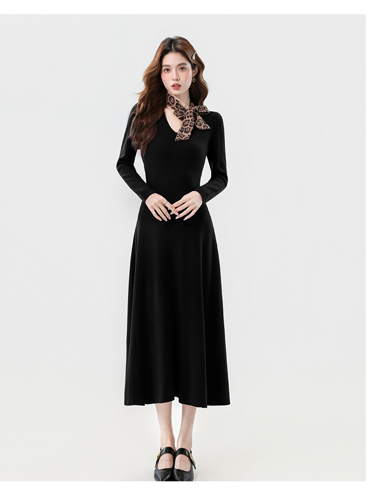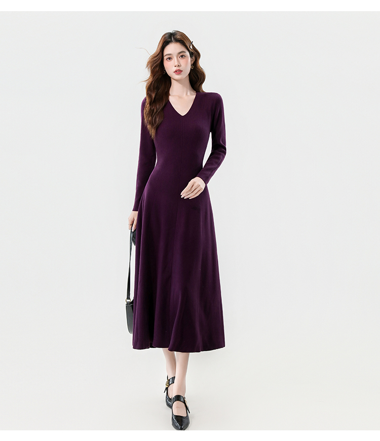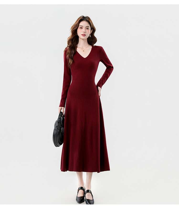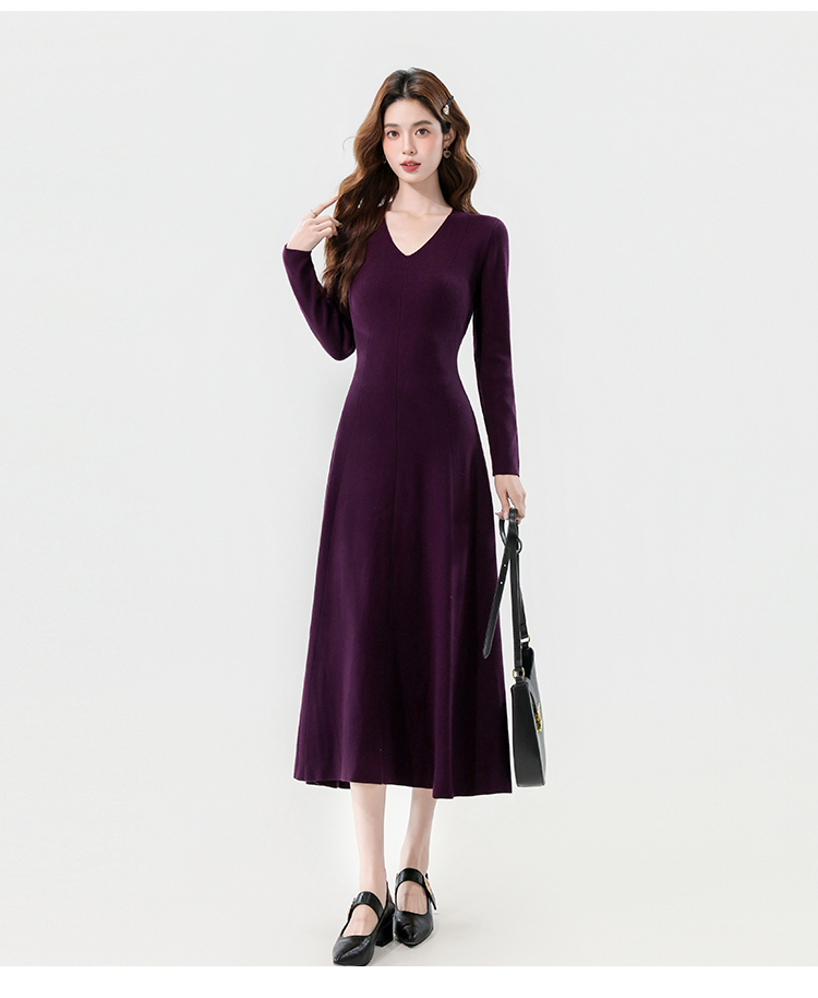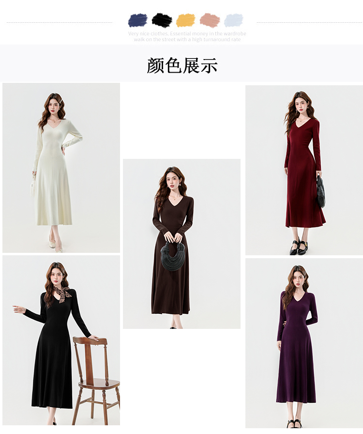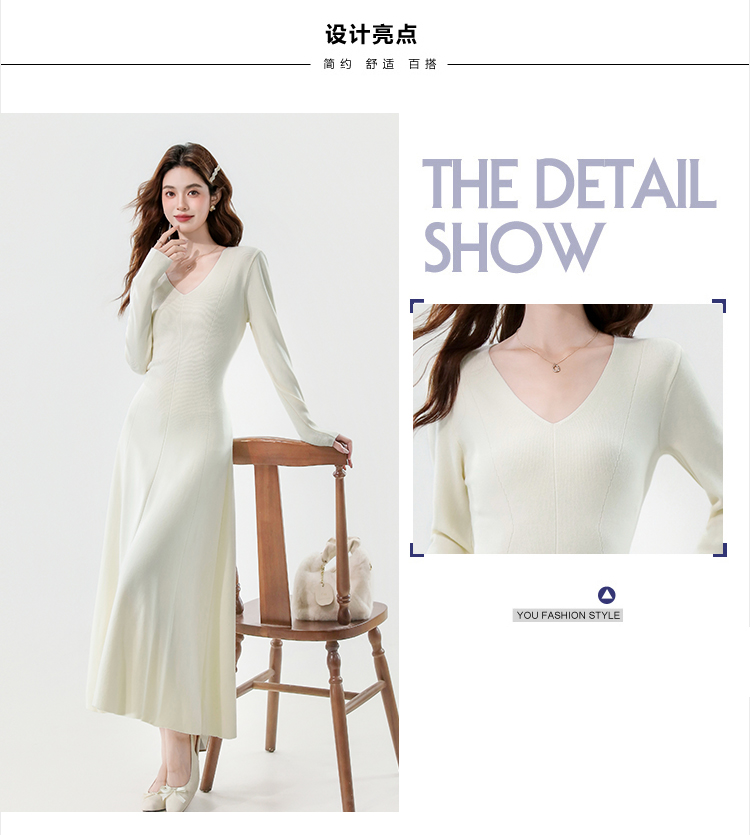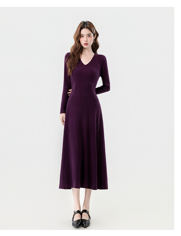 实拍2025秋冬新款V领简约优雅气质百搭长款A字针织毛衣连衣裙