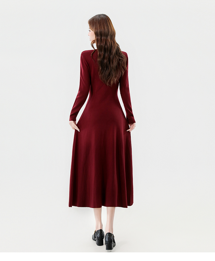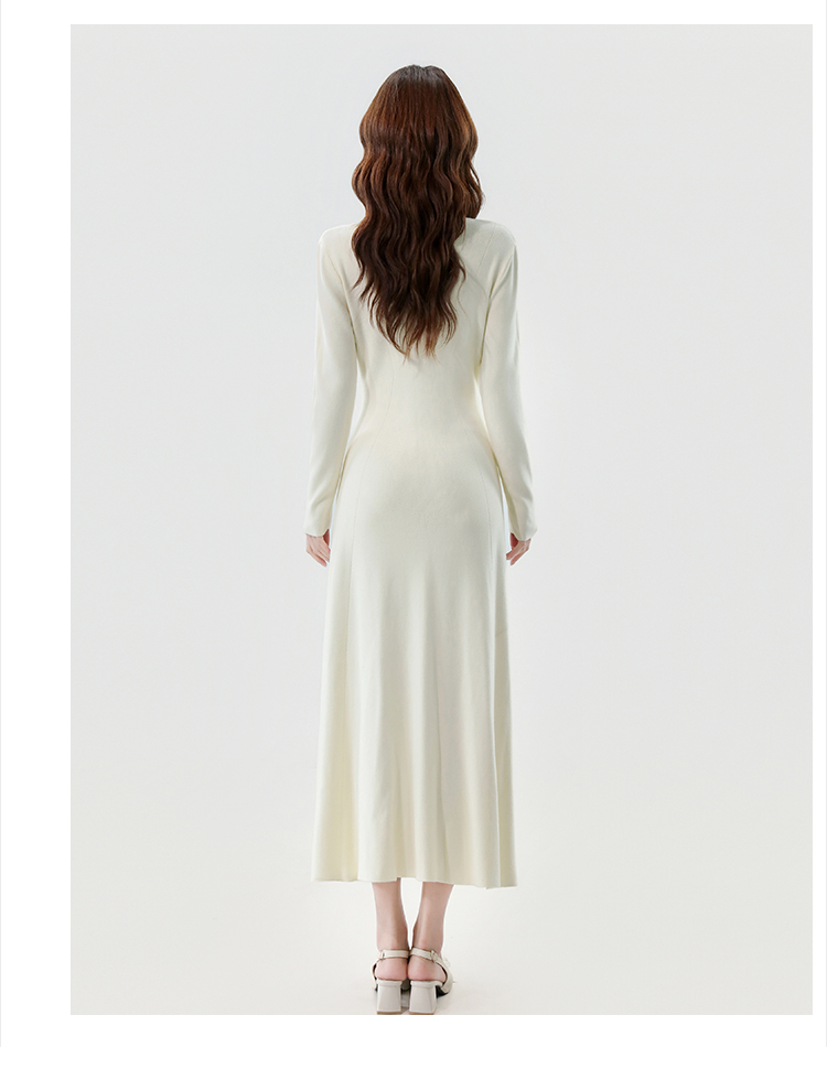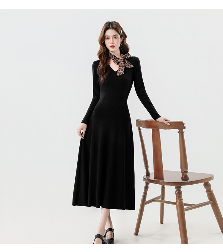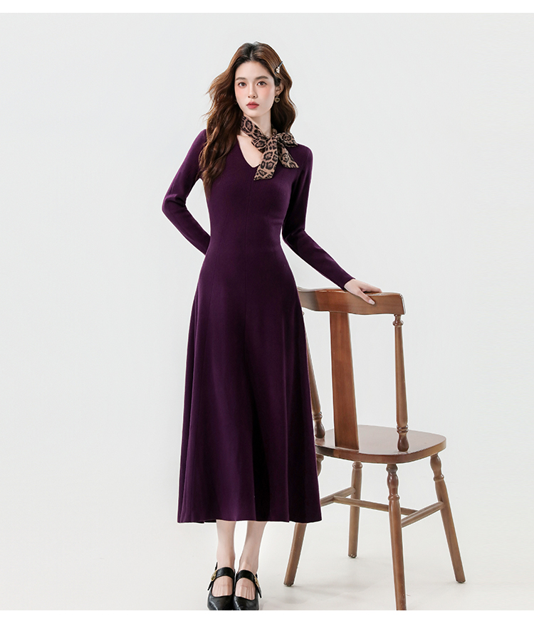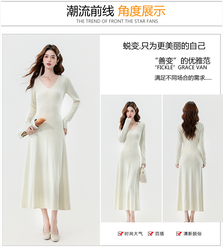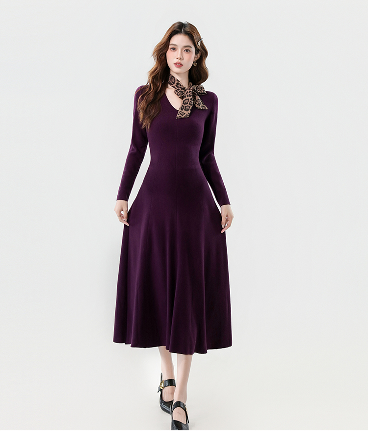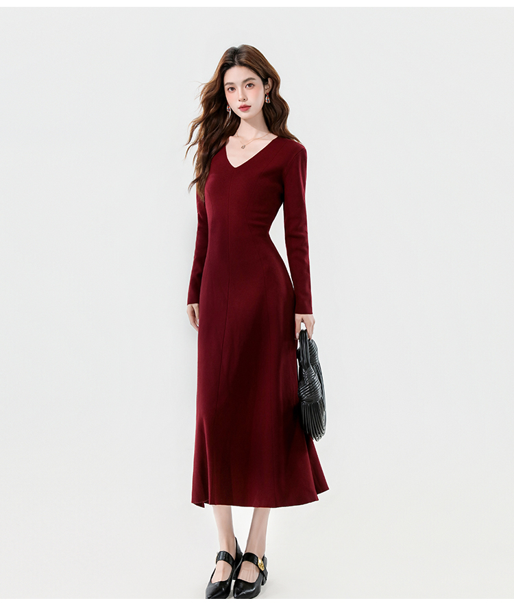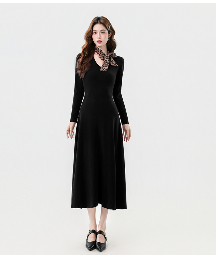 实拍2025秋冬新款V领简约优雅气质百搭长款A字针织毛衣连衣裙
