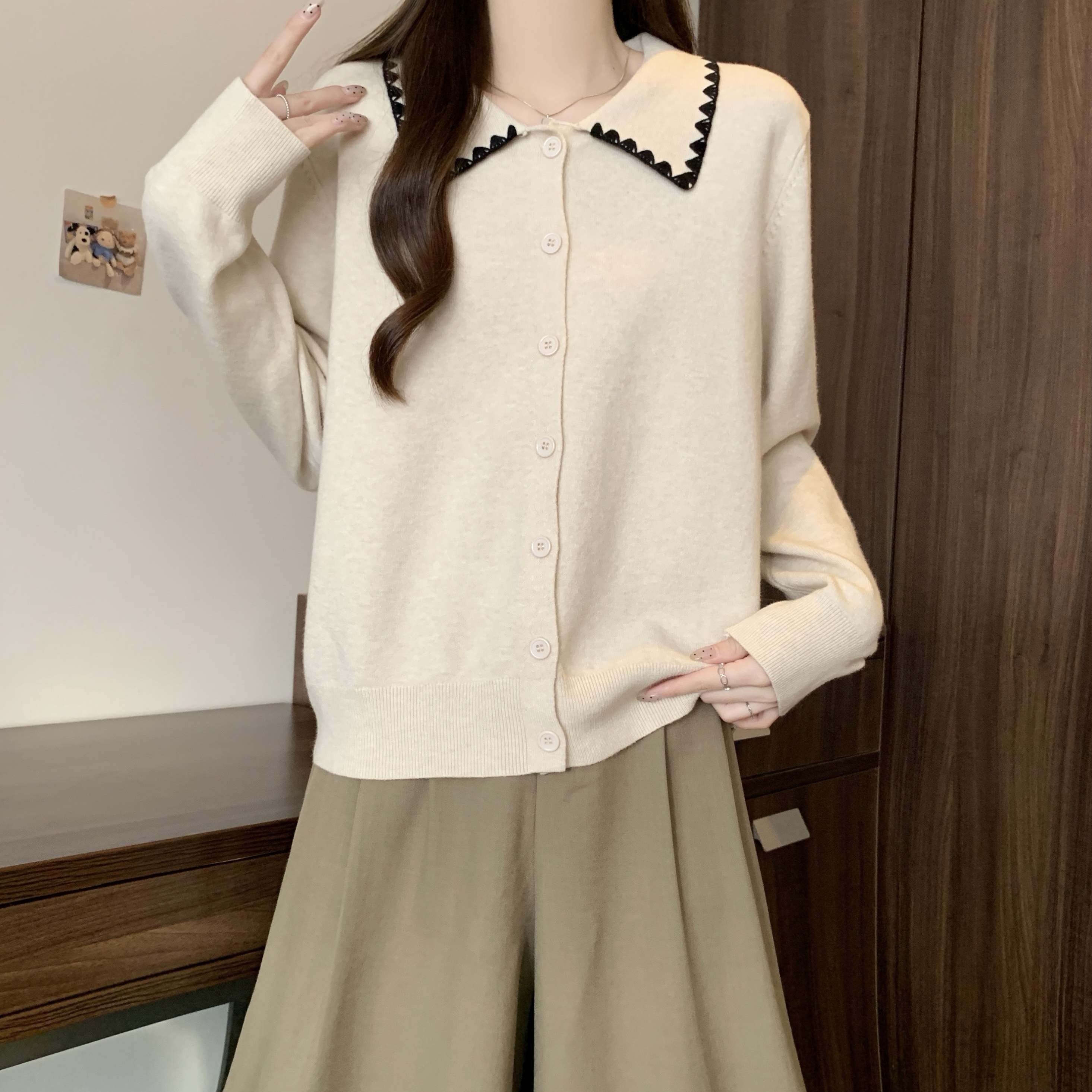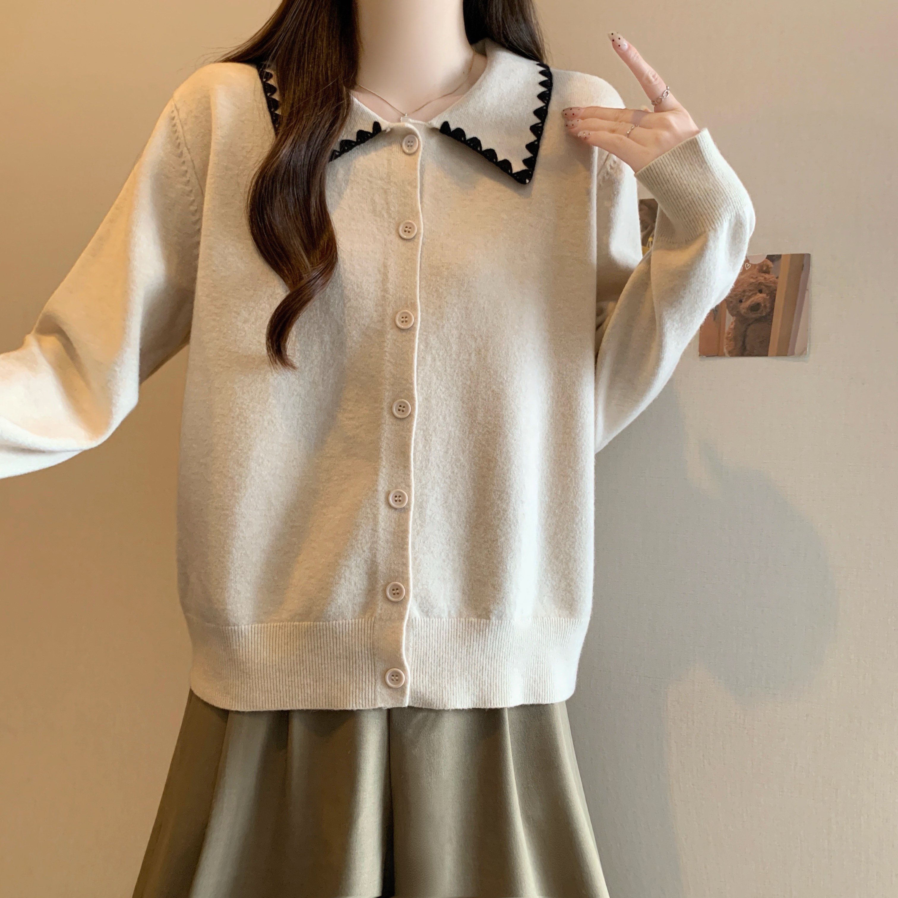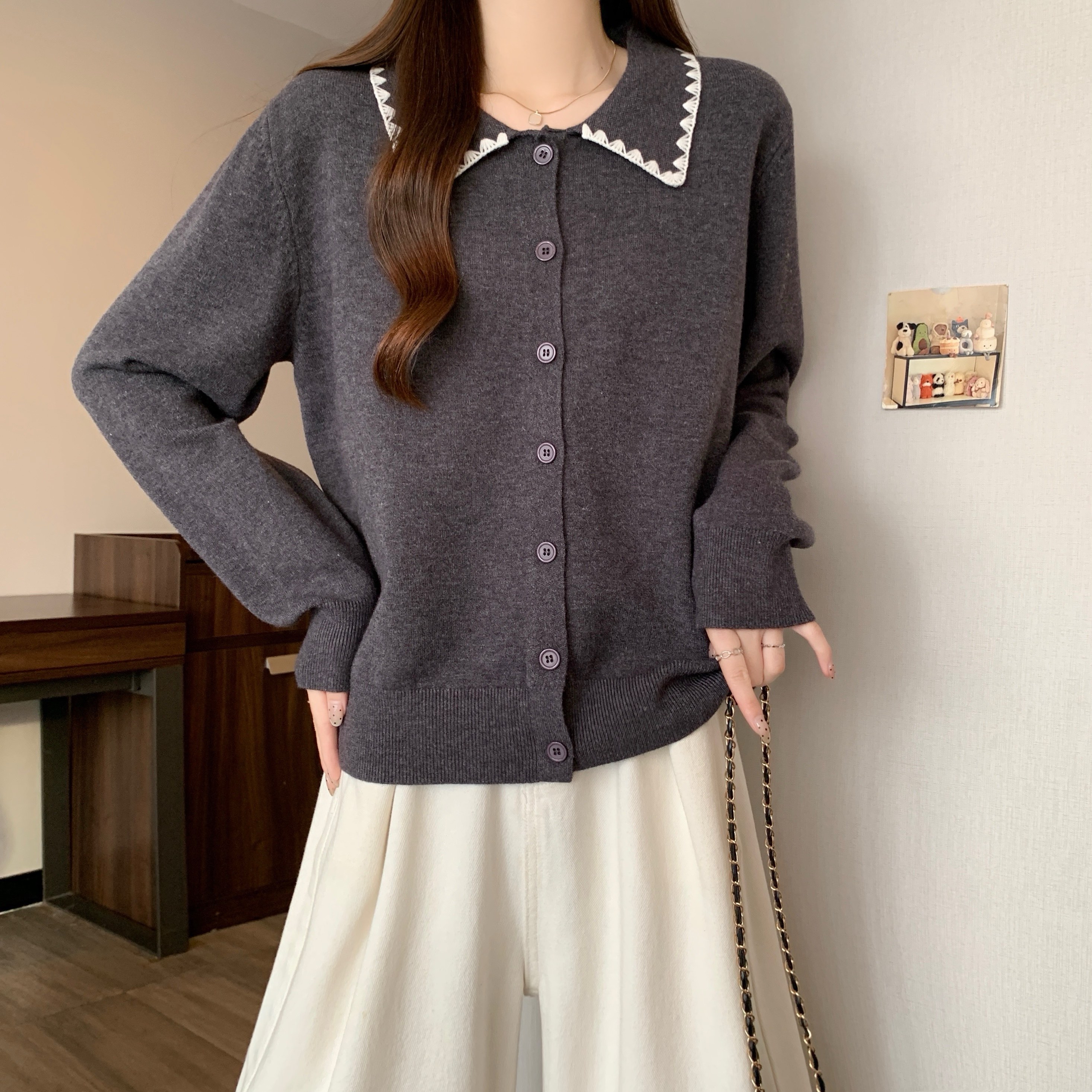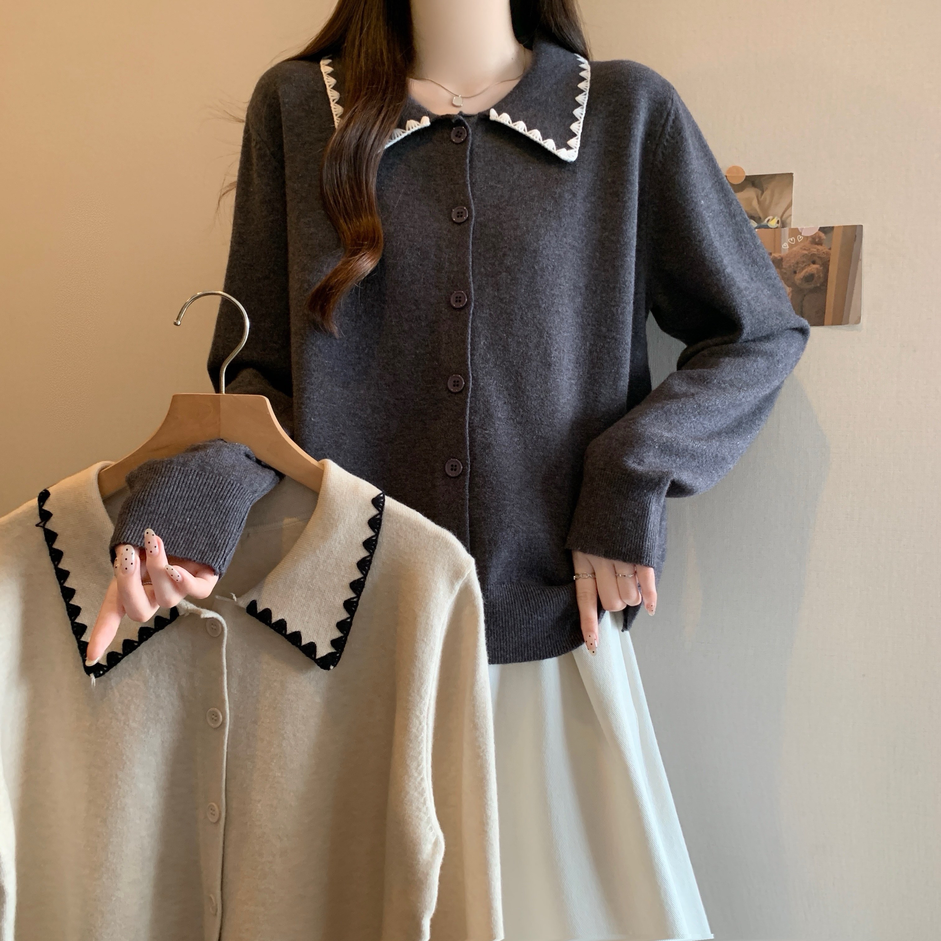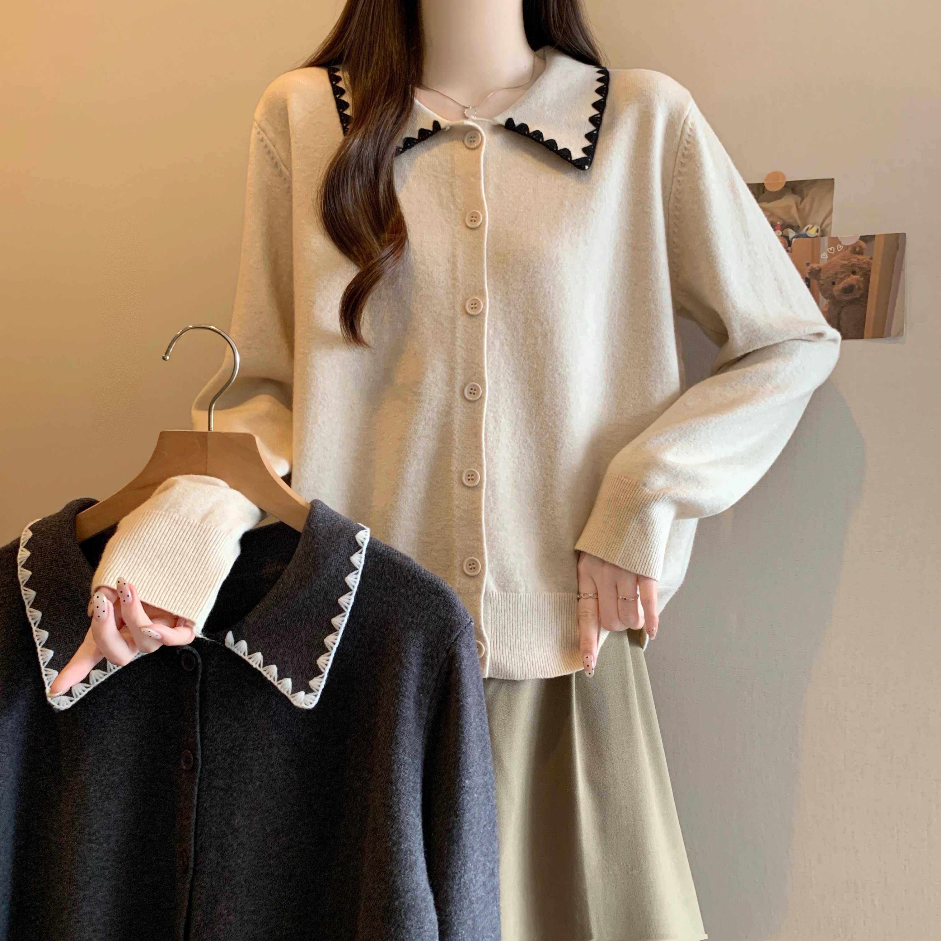 实拍大码小香风娃娃领长袖针织开衫女秋冬胖MM宽松显瘦毛衣外套
