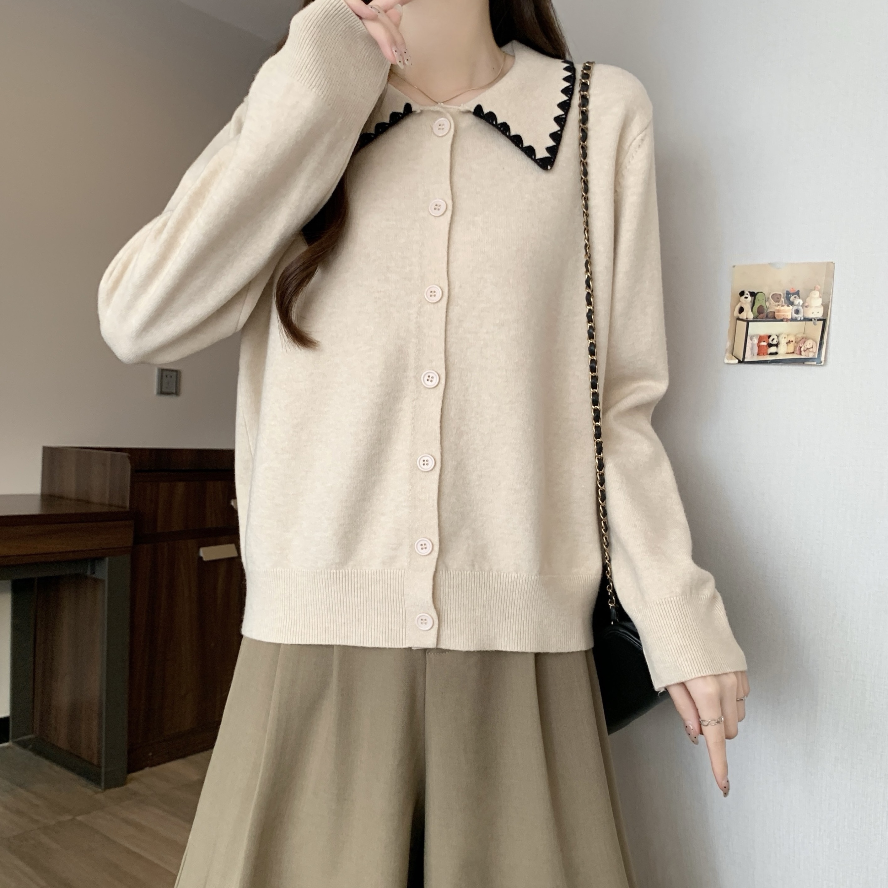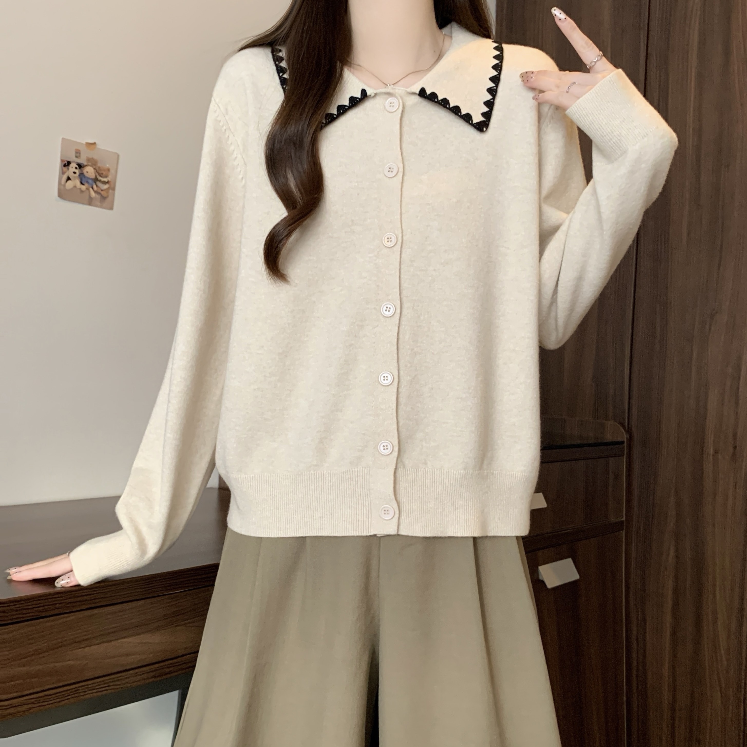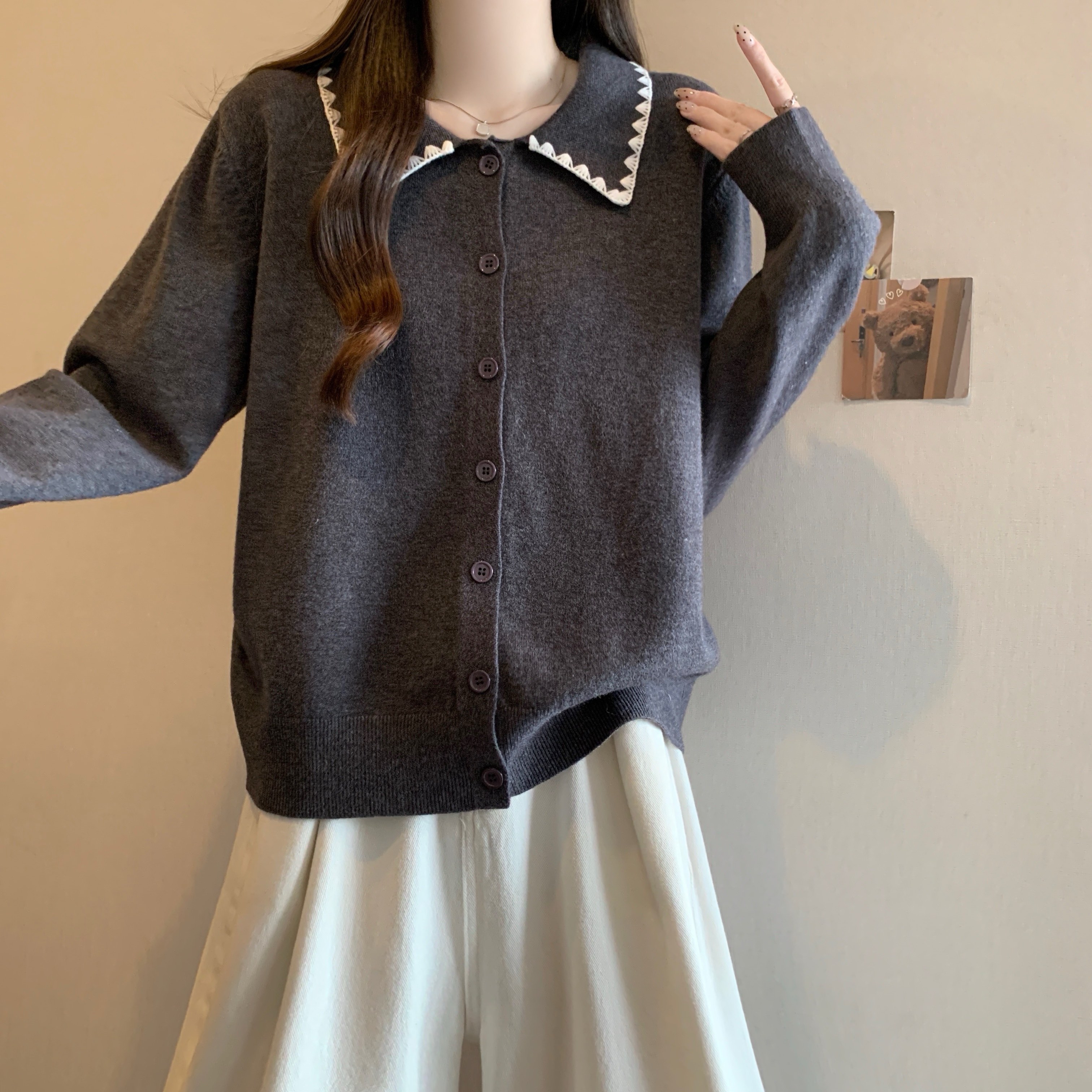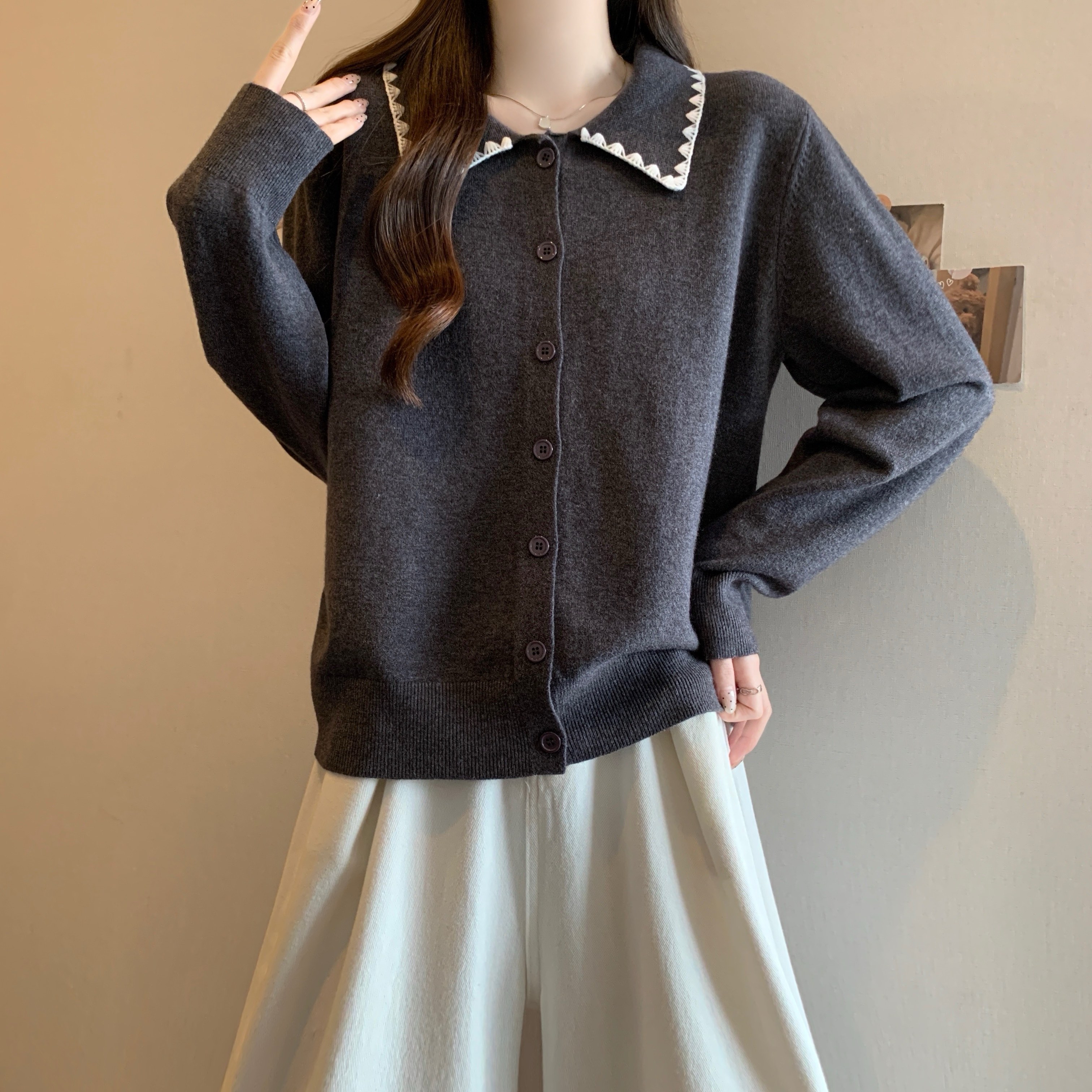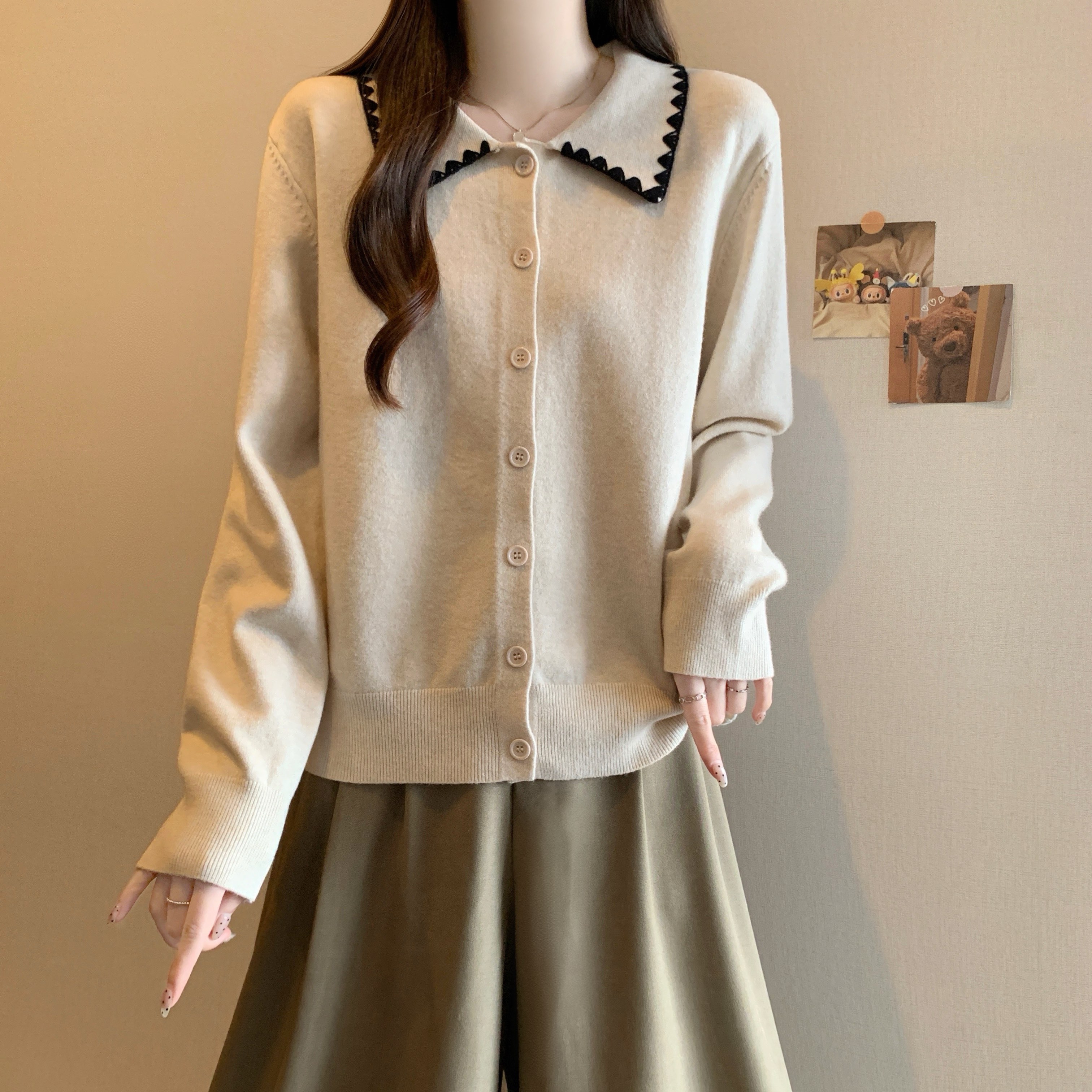 实拍大码小香风娃娃领长袖针织开衫女秋冬胖MM宽松显瘦毛衣外套