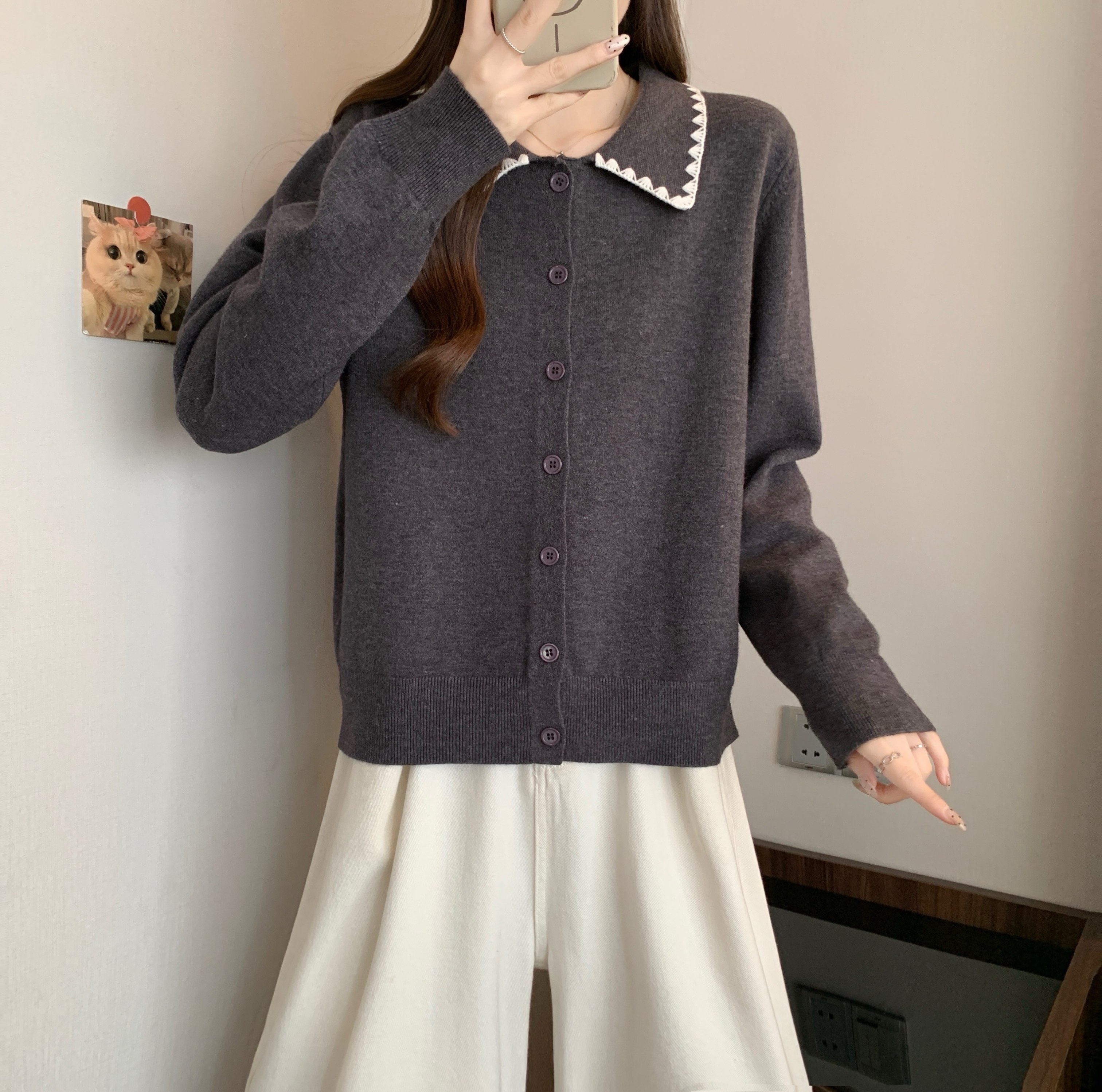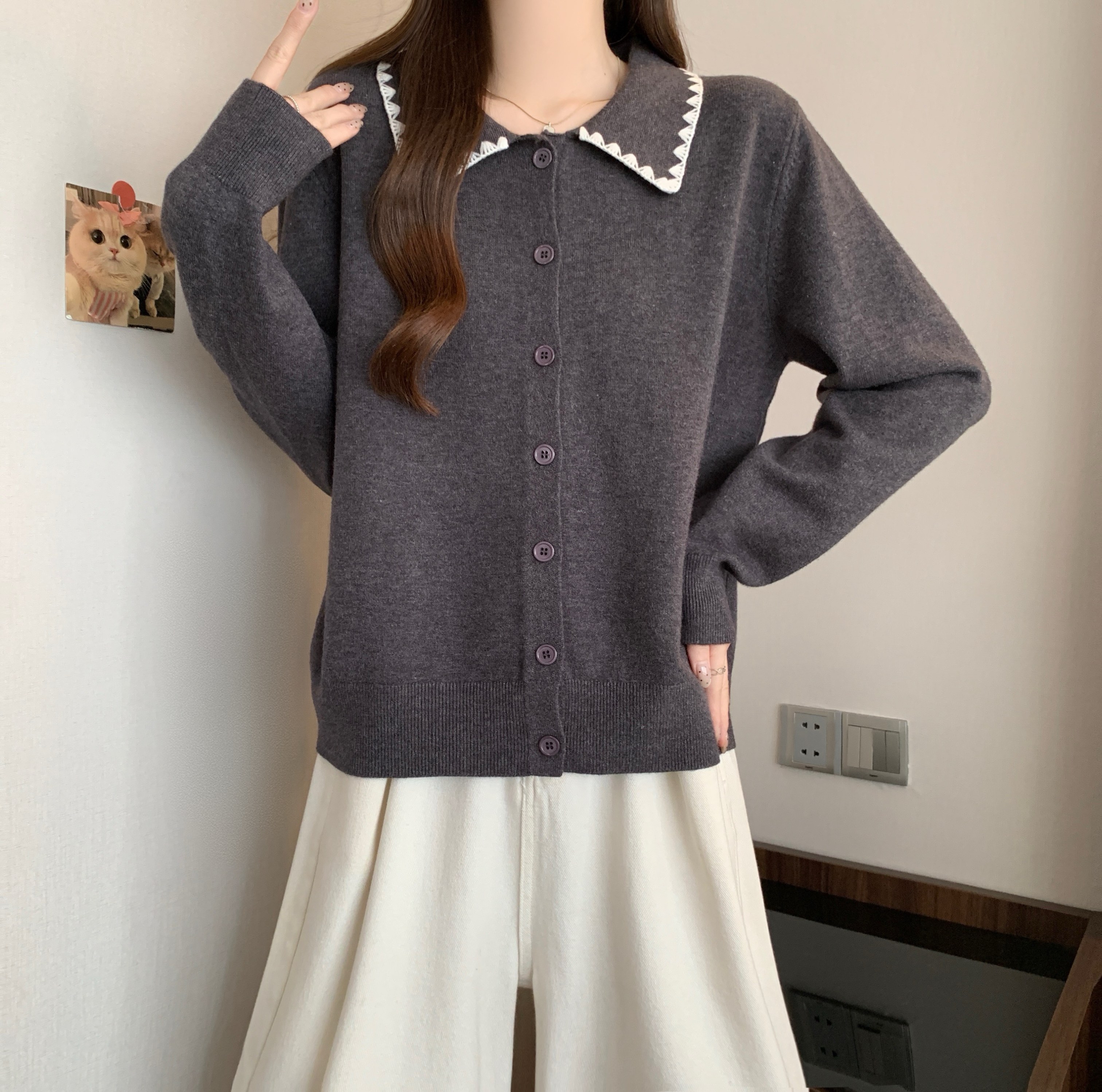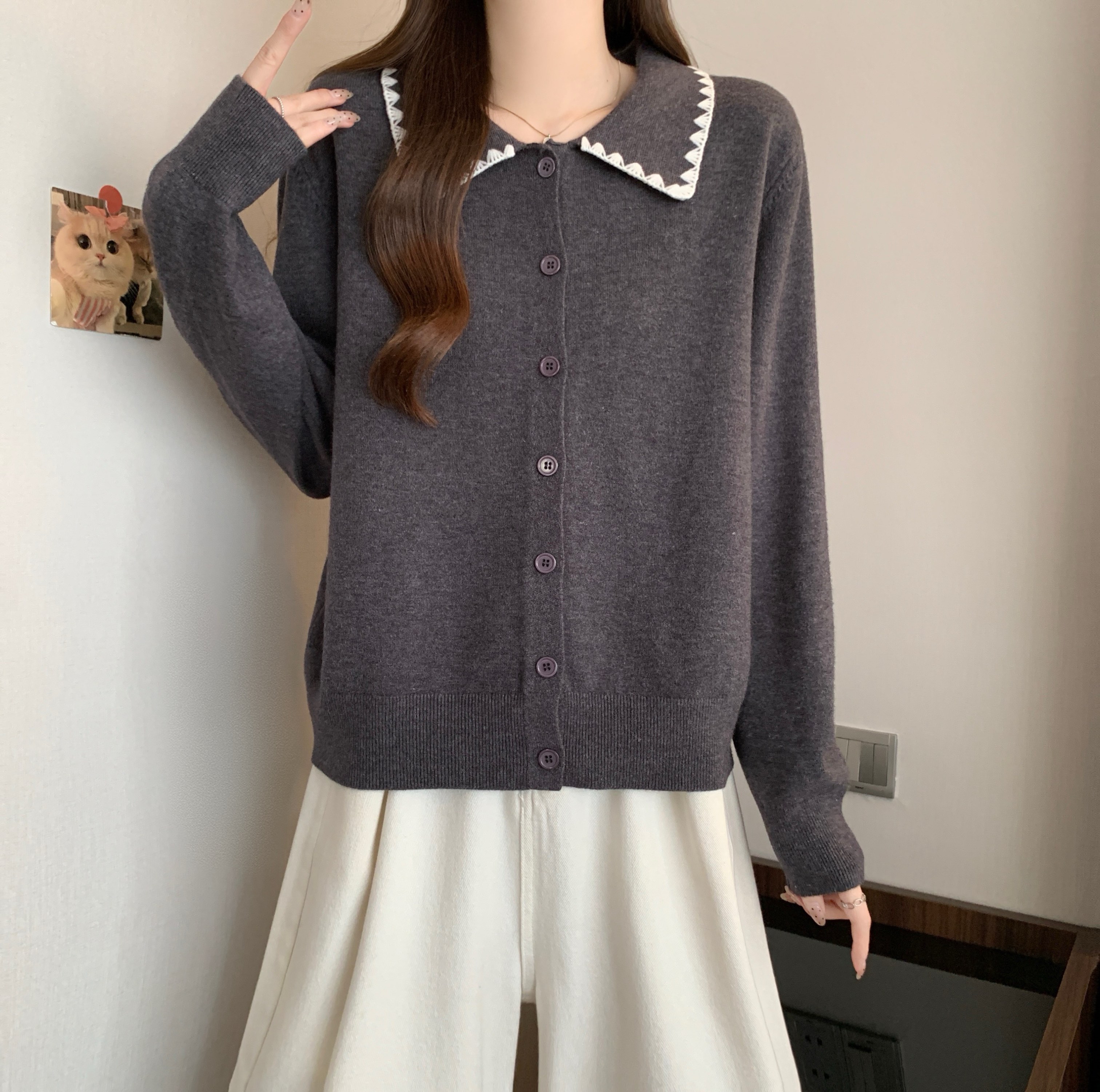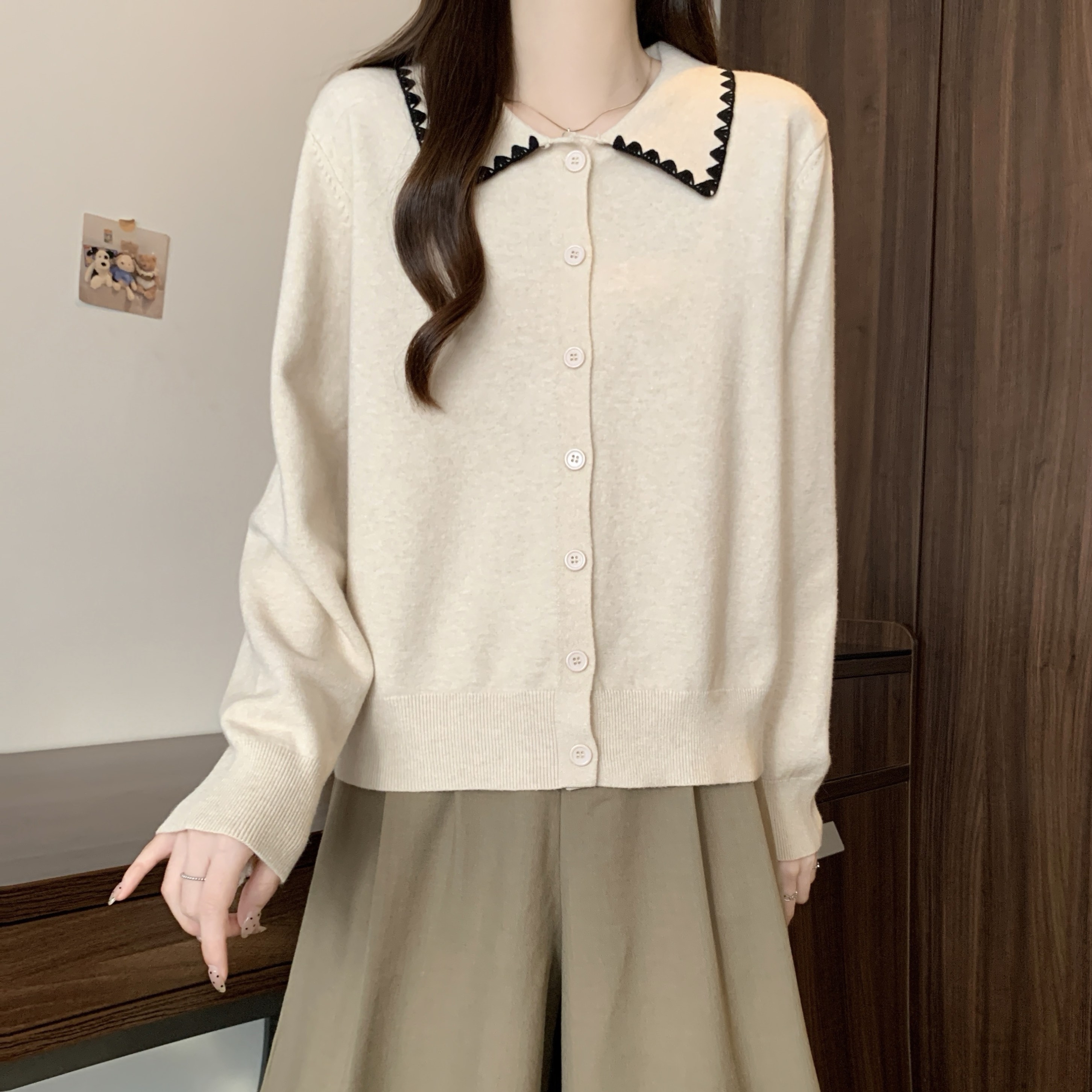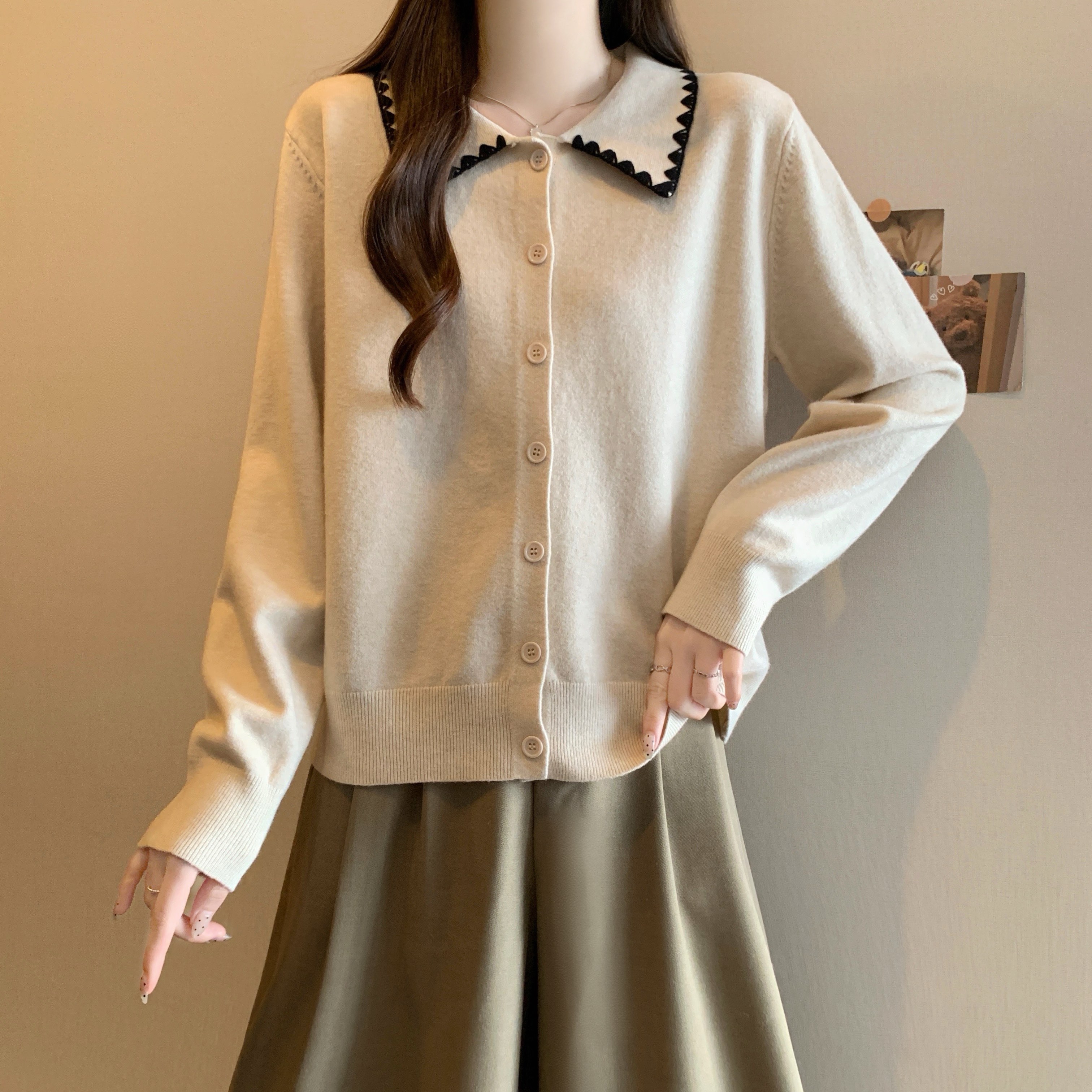 实拍大码小香风娃娃领长袖针织开衫女秋冬胖MM宽松显瘦毛衣外套