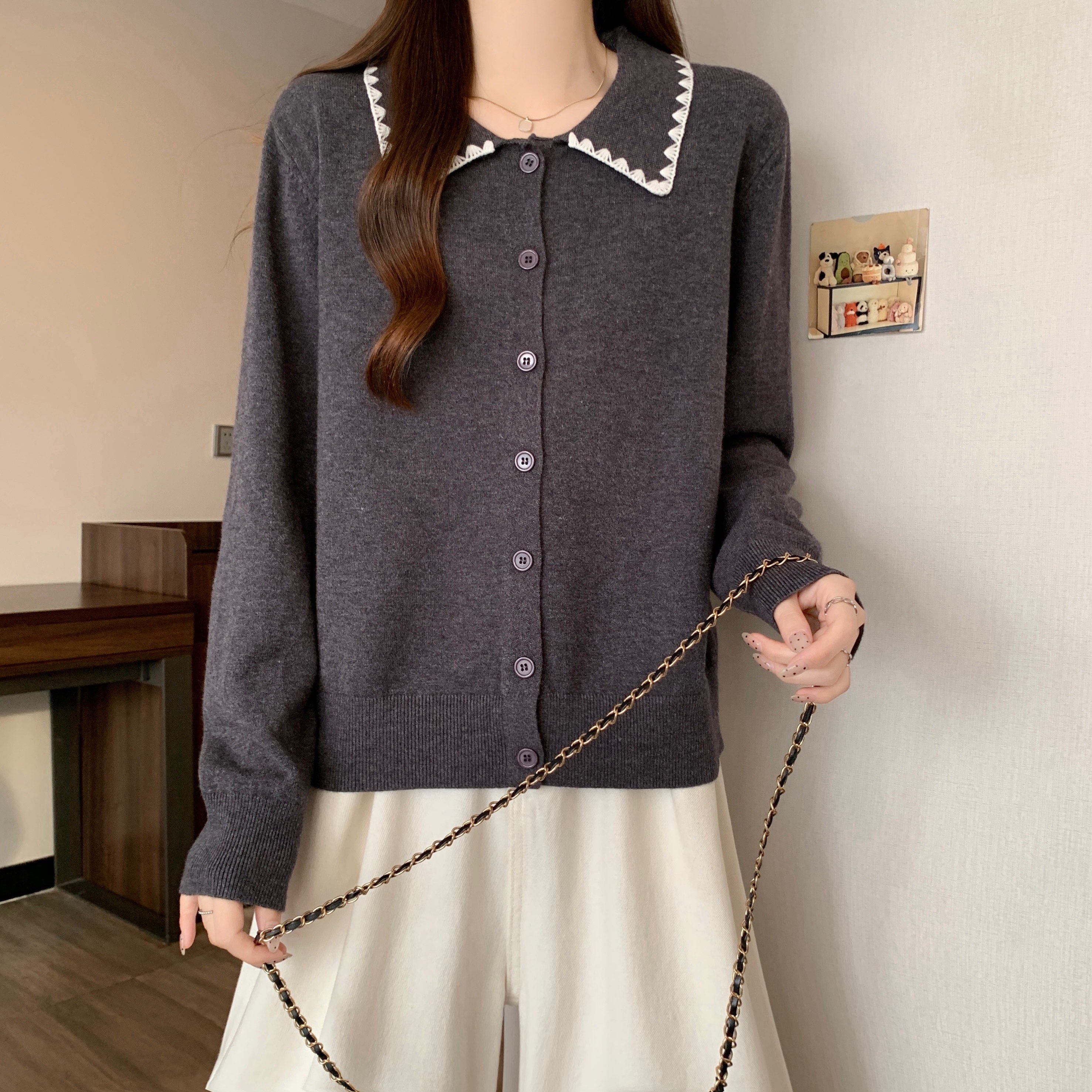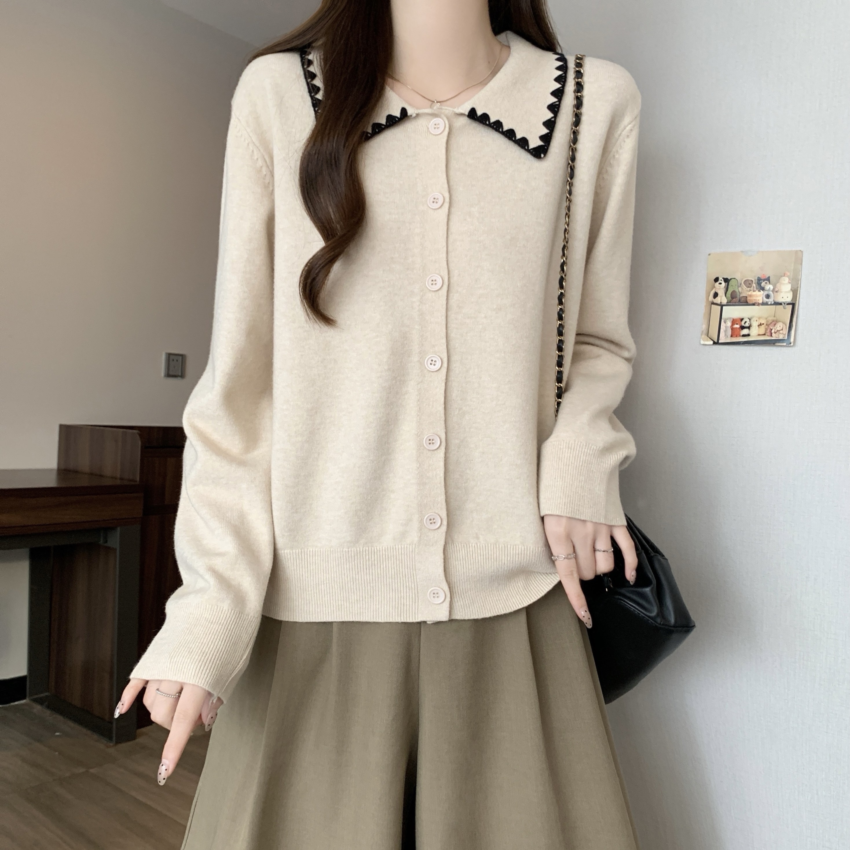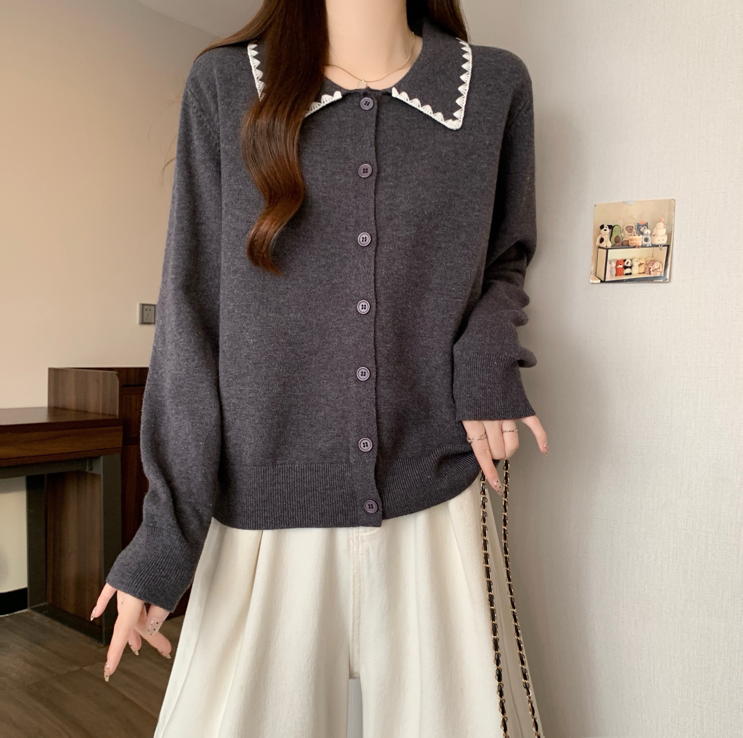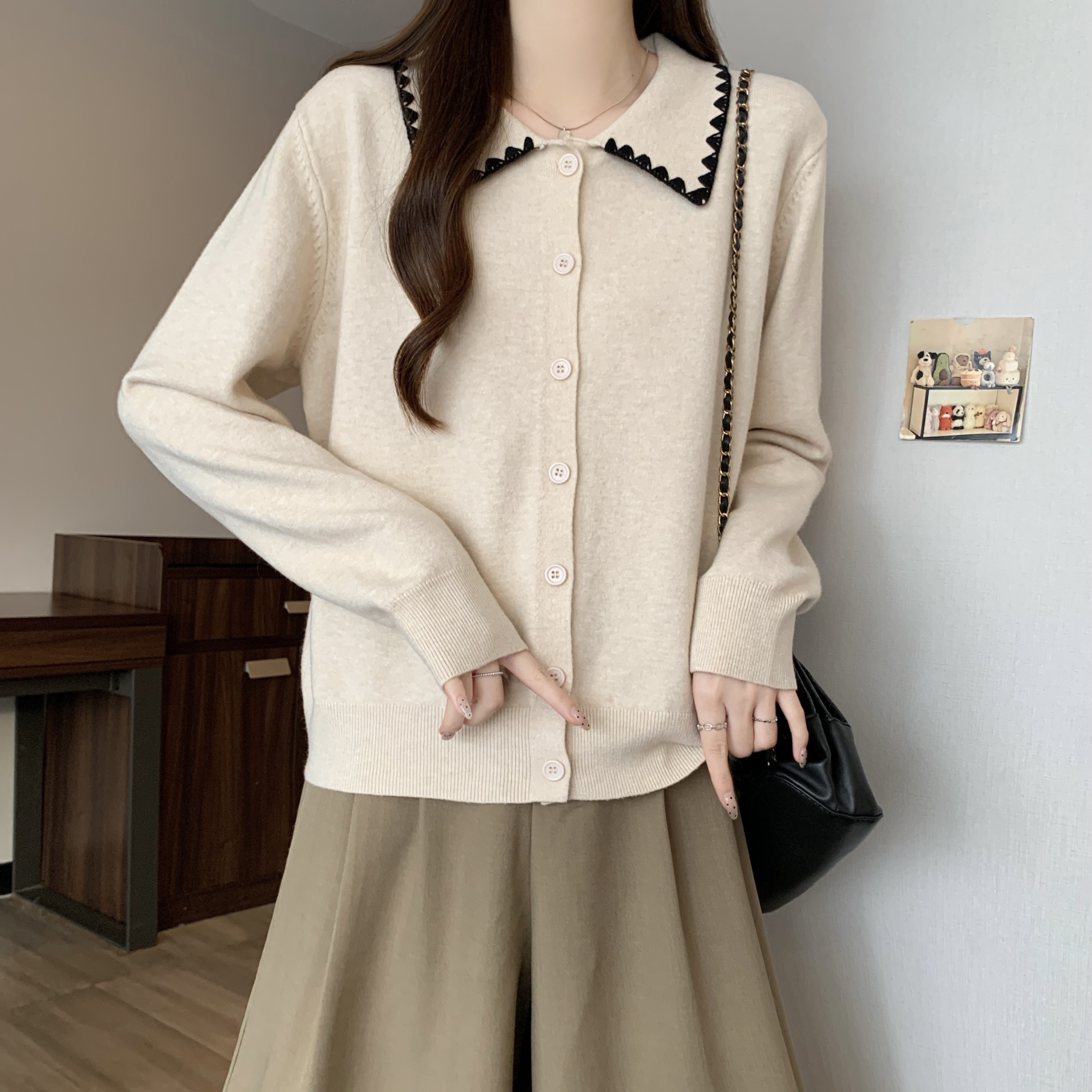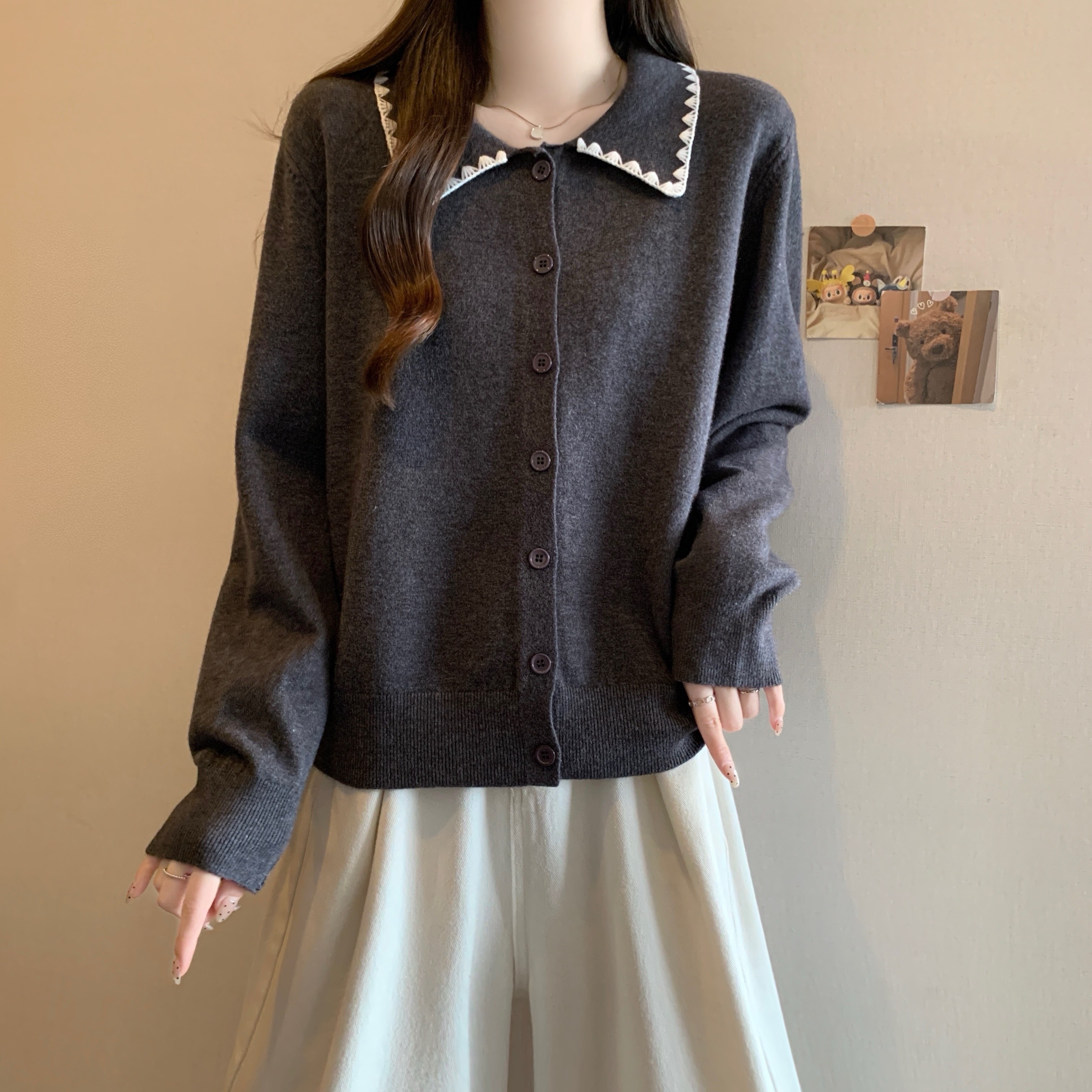 实拍大码小香风娃娃领长袖针织开衫女秋冬胖MM宽松显瘦毛衣外套
