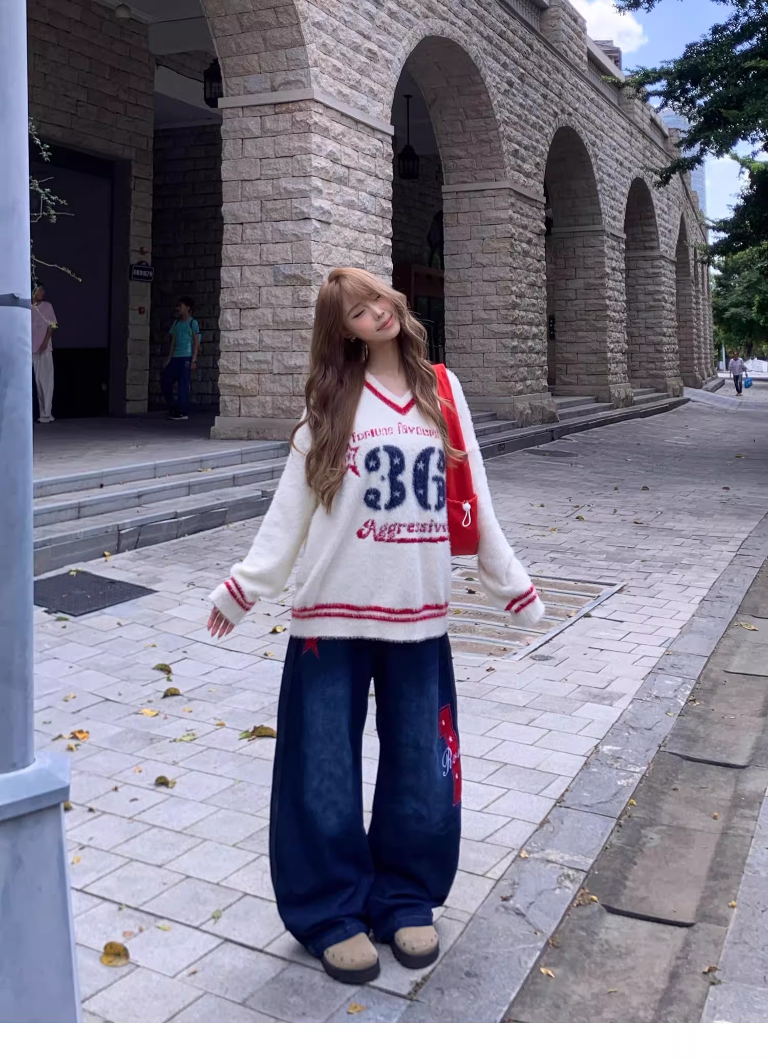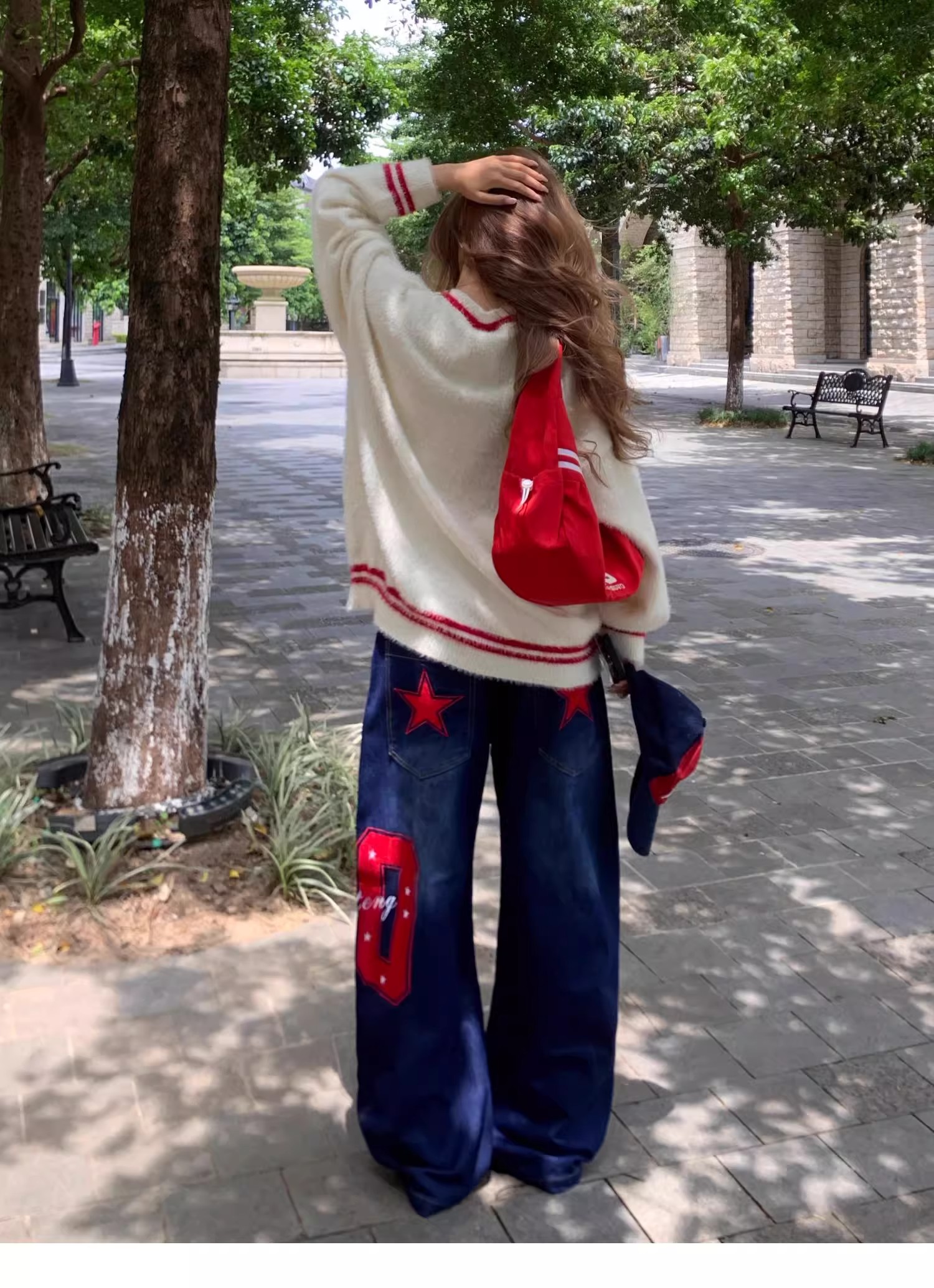 刺绣美式复古刺绣星星弯刀牛仔裤女2025春秋新款显瘦阔腿长裤子