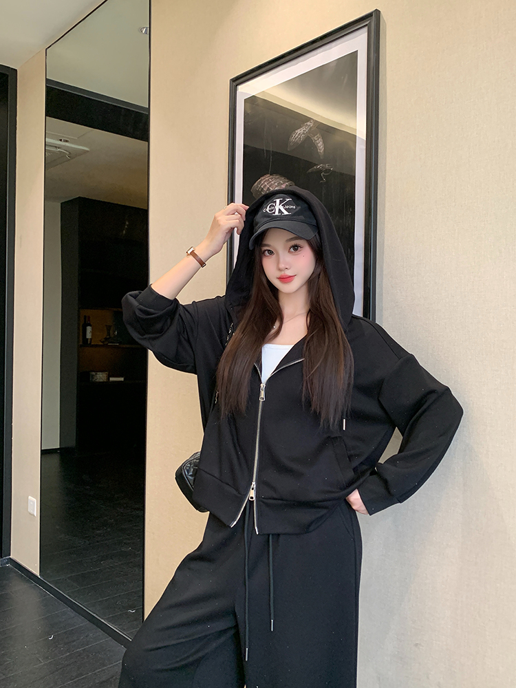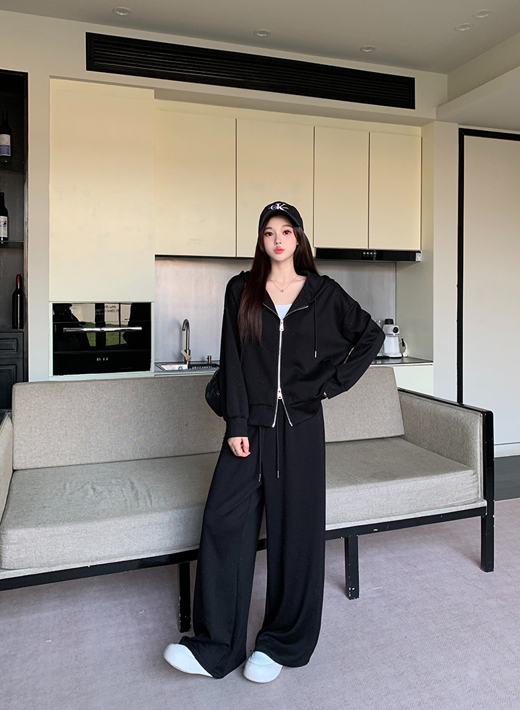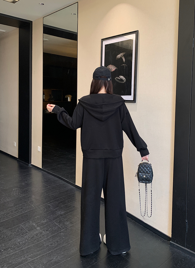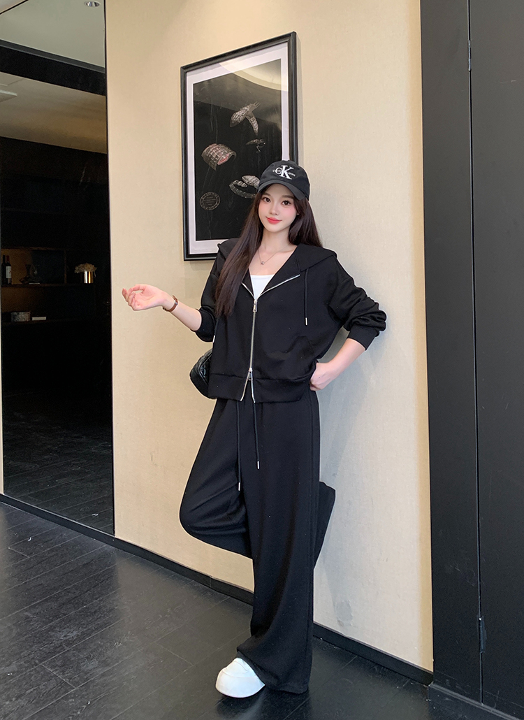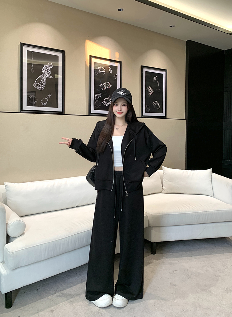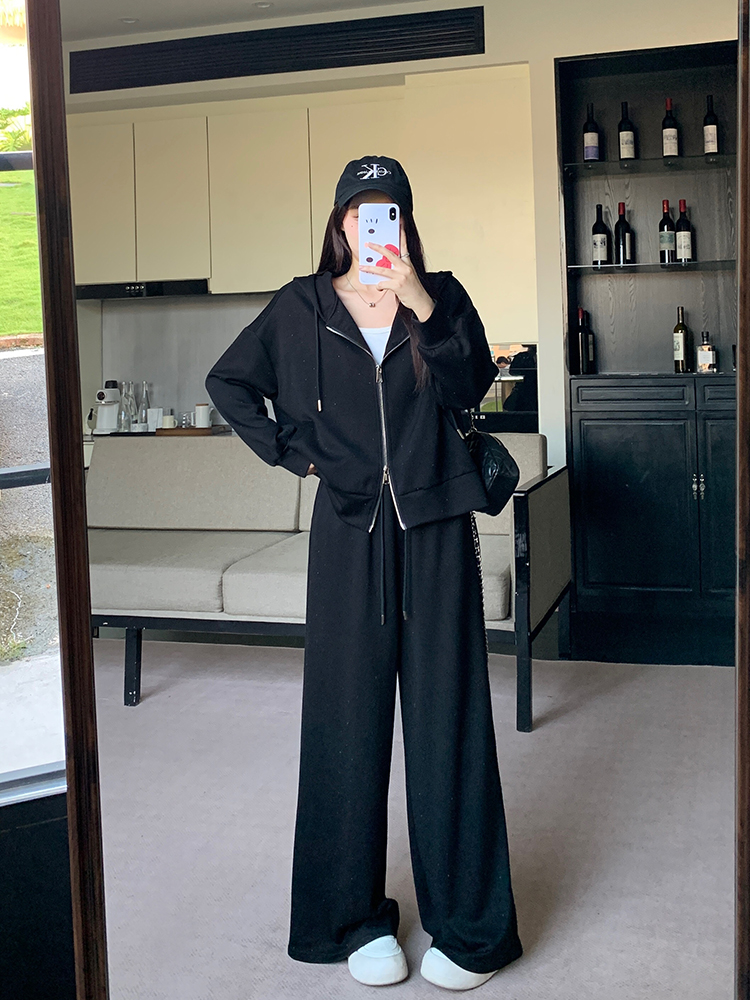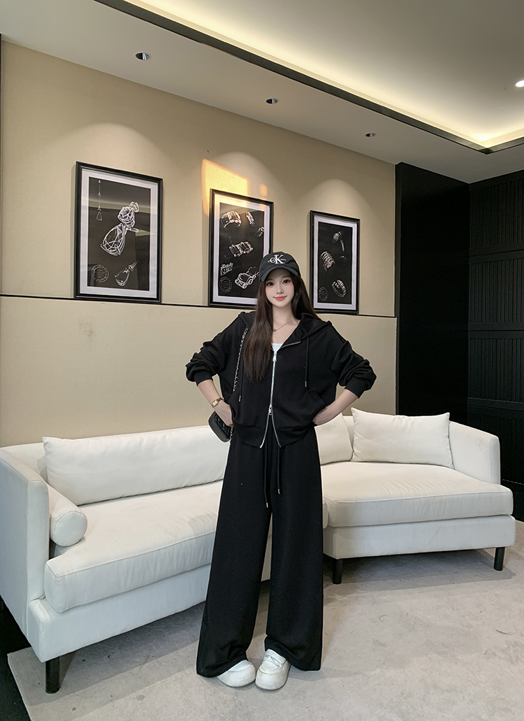 实拍大码女装韩版时尚显瘦连帽卫衣开衫外套直筒休闲阔腿裤套装
