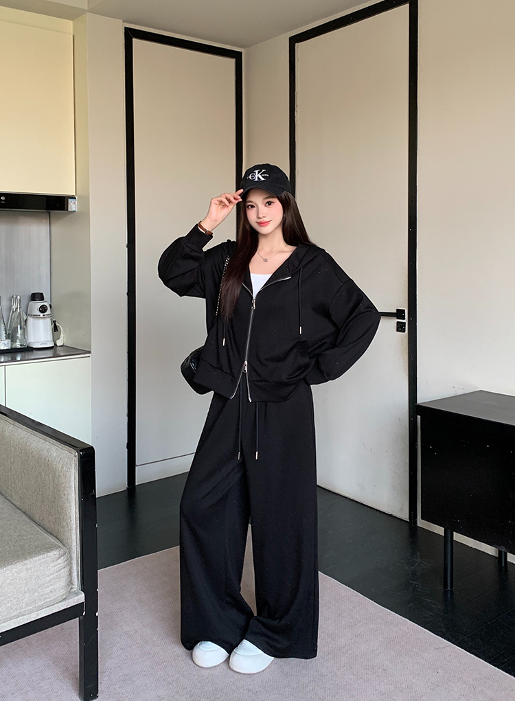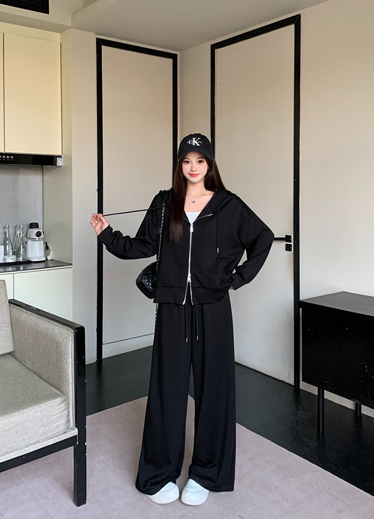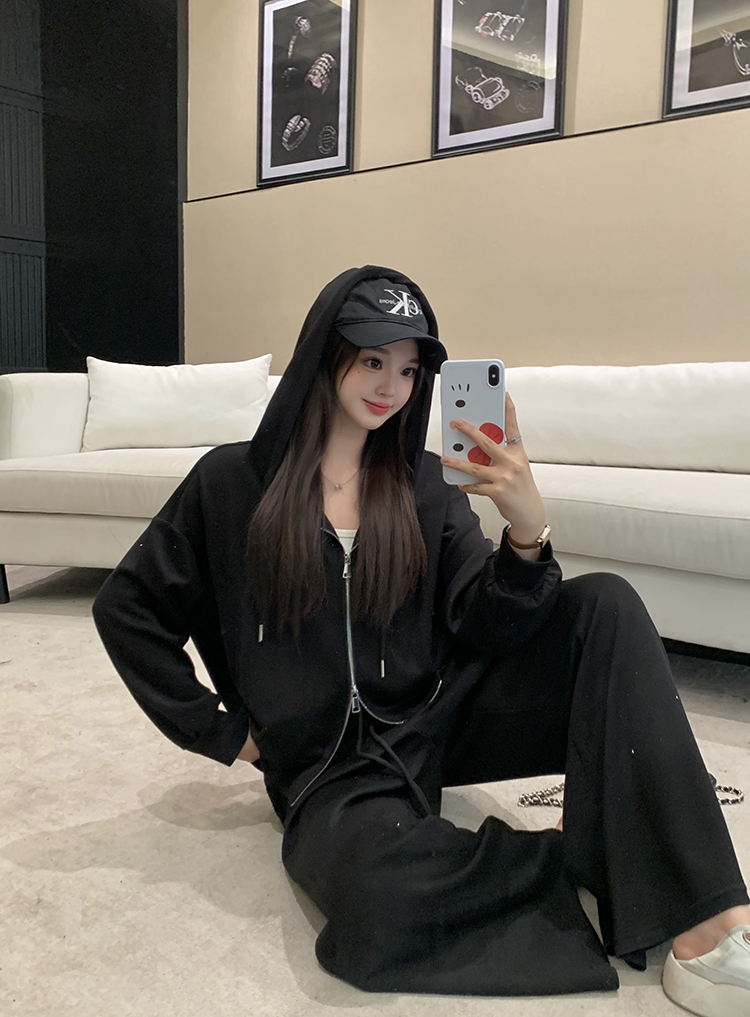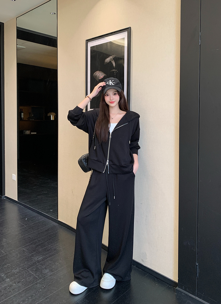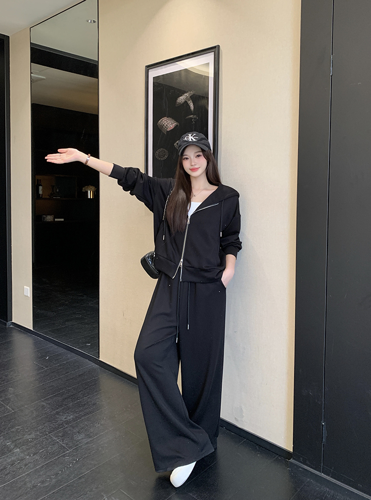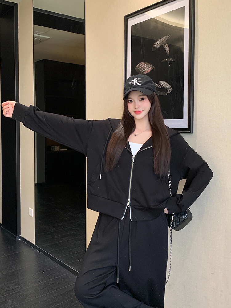 实拍大码女装韩版时尚显瘦连帽卫衣开衫外套直筒休闲阔腿裤套装