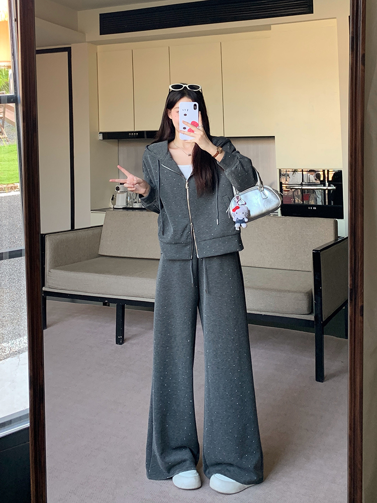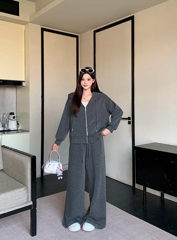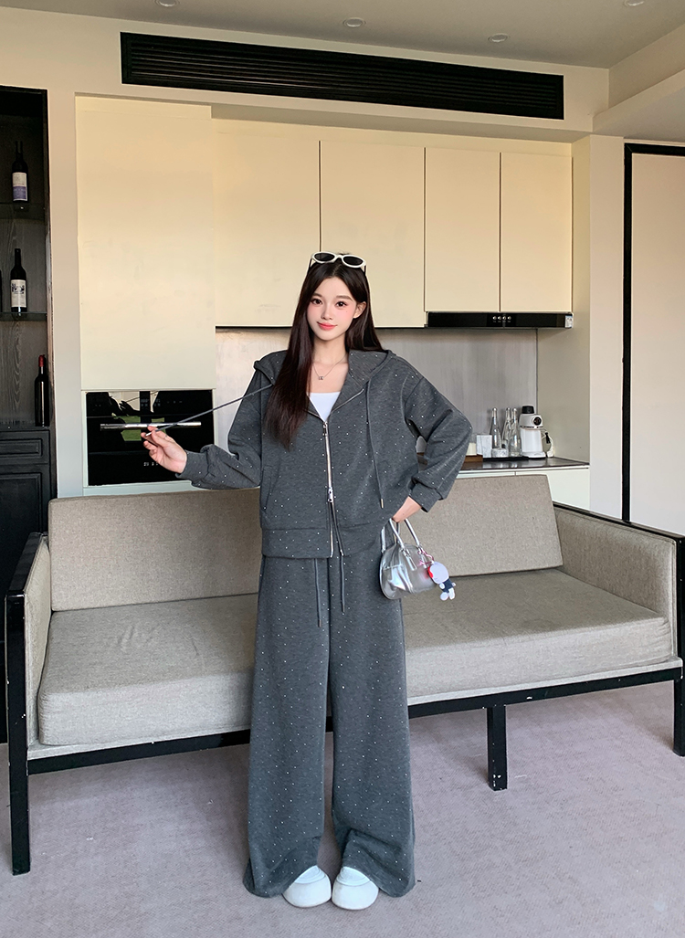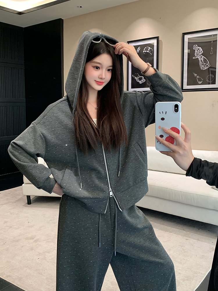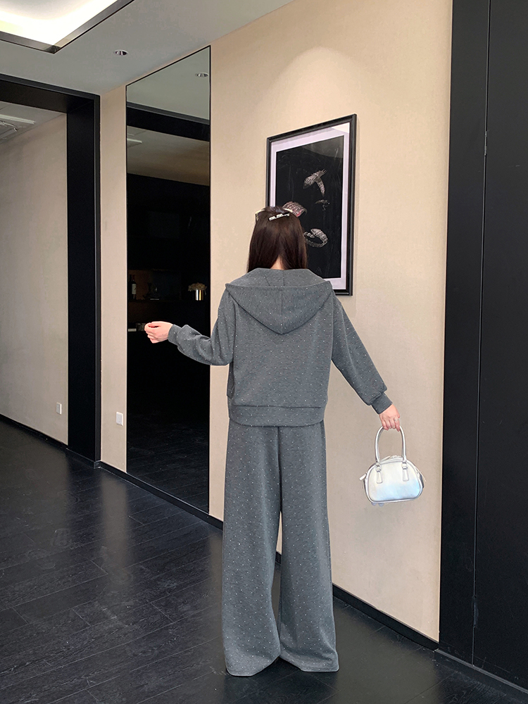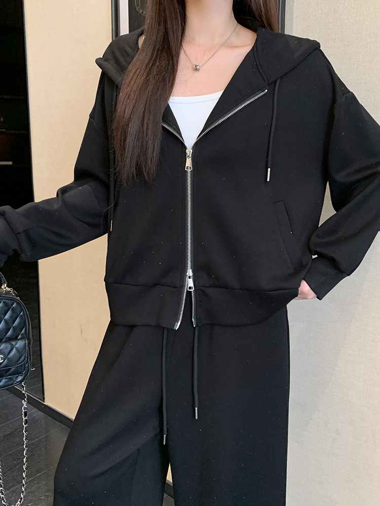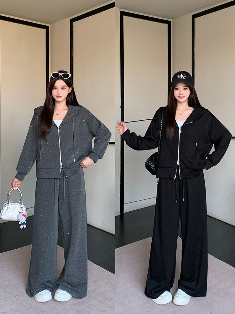 实拍大码女装韩版时尚显瘦连帽卫衣开衫外套直筒休闲阔腿裤套装