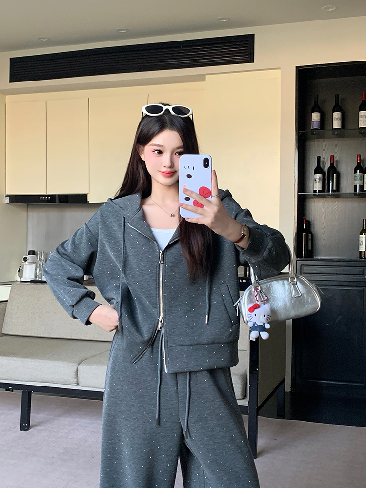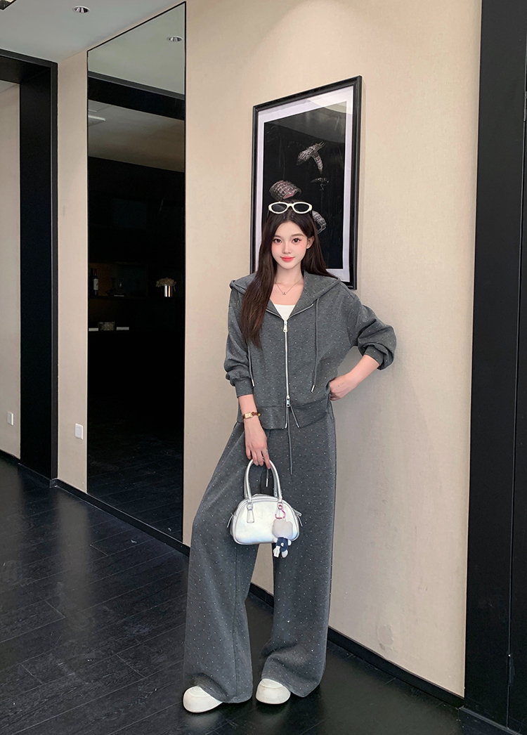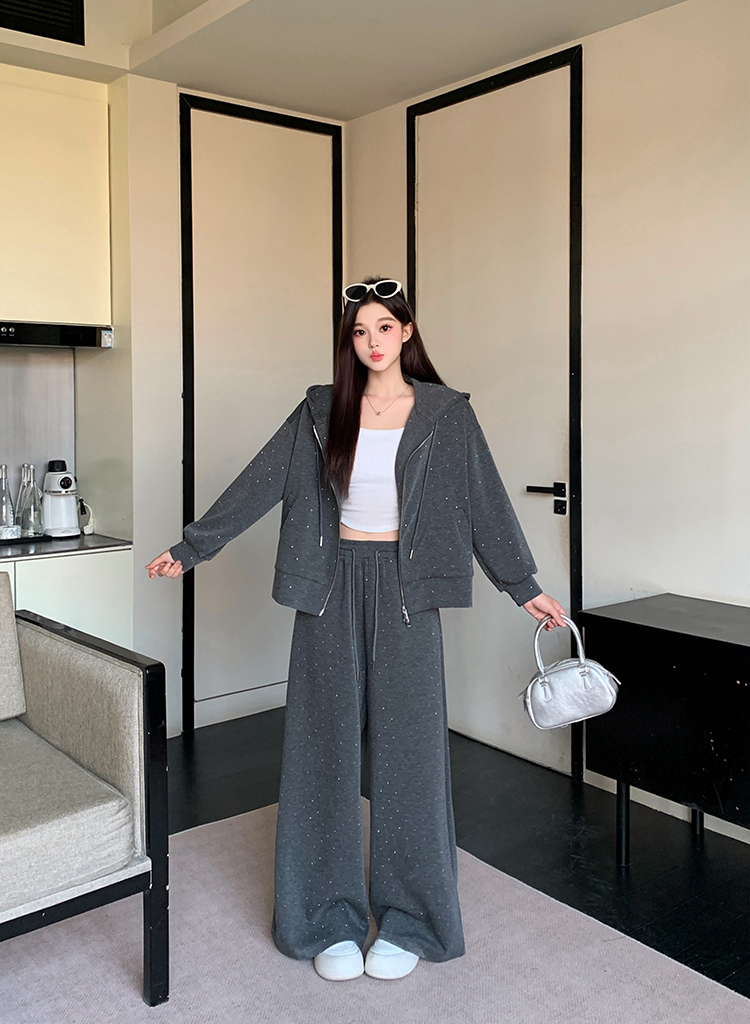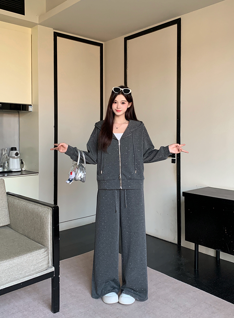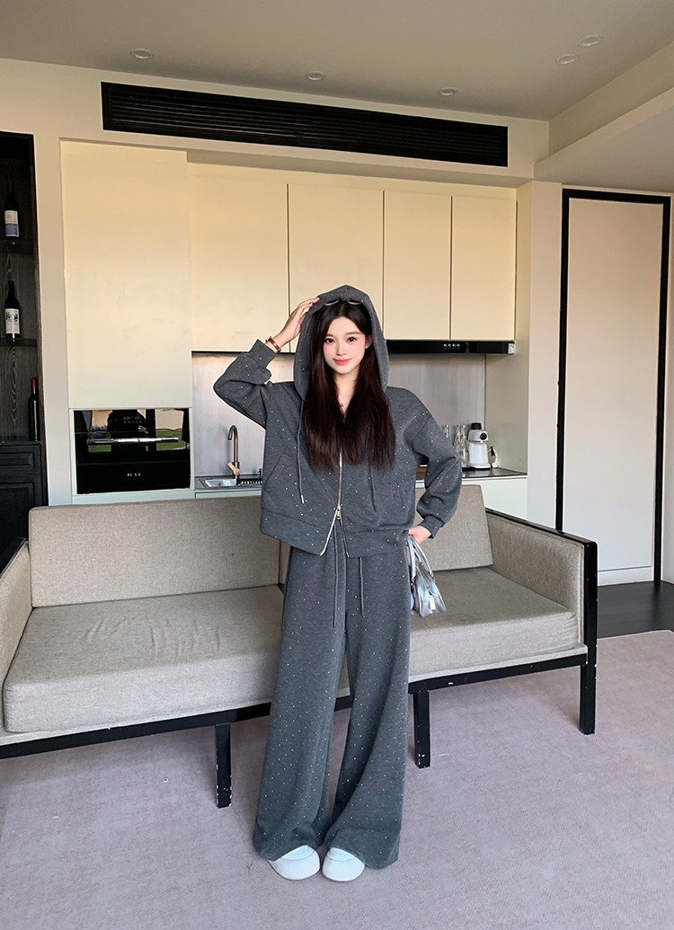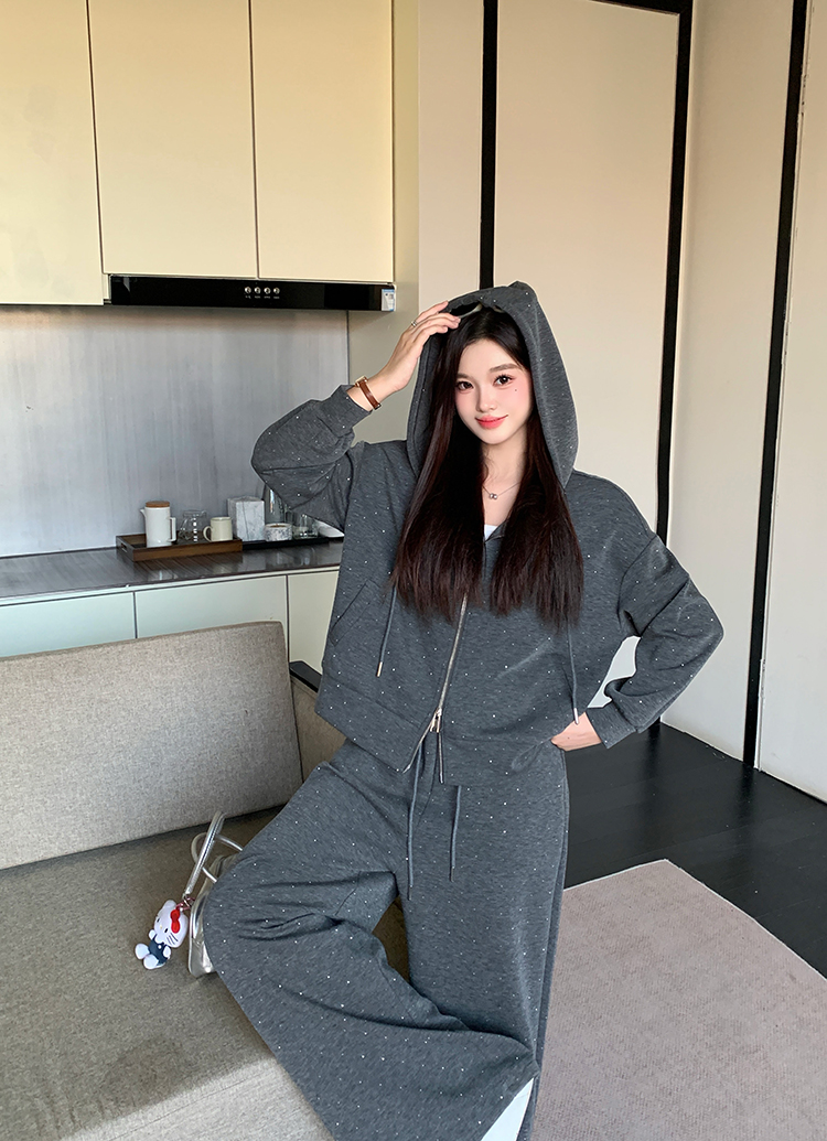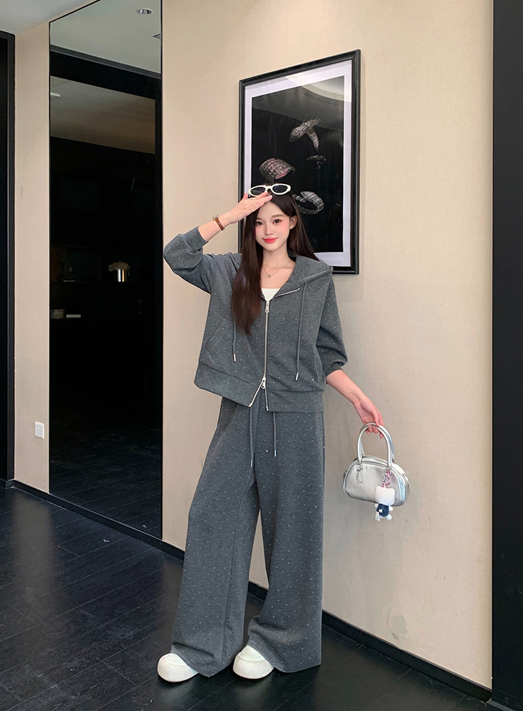 实拍大码女装韩版时尚显瘦连帽卫衣开衫外套直筒休闲阔腿裤套装