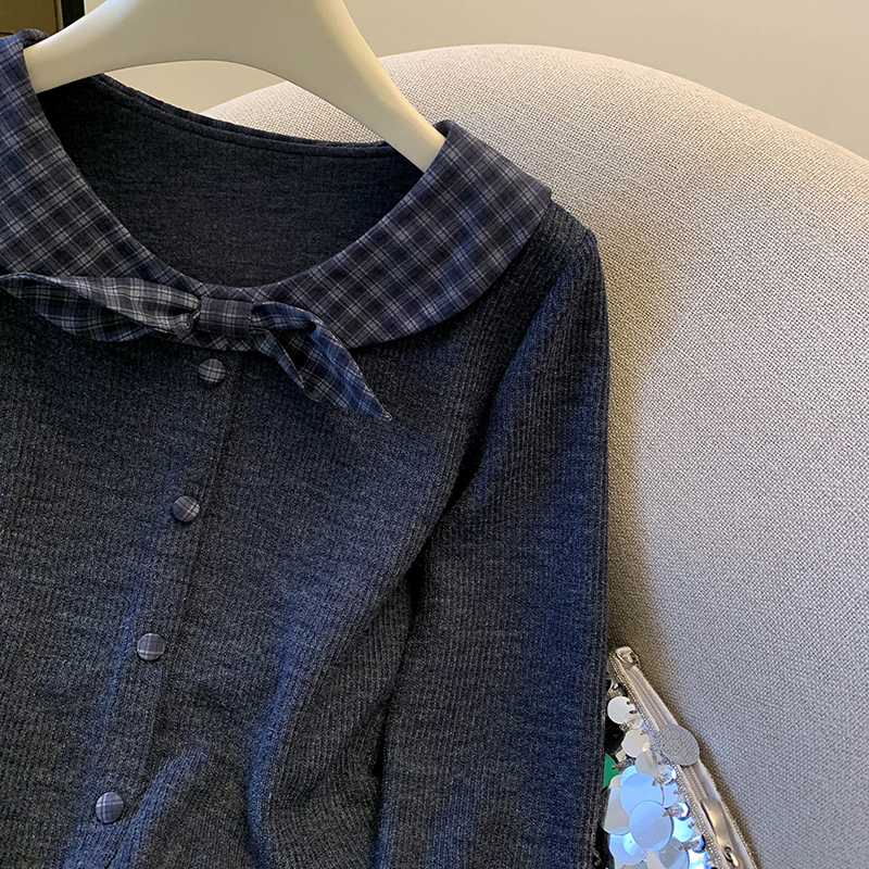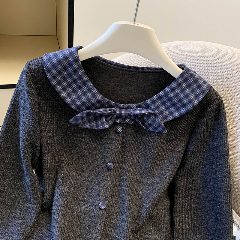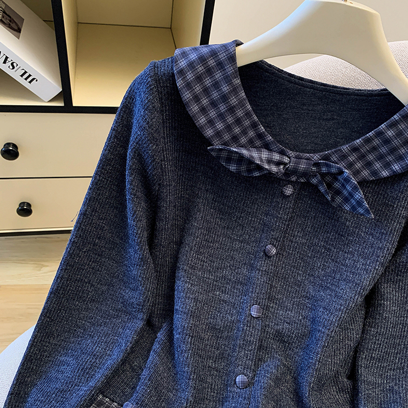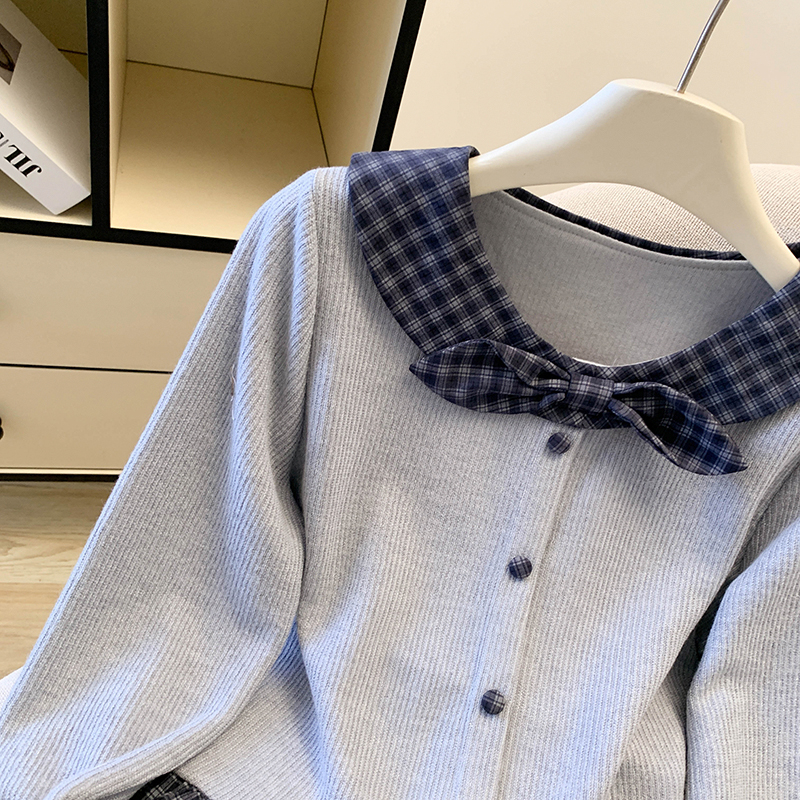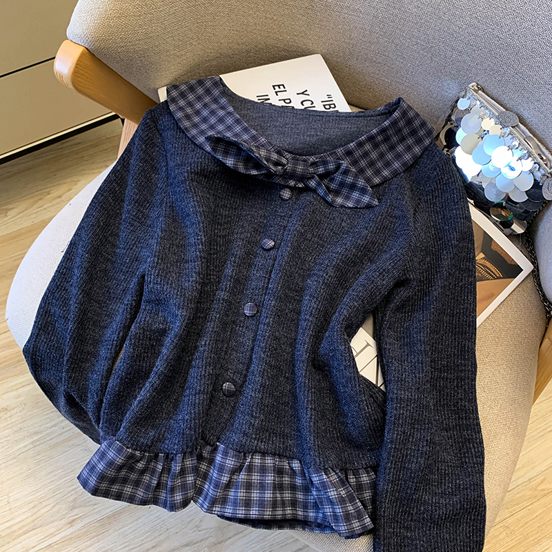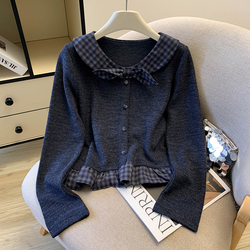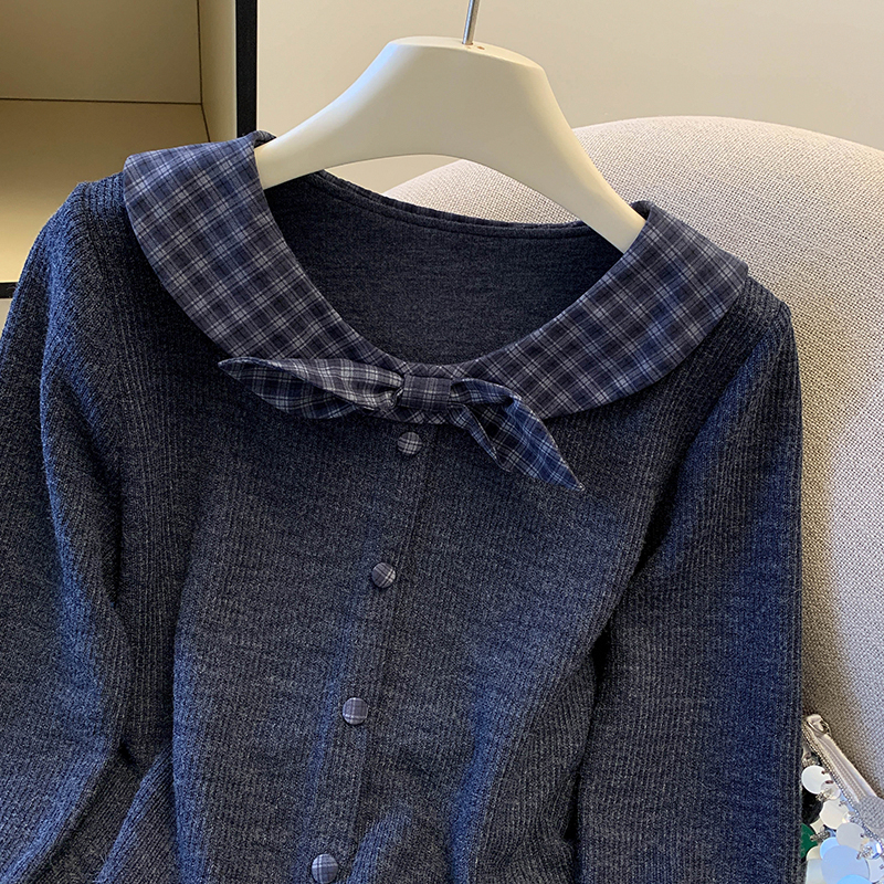 蓝色娃娃领针织衫女春秋2025秋季新款蝴蝶结格子拼接外穿短款上衣