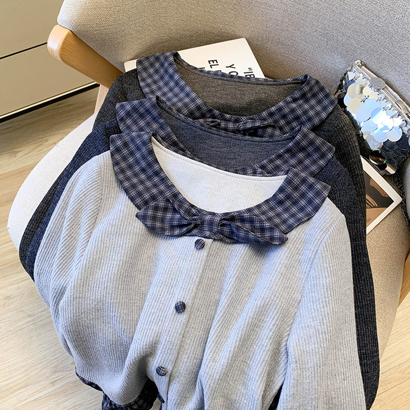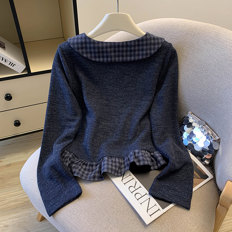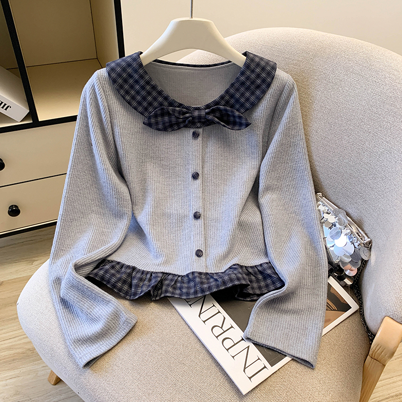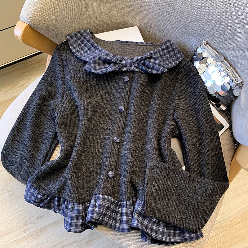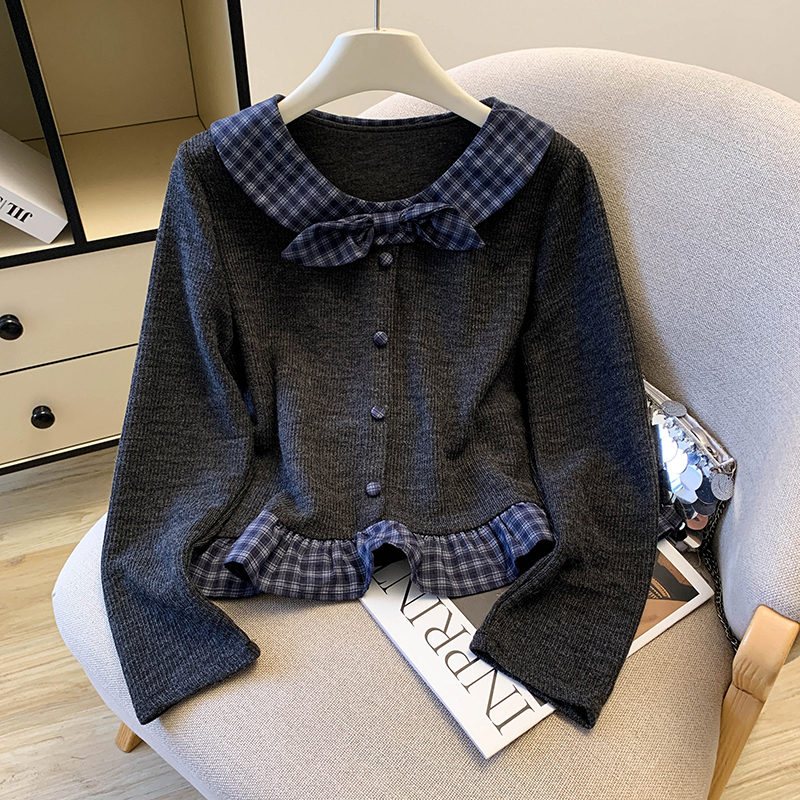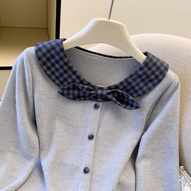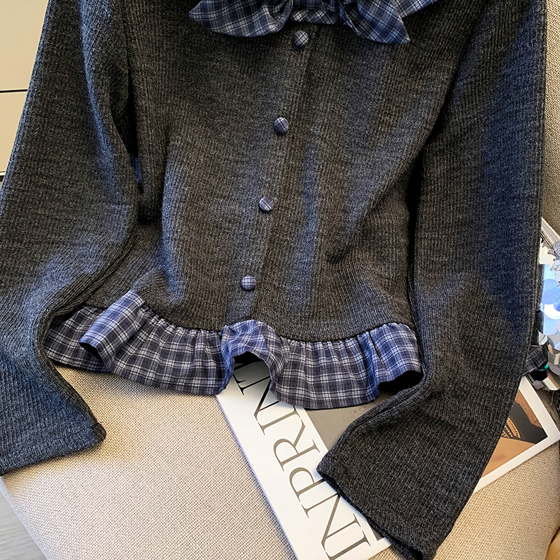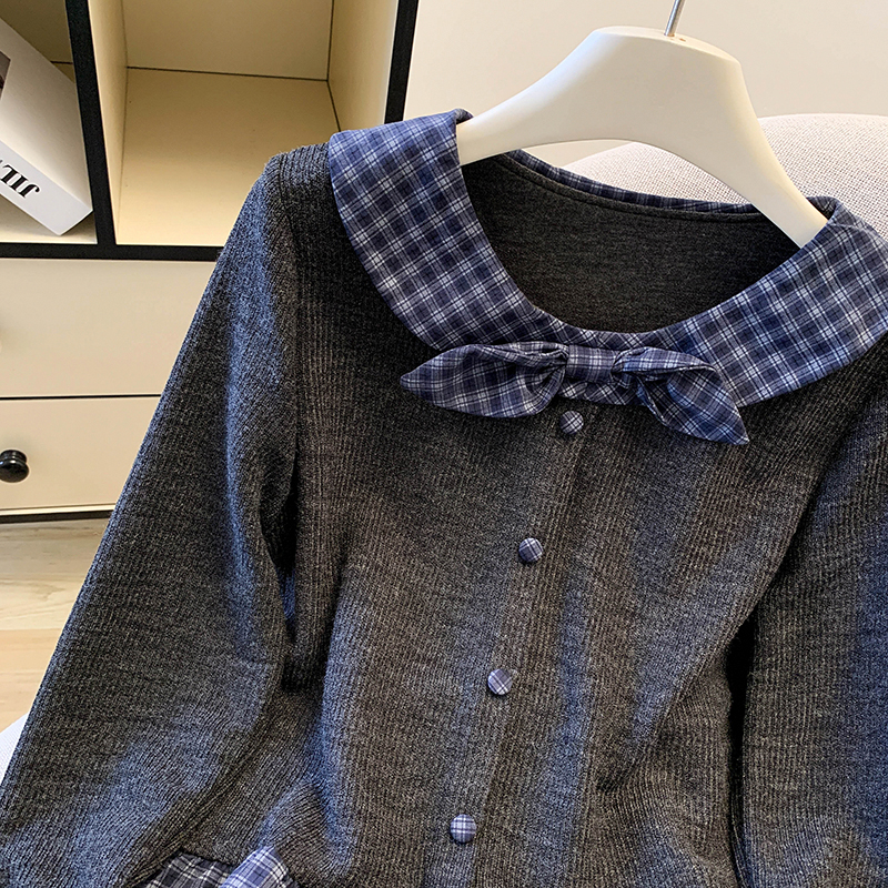 蓝色娃娃领针织衫女春秋2025秋季新款蝴蝶结格子拼接外穿短款上衣