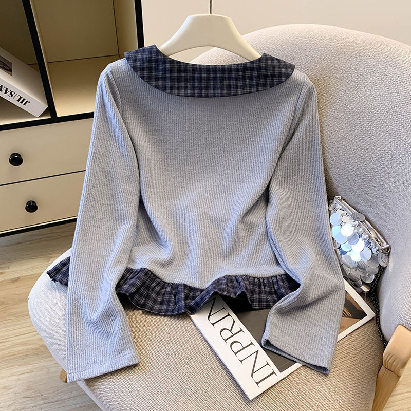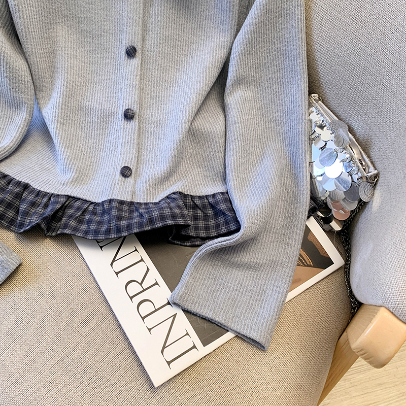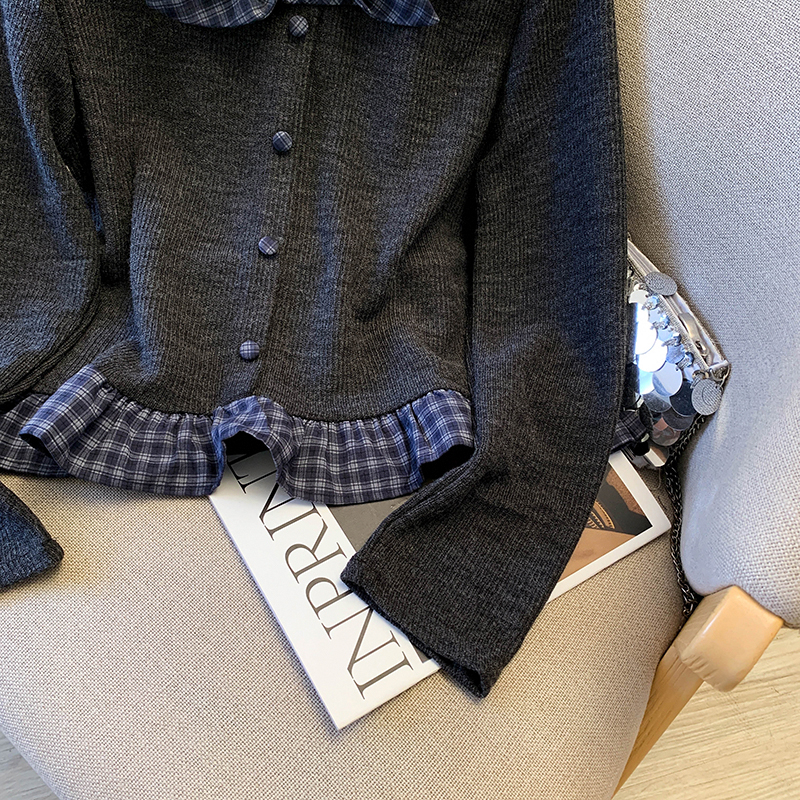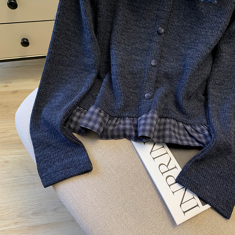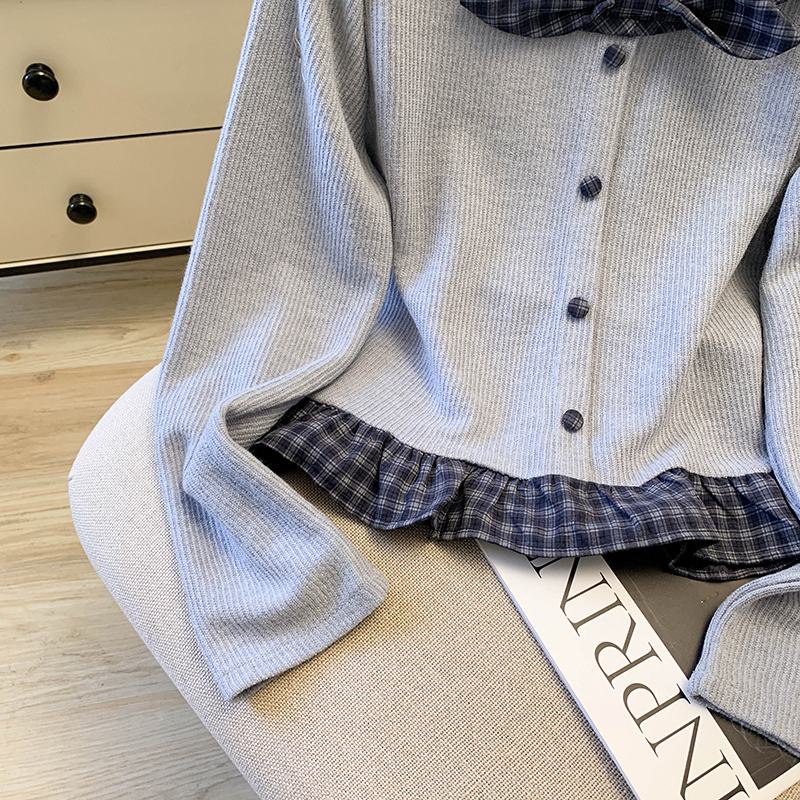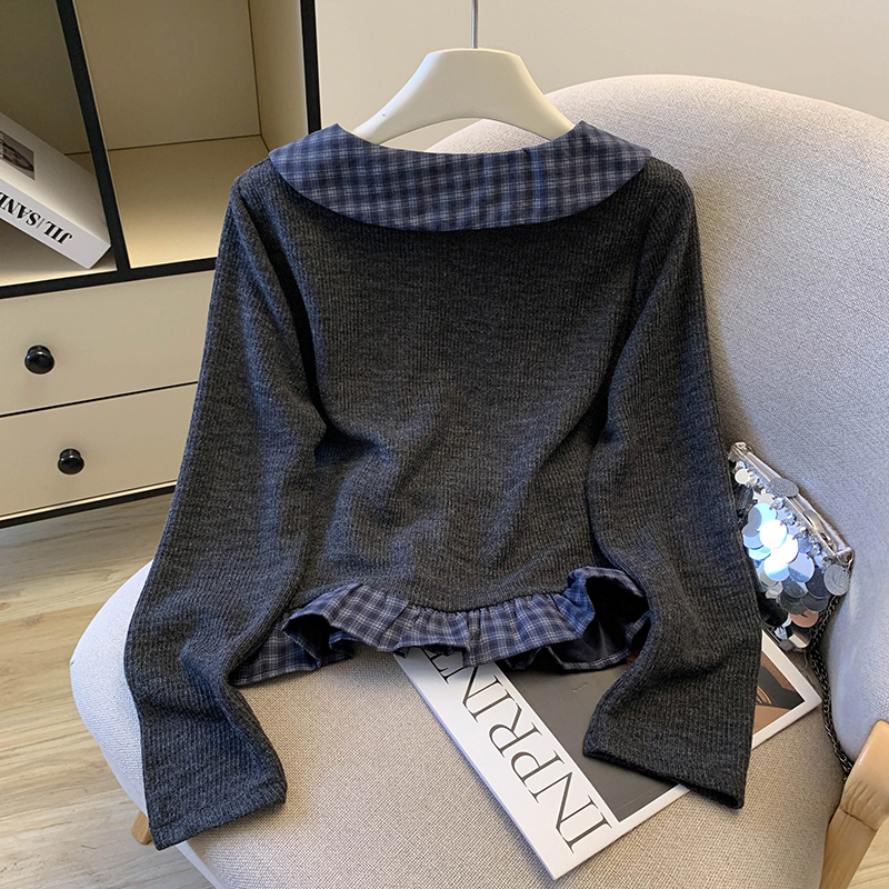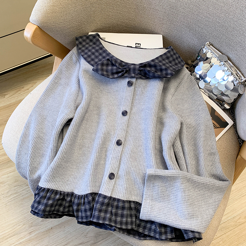 蓝色娃娃领针织衫女春秋2025秋季新款蝴蝶结格子拼接外穿短款上衣
