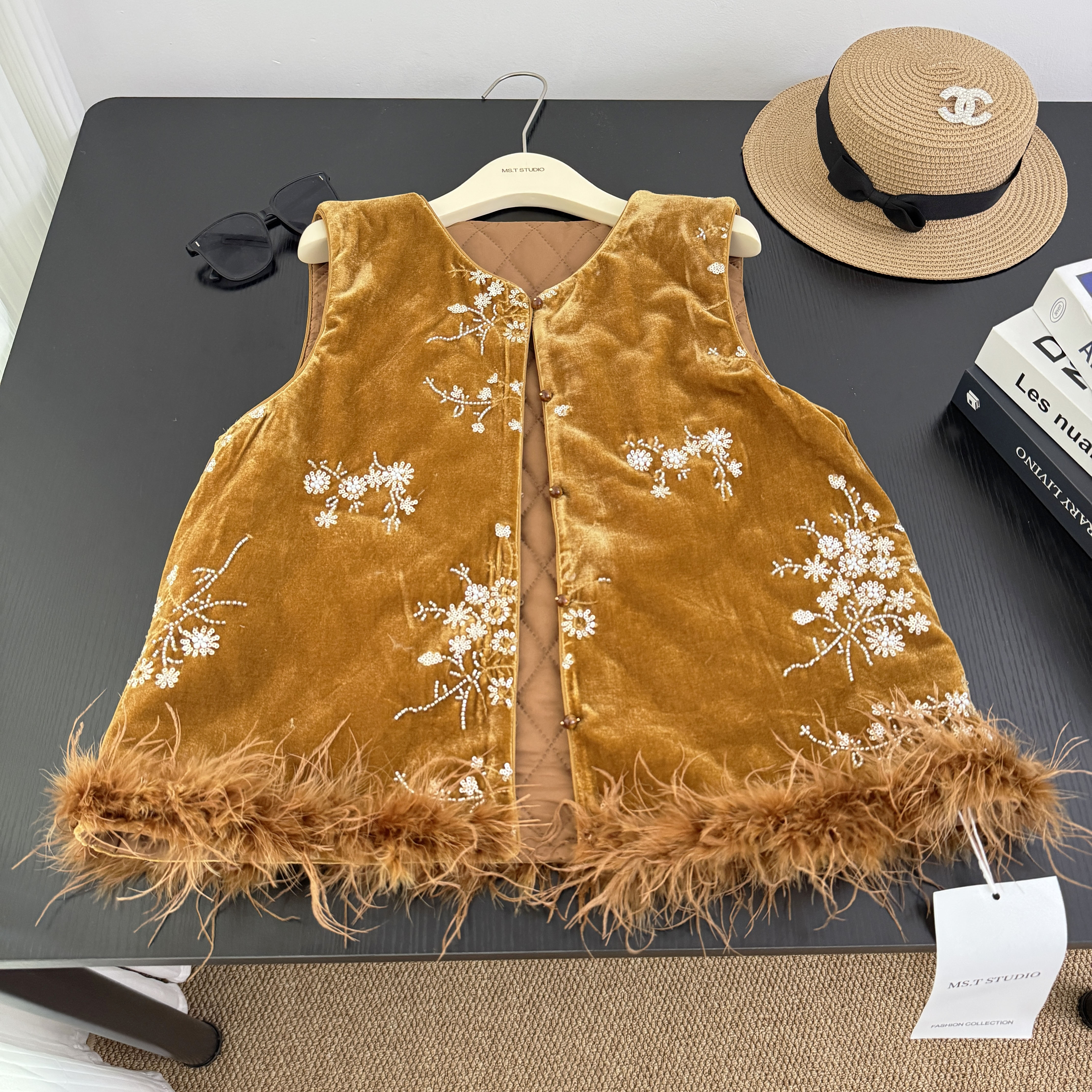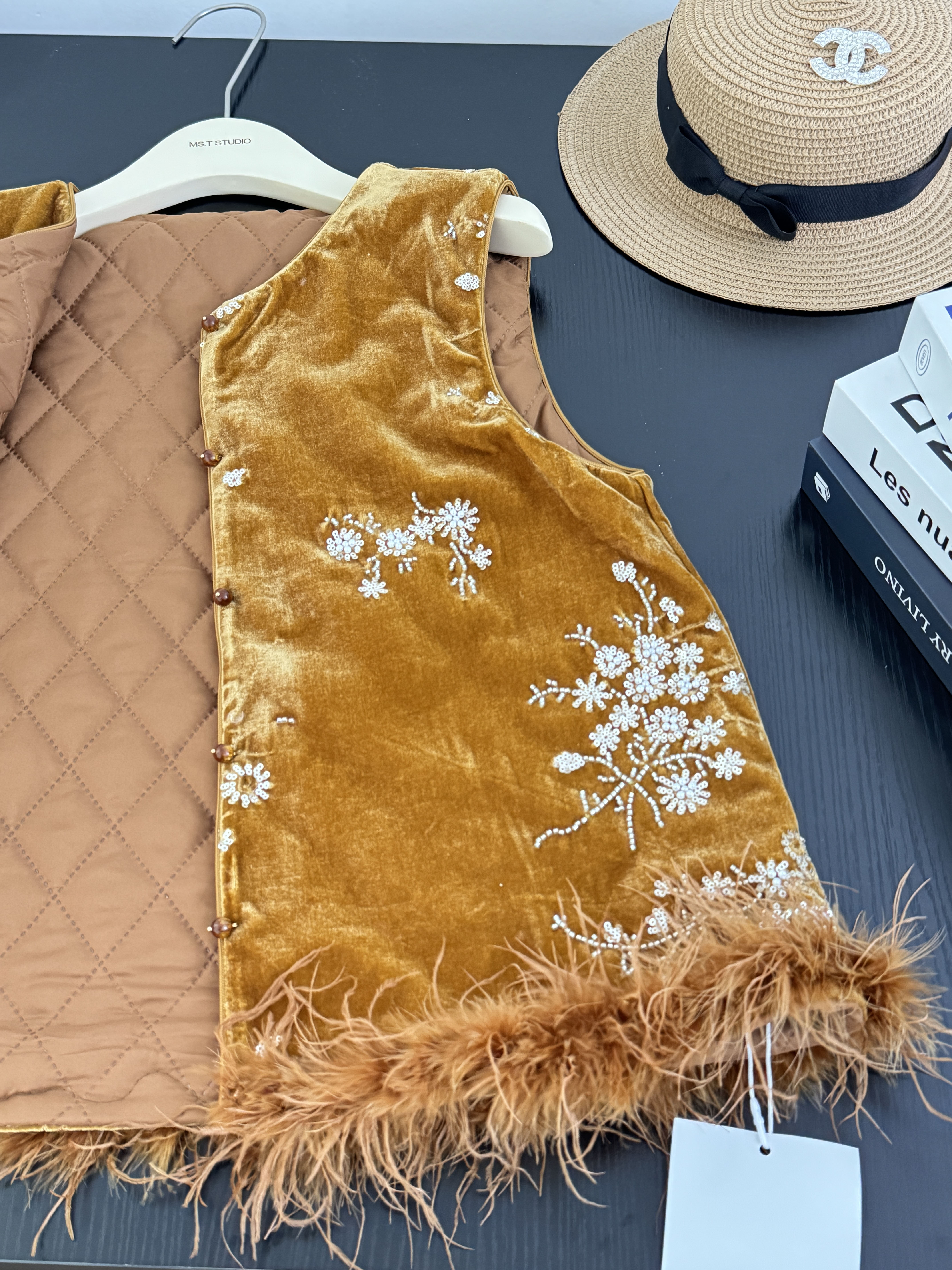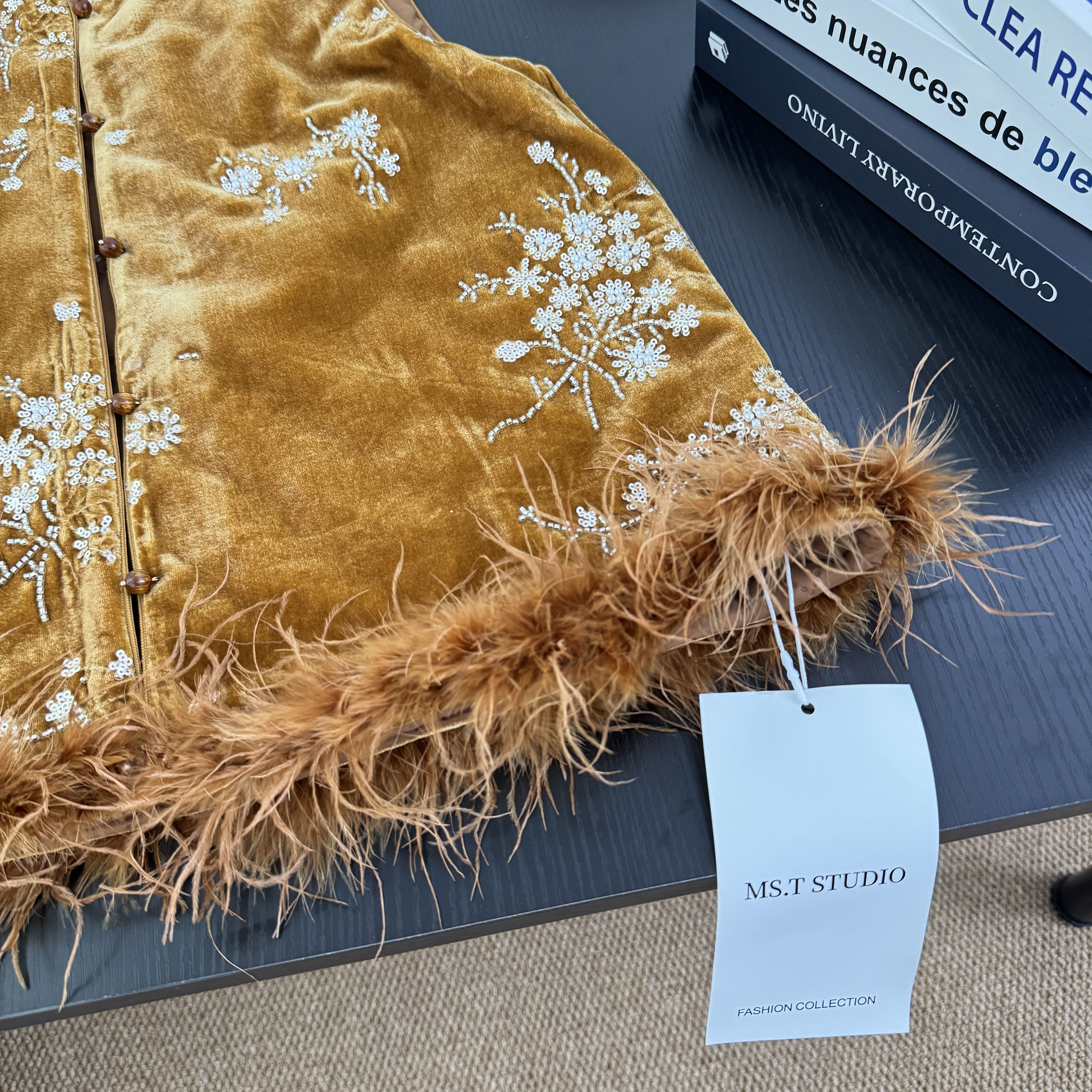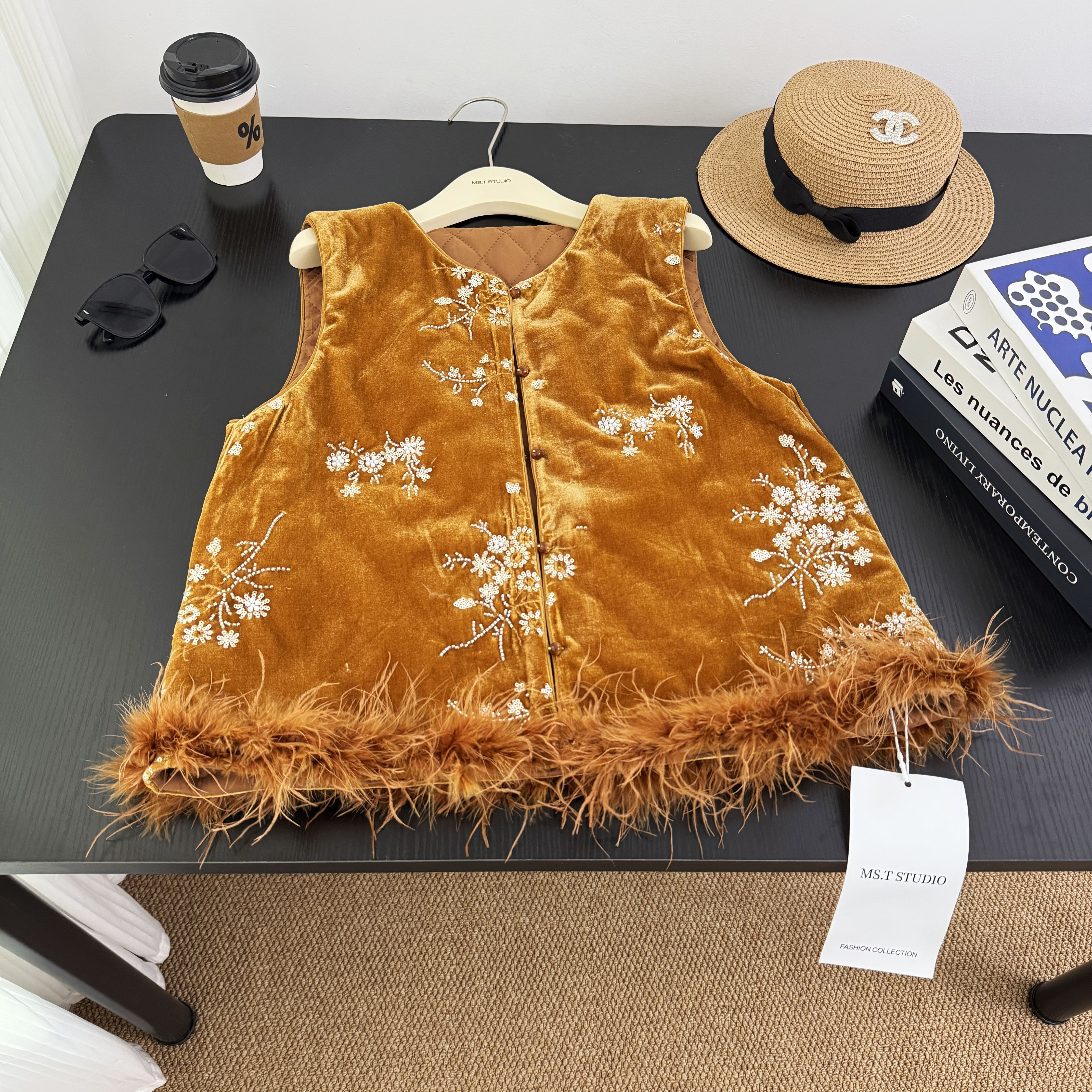 新中式鸵鸟毛马甲国风金丝绒坎肩背心秋冬重工亮片马甲刺绣外搭女