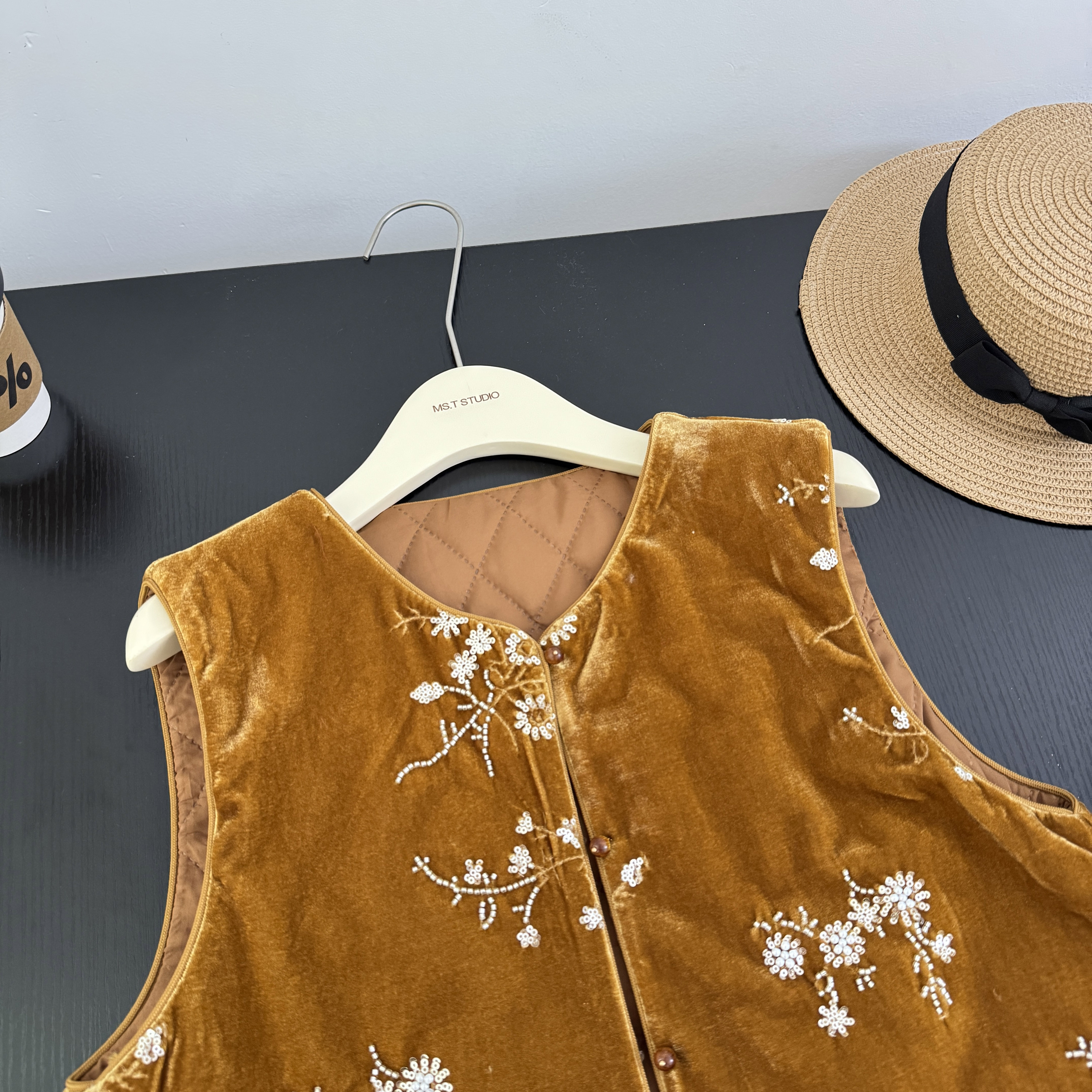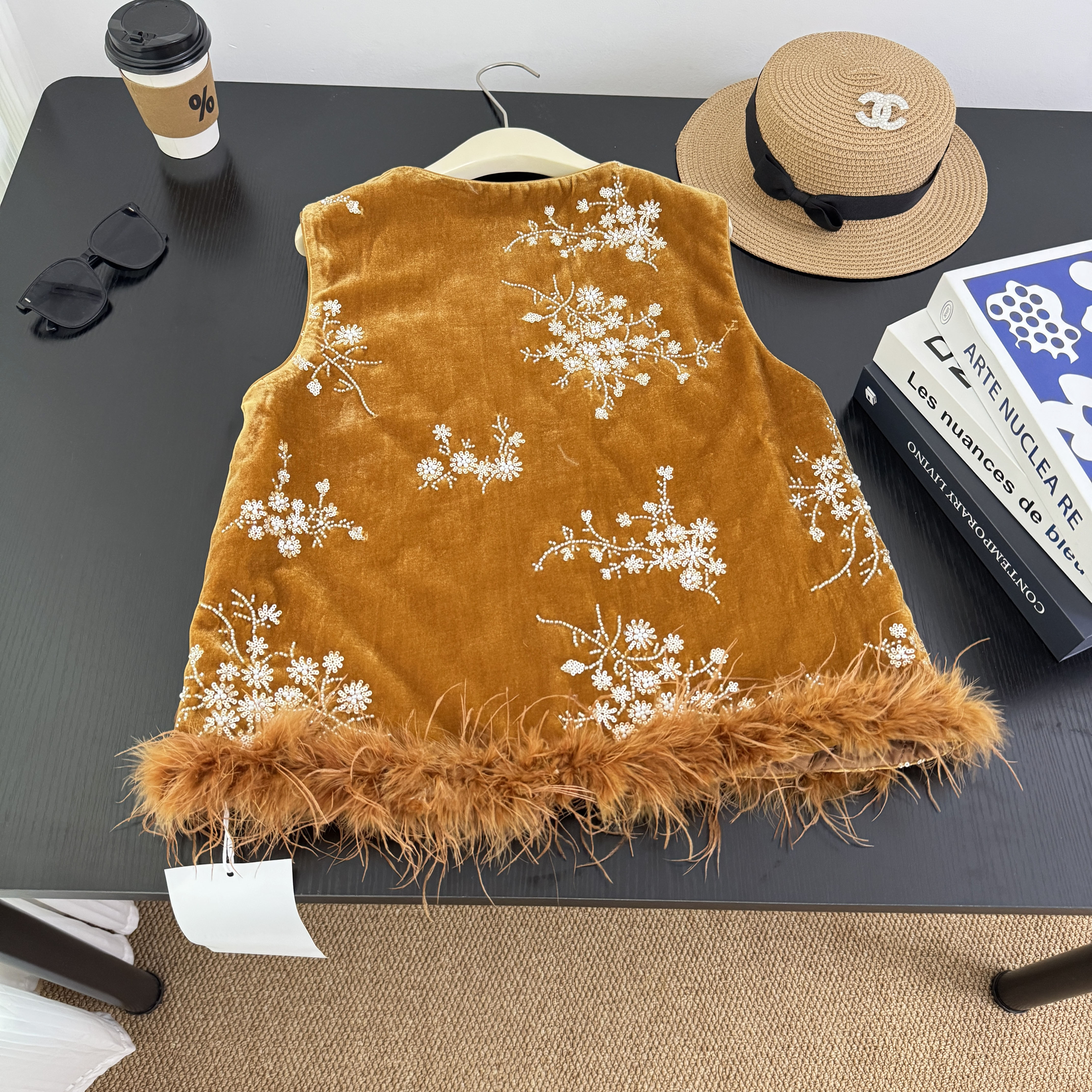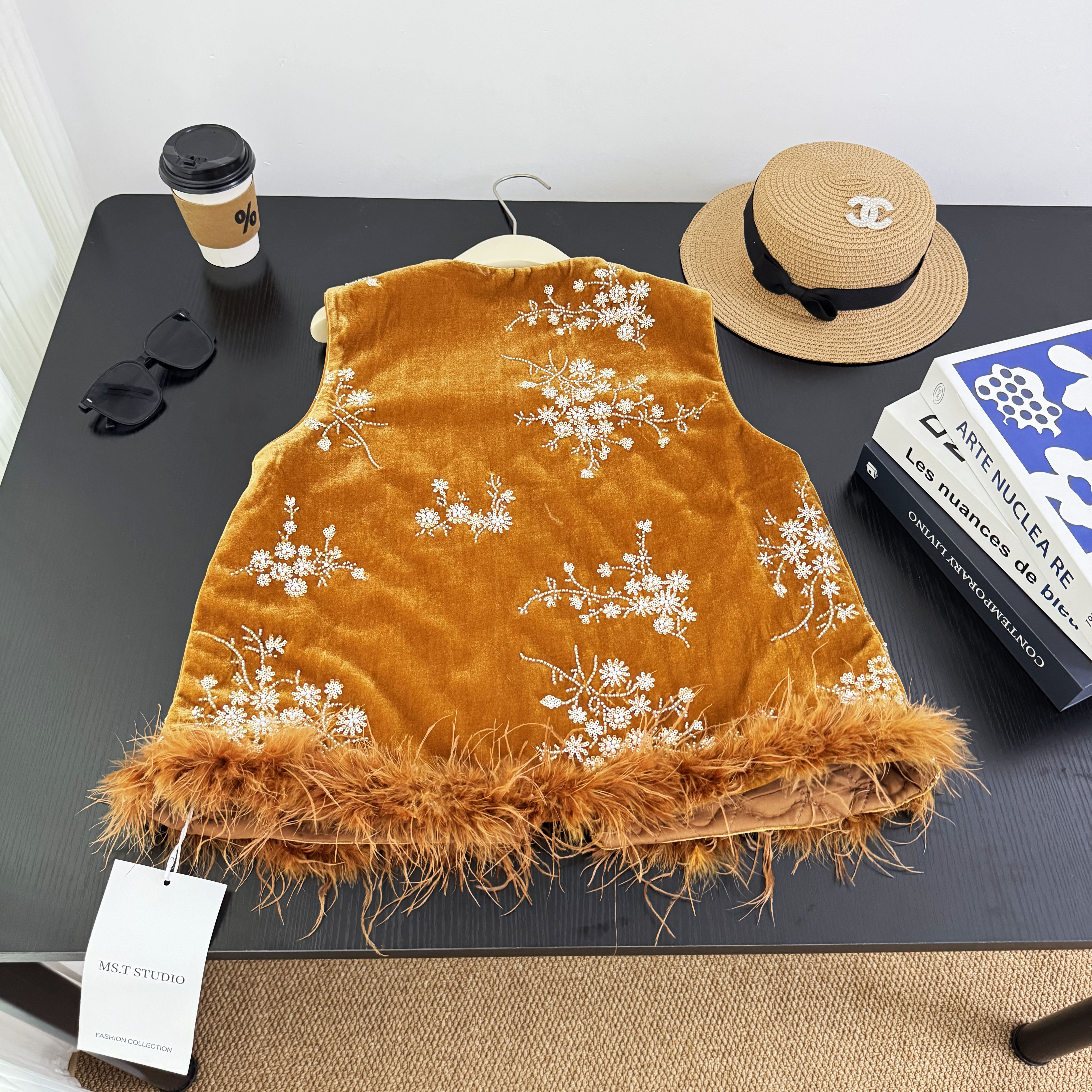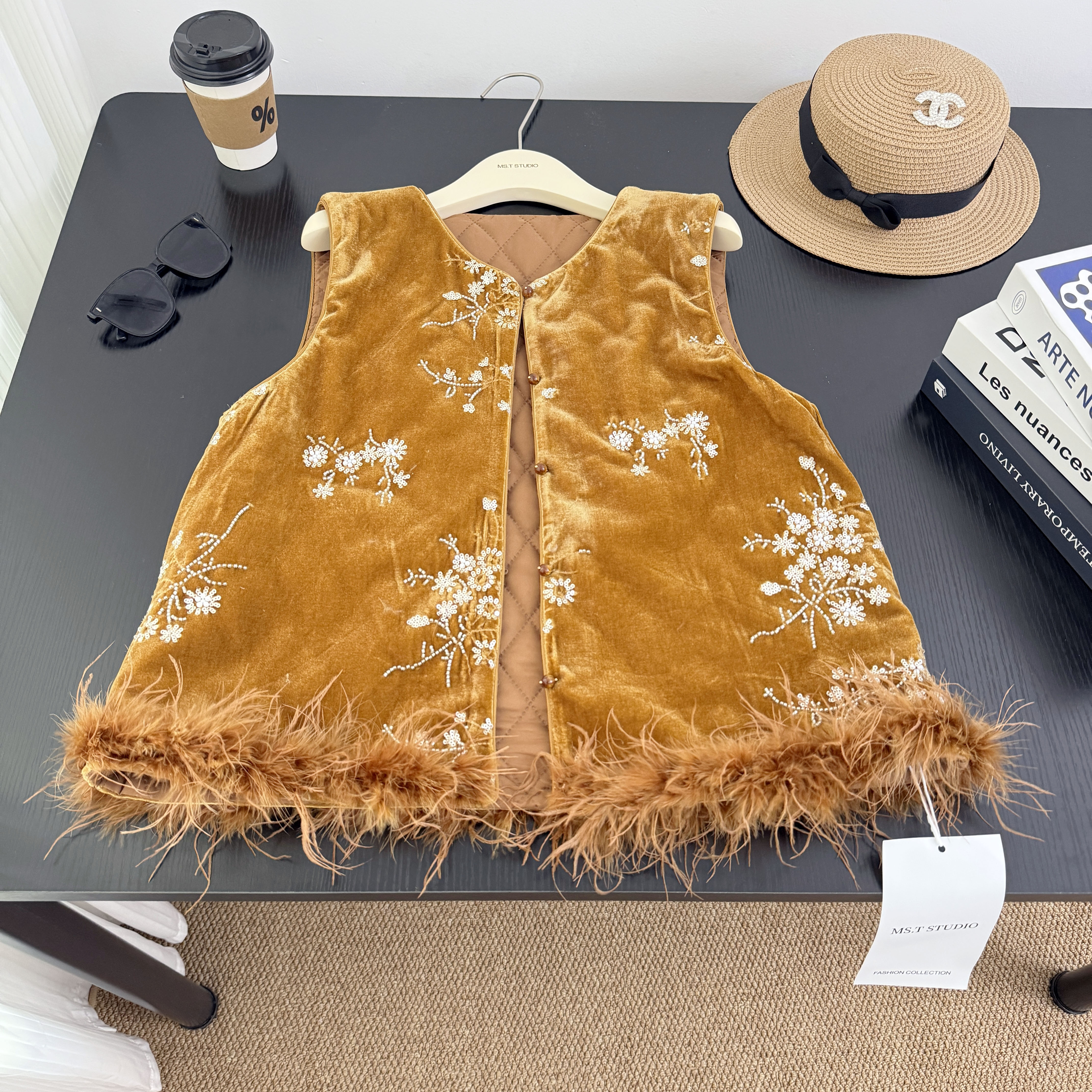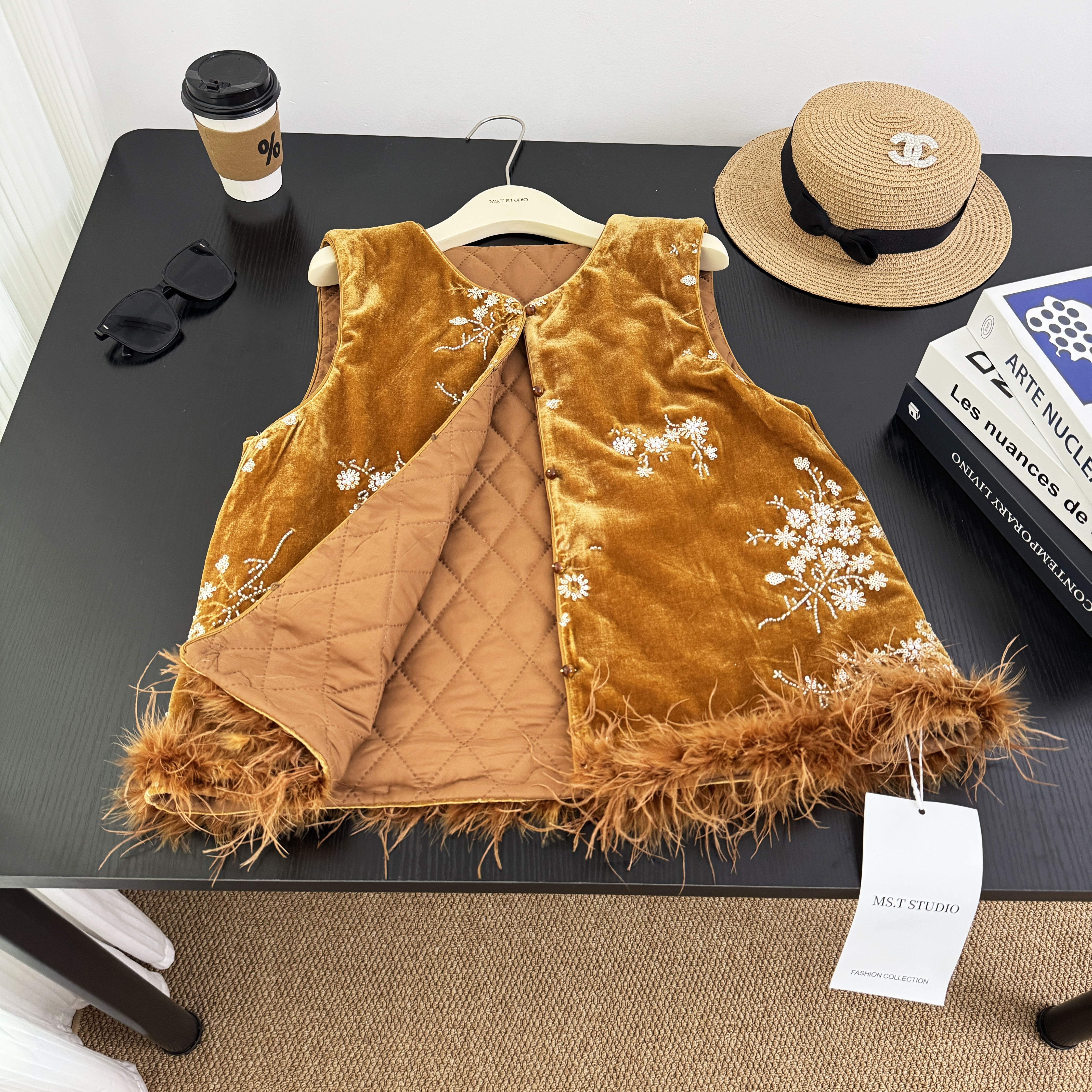 新中式鸵鸟毛马甲国风金丝绒坎肩背心秋冬重工亮片马甲刺绣外搭女