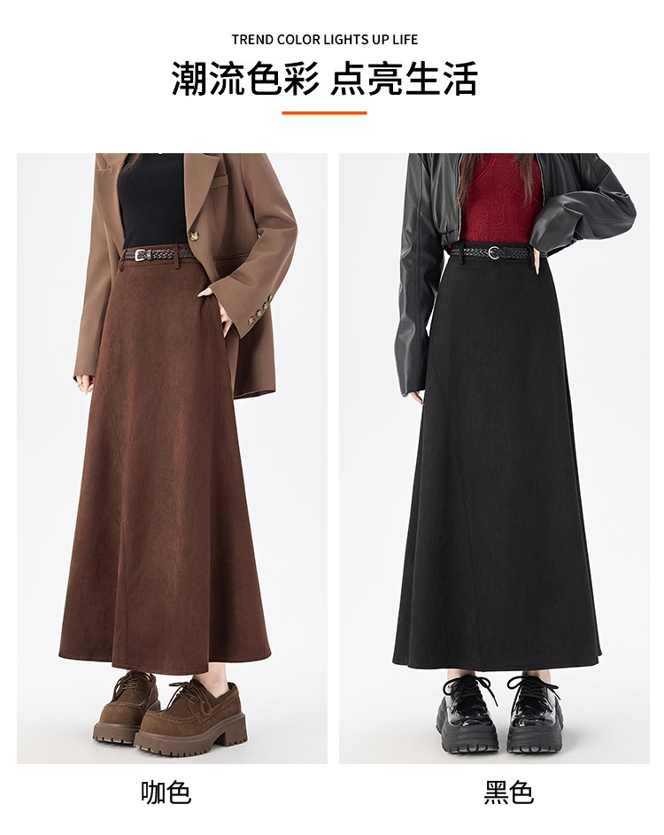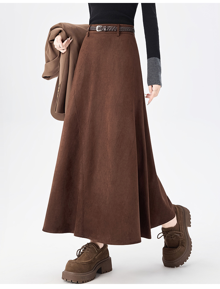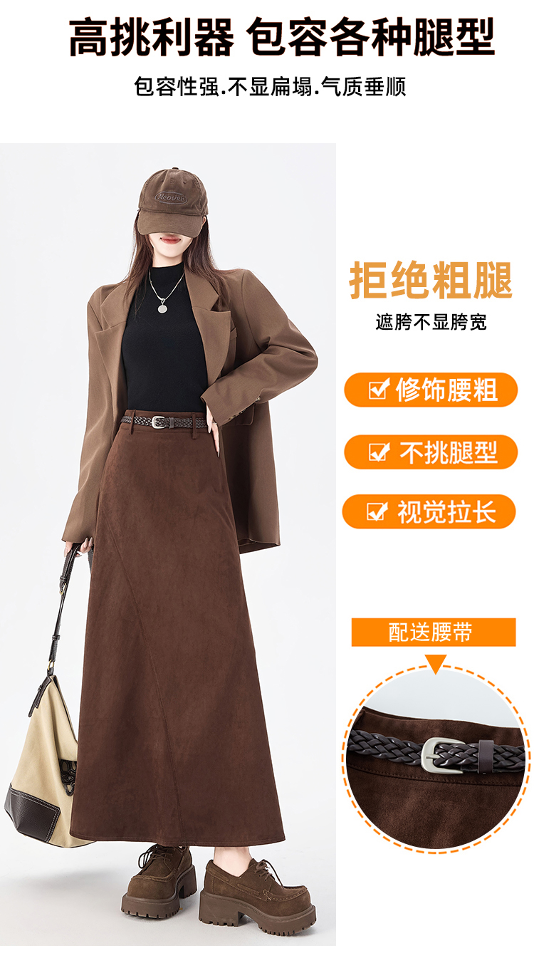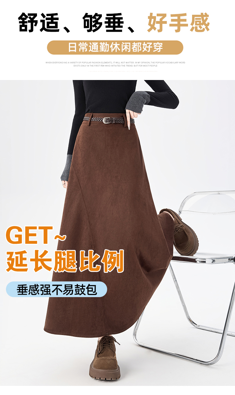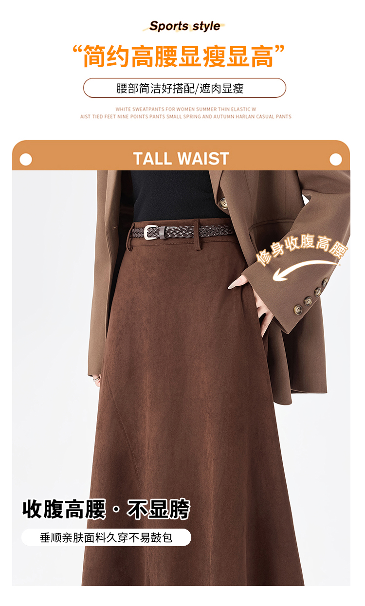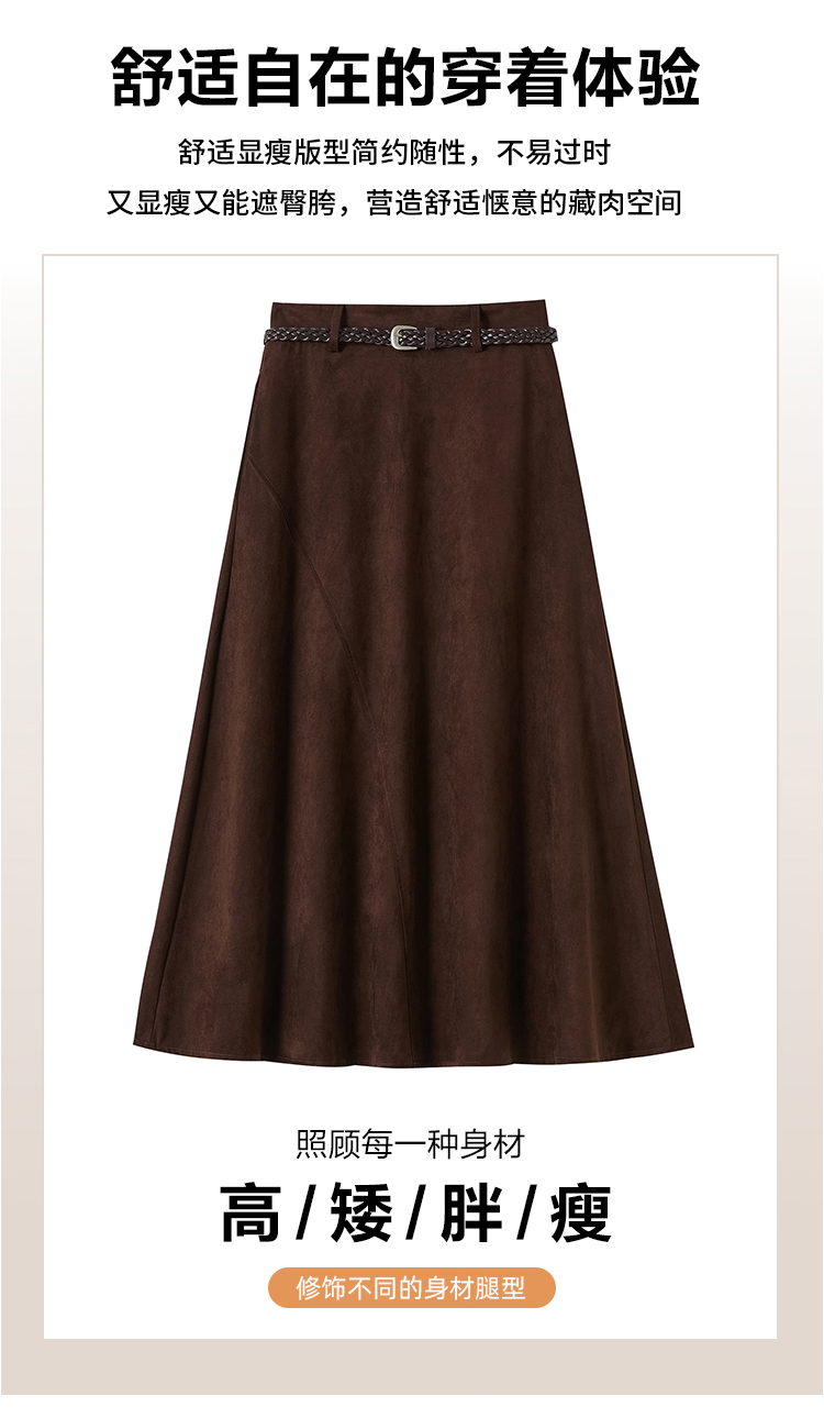 实拍 2025秋冬遮胯显瘦编织腰带设计韩线条麂皮绒中长a字半身伞裙