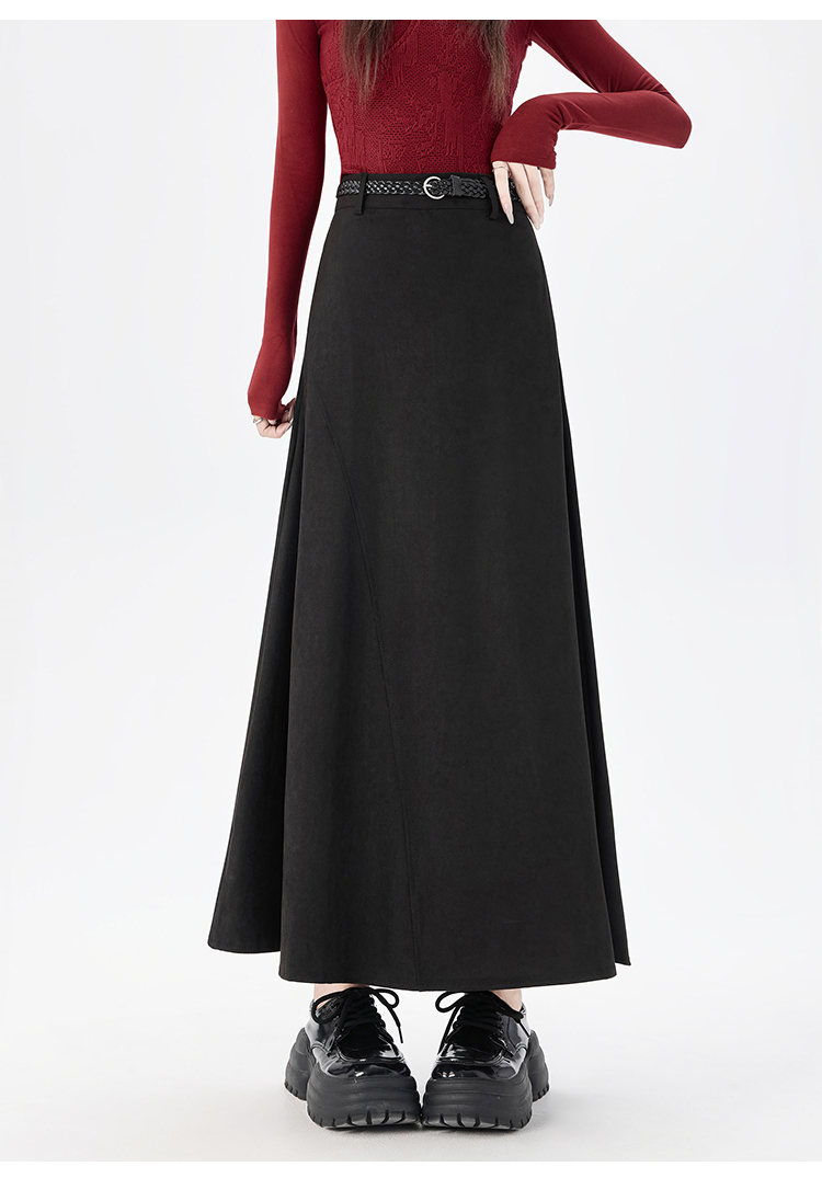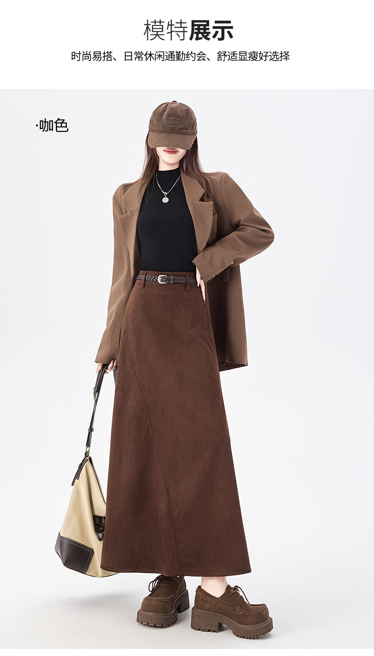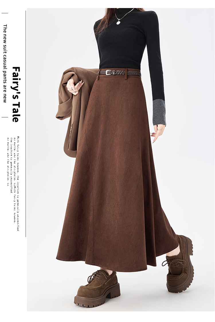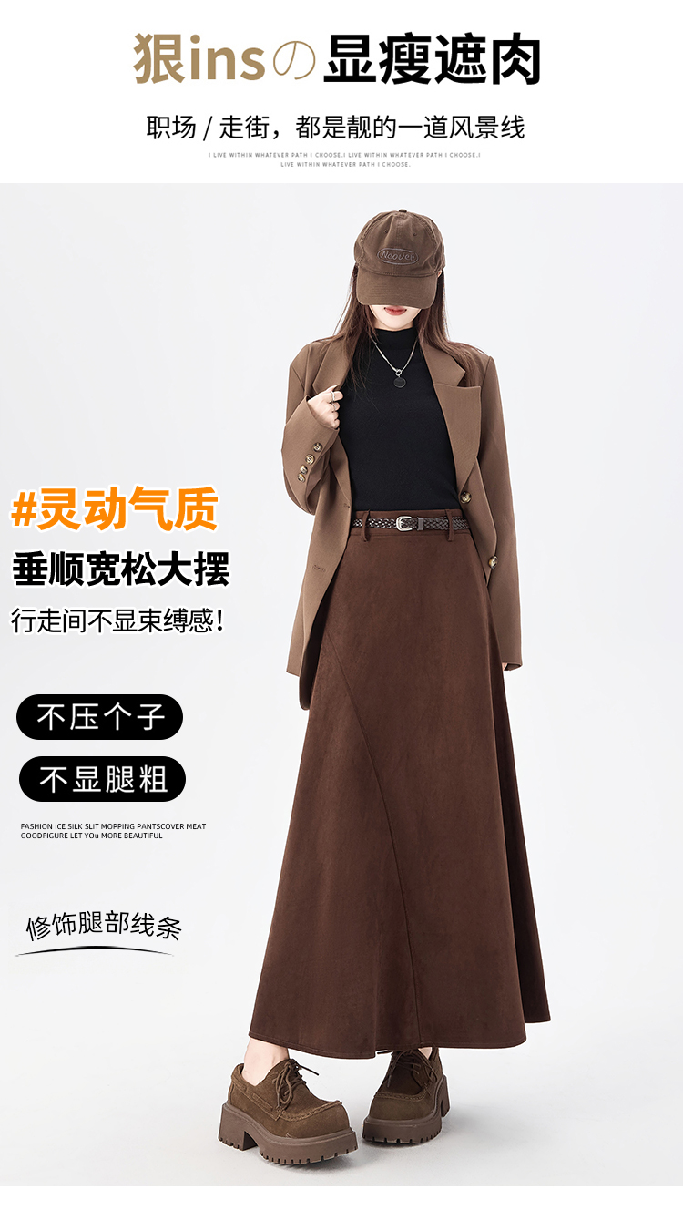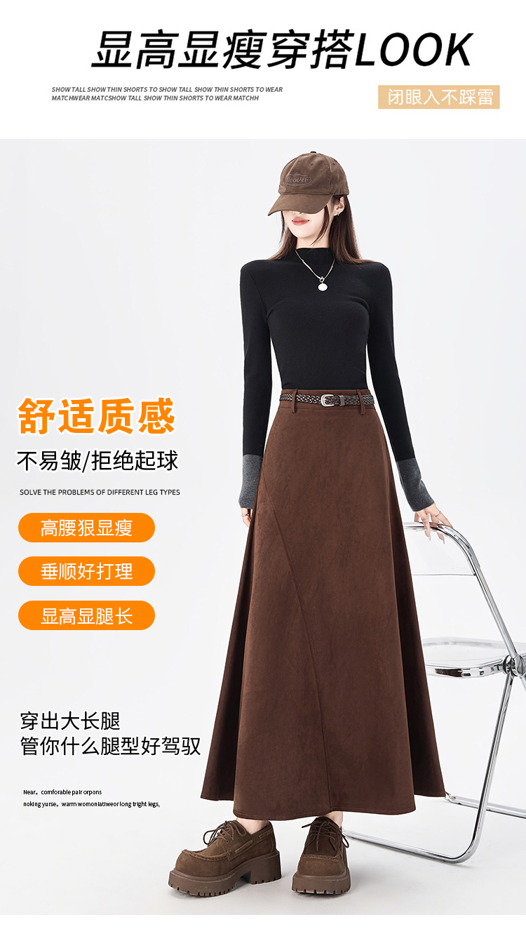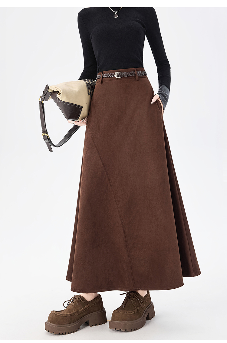 实拍 2025秋冬遮胯显瘦编织腰带设计韩线条麂皮绒中长a字半身伞裙
