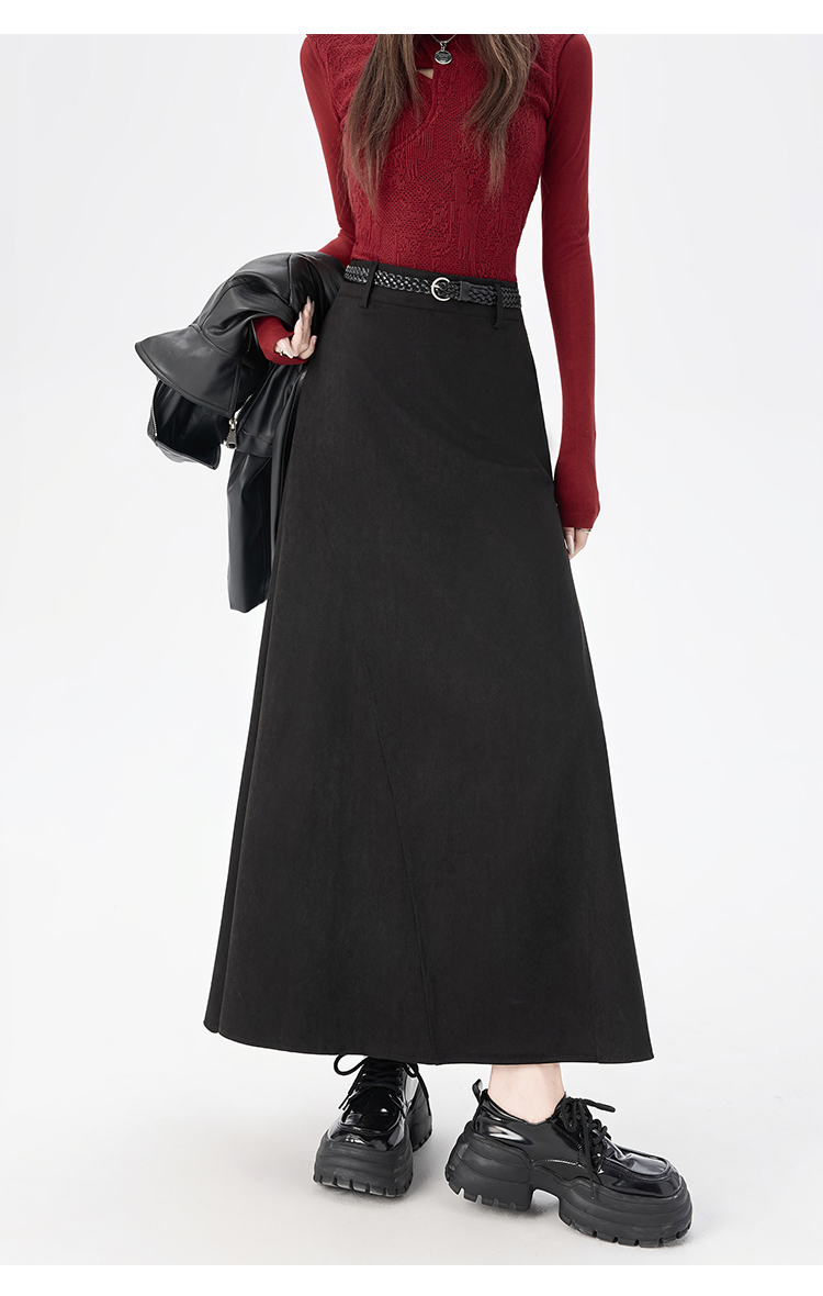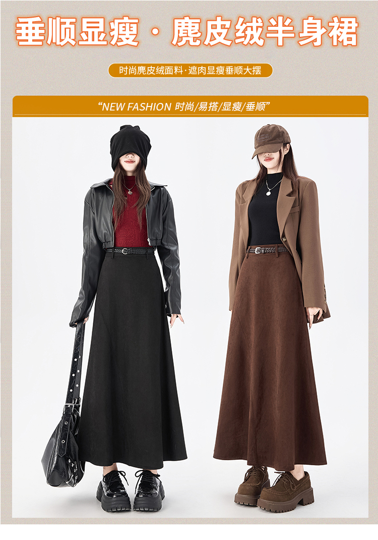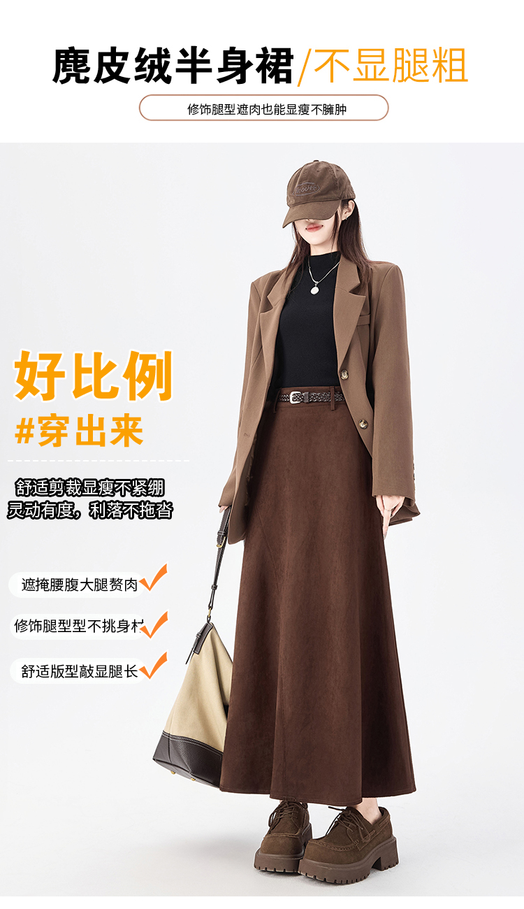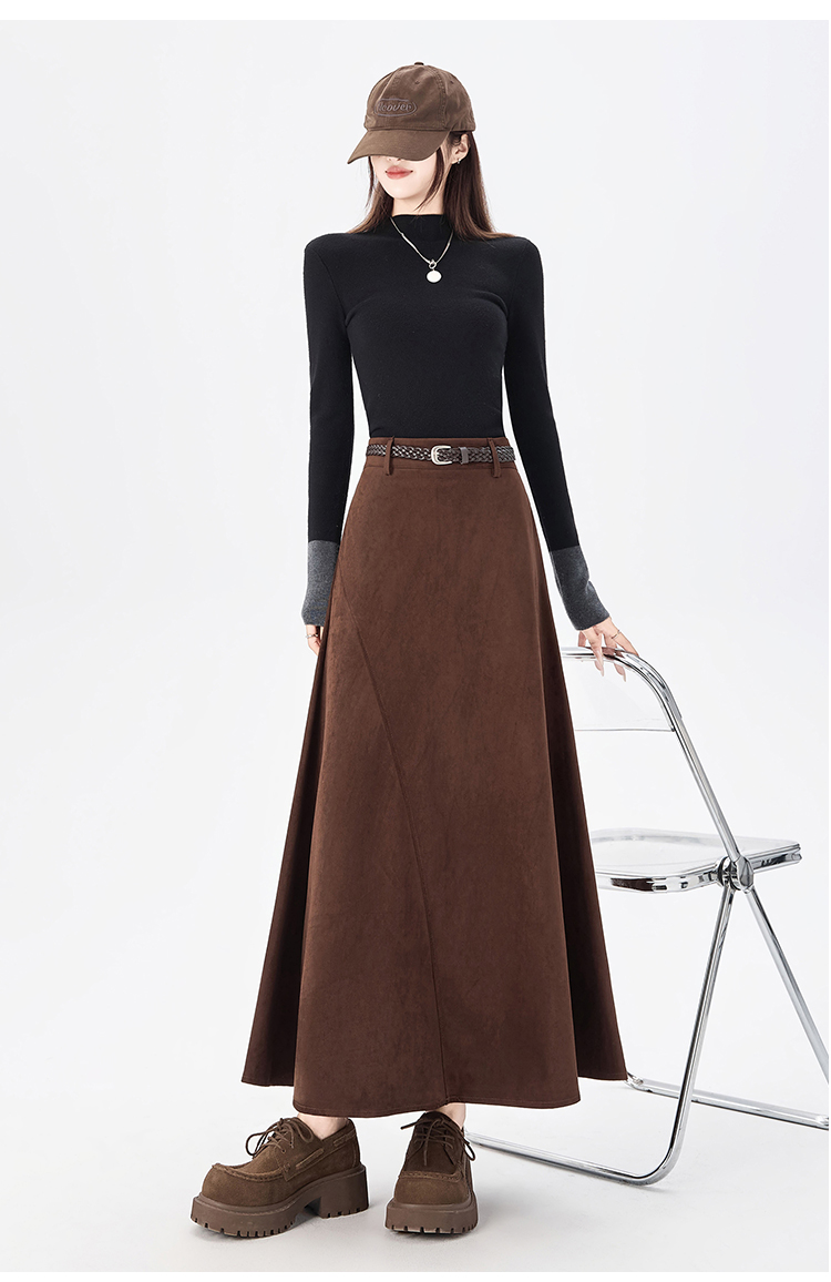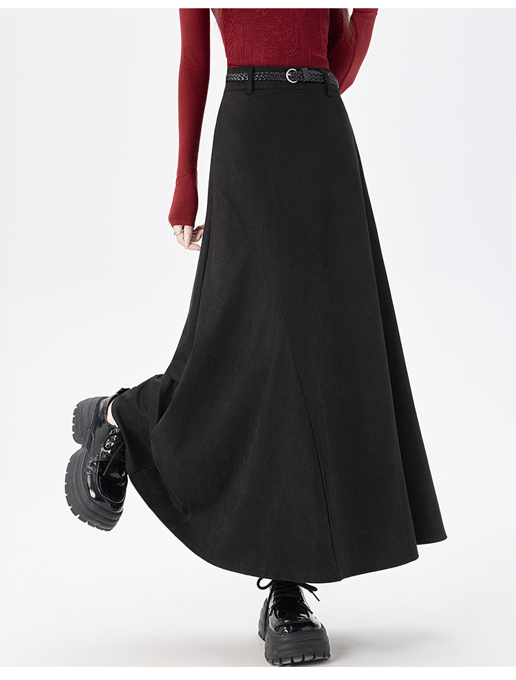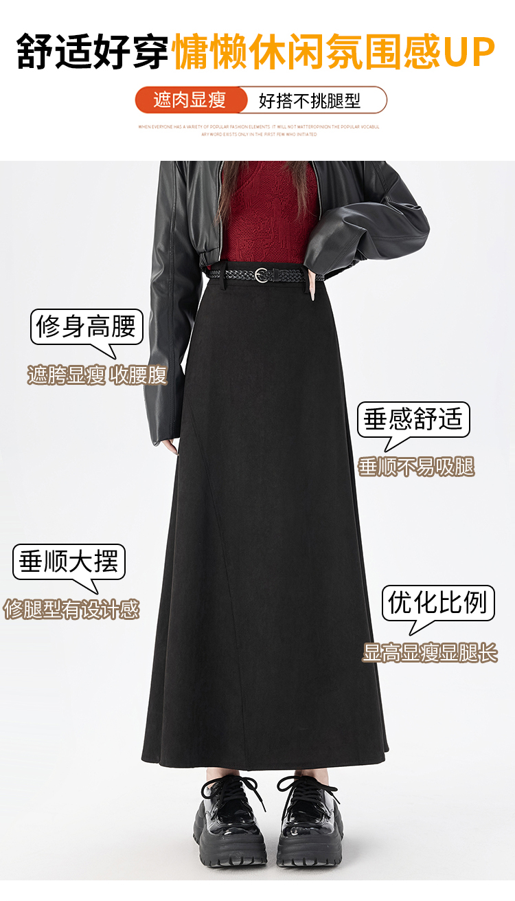 实拍 2025秋冬遮胯显瘦编织腰带设计韩线条麂皮绒中长a字半身伞裙