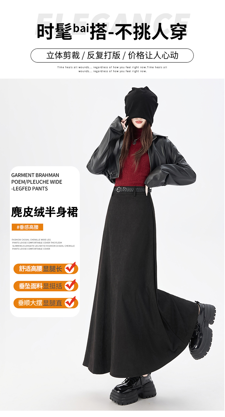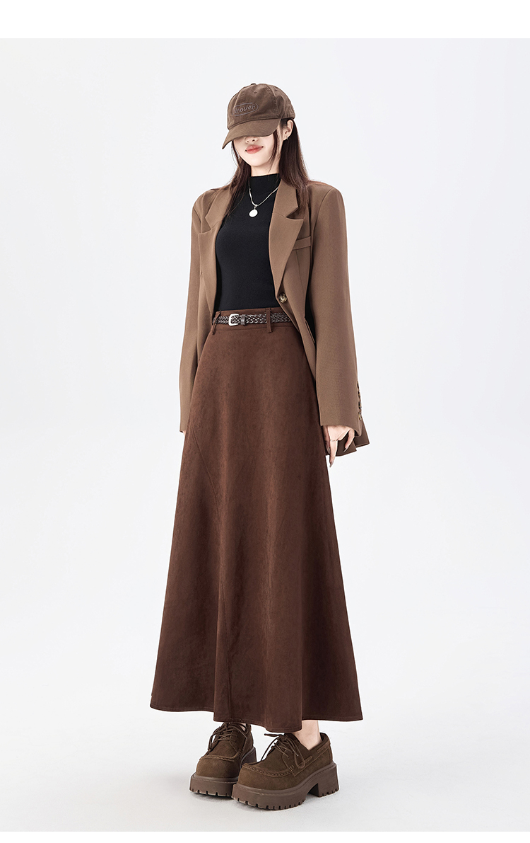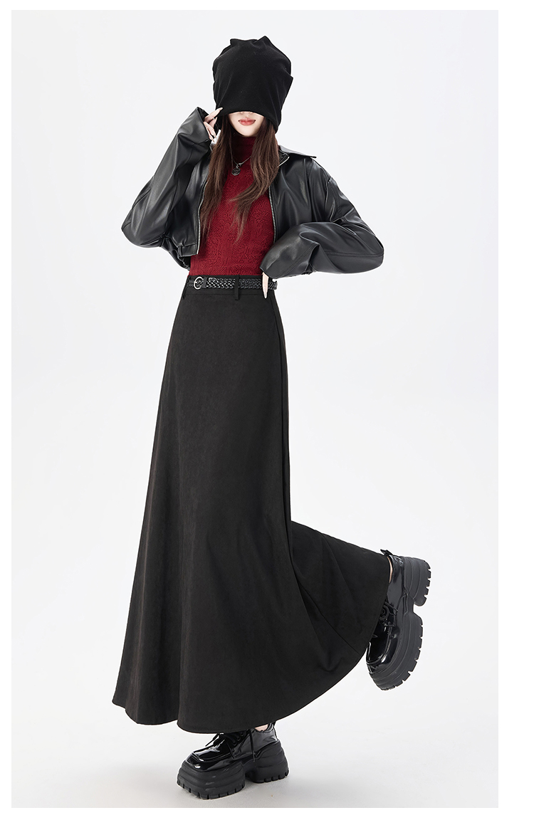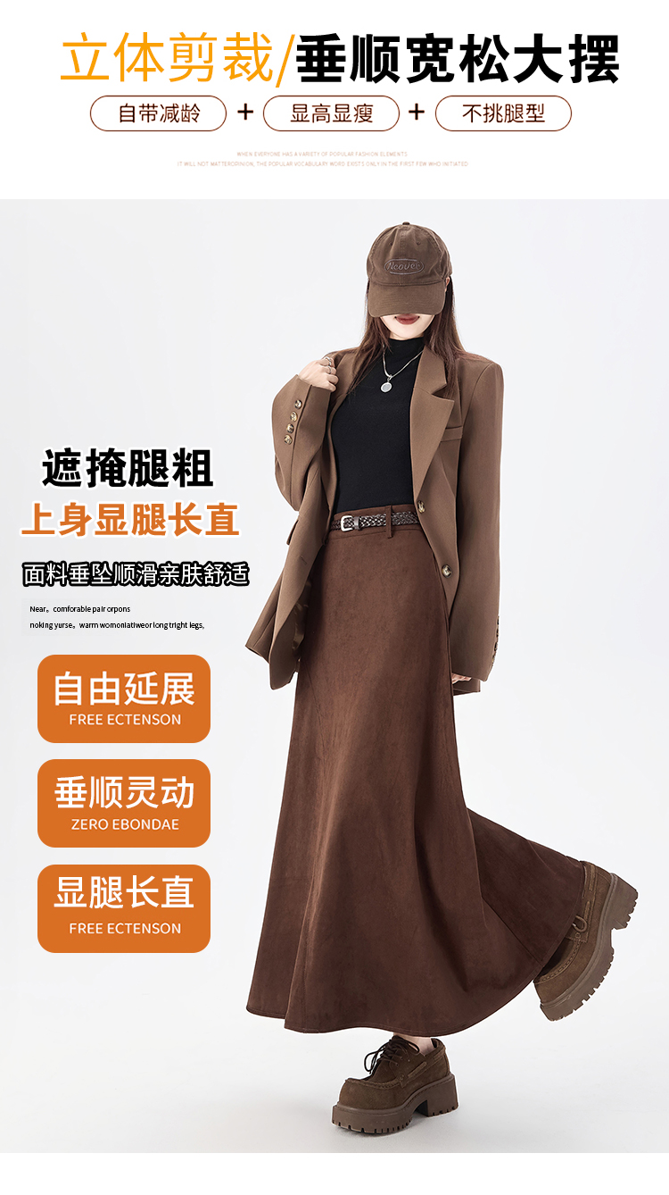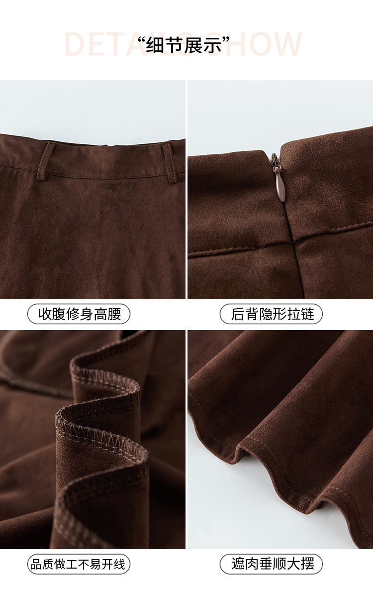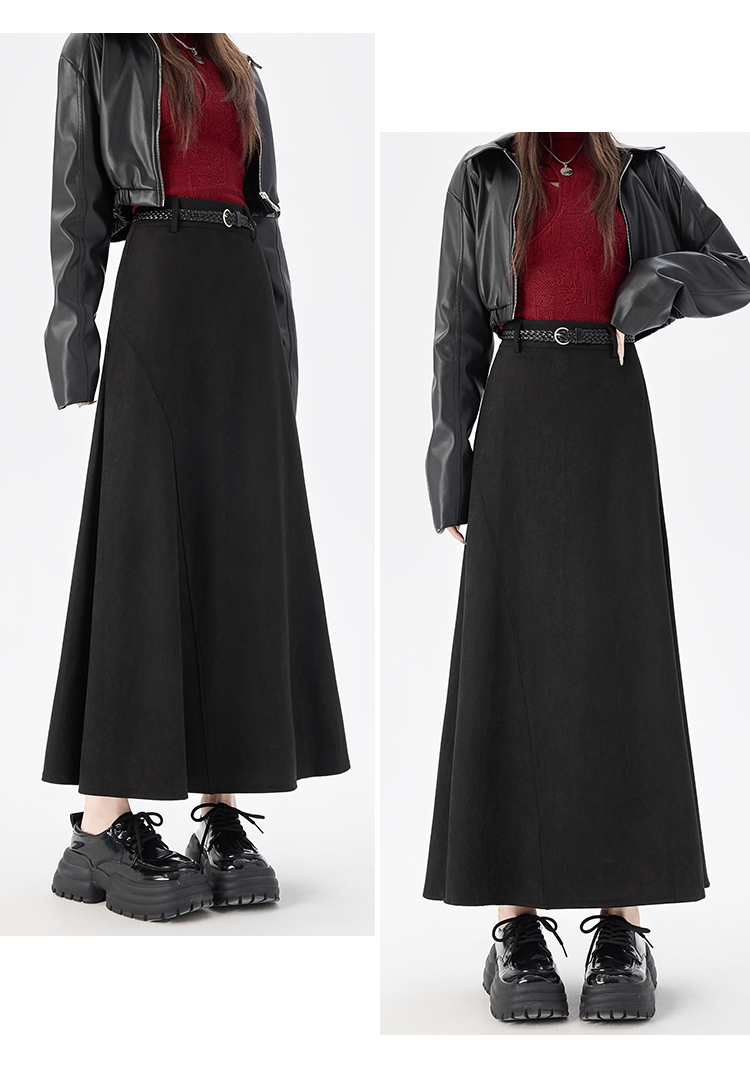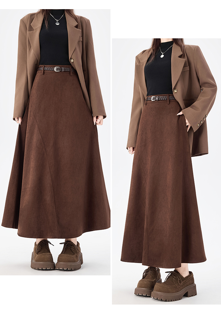 实拍 2025秋冬遮胯显瘦编织腰带设计韩线条麂皮绒中长a字半身伞裙