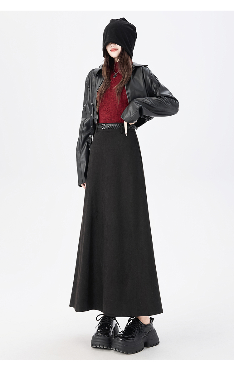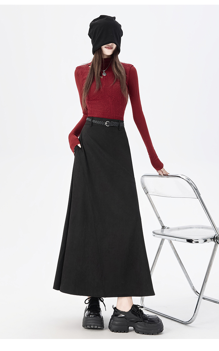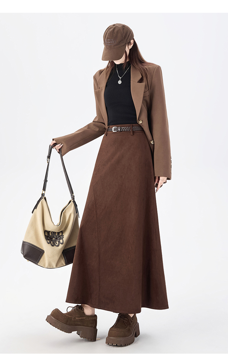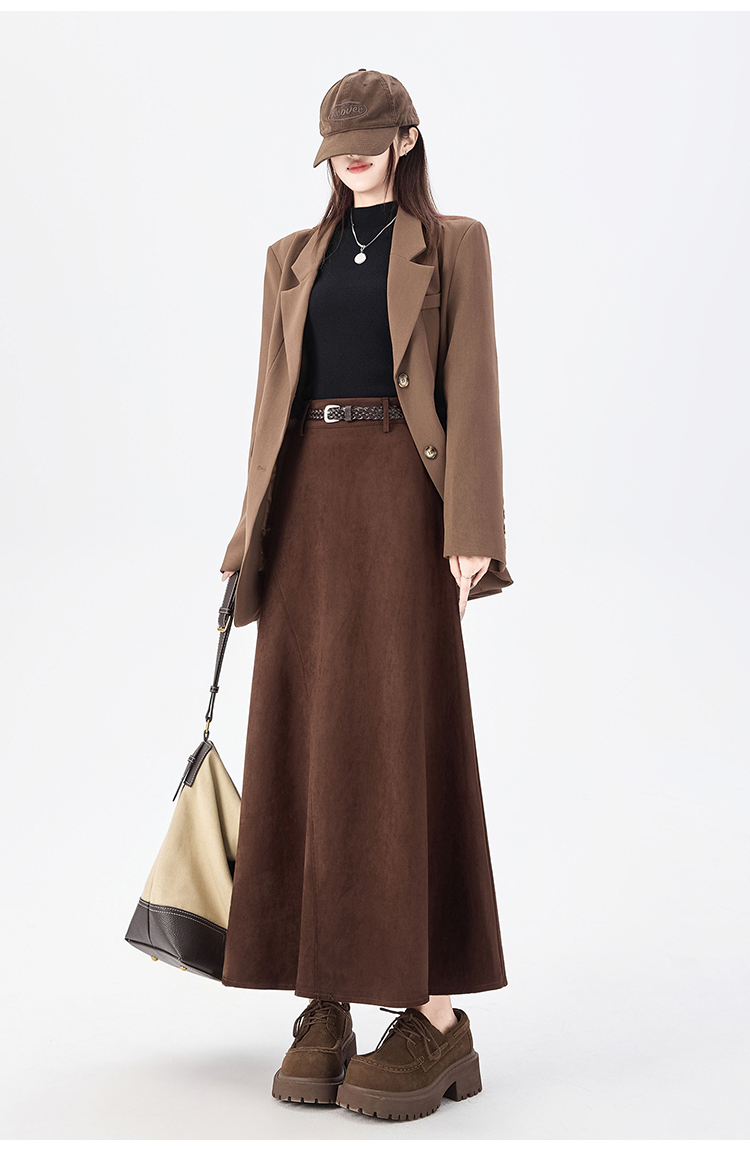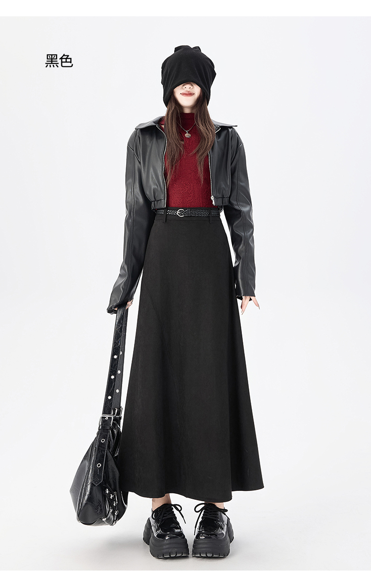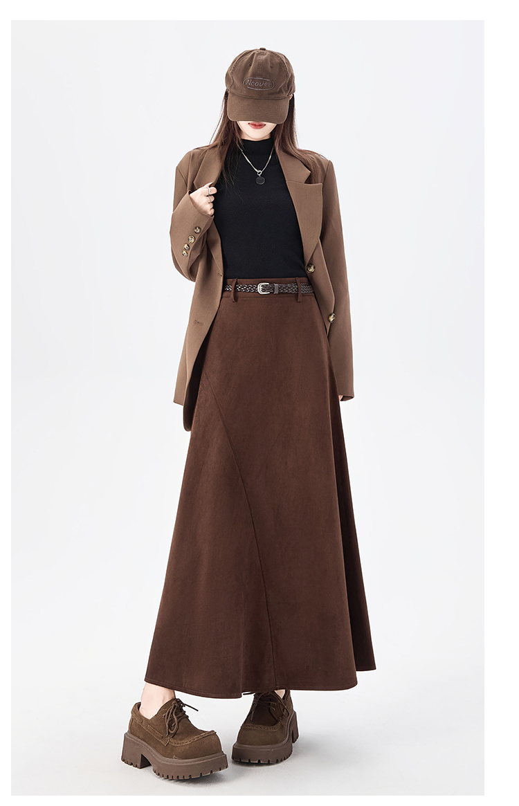 实拍 2025秋冬遮胯显瘦编织腰带设计韩线条麂皮绒中长a字半身伞裙