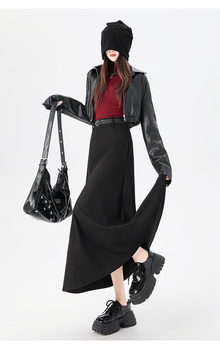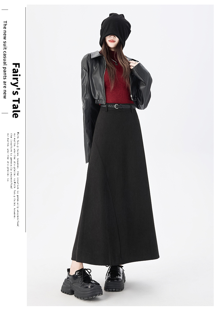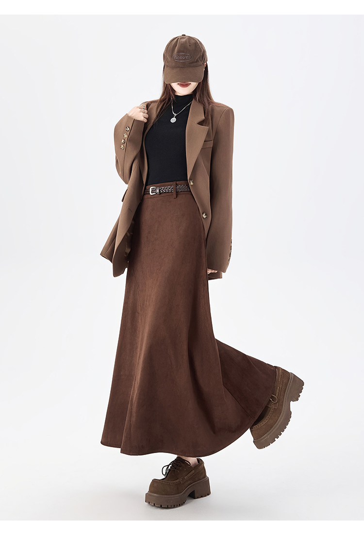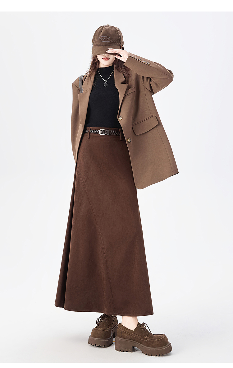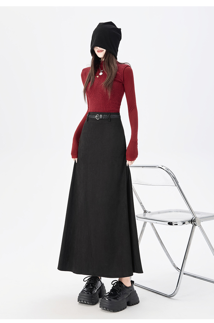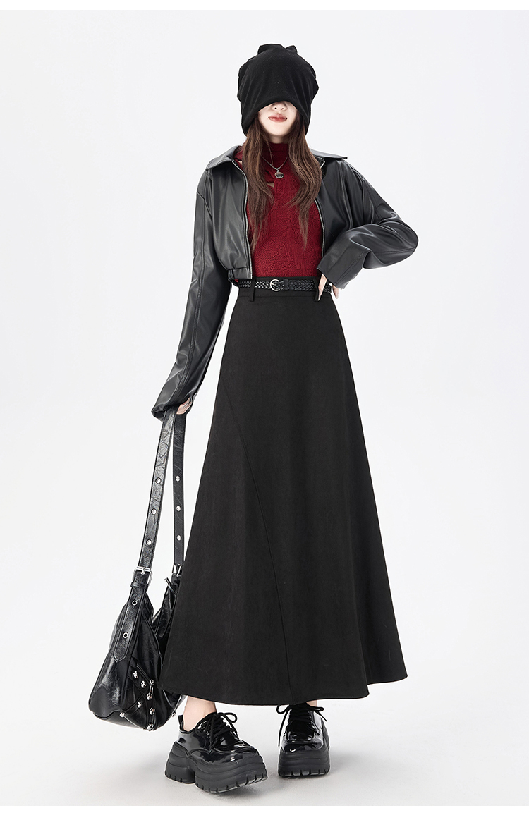 实拍 2025秋冬遮胯显瘦编织腰带设计韩线条麂皮绒中长a字半身伞裙