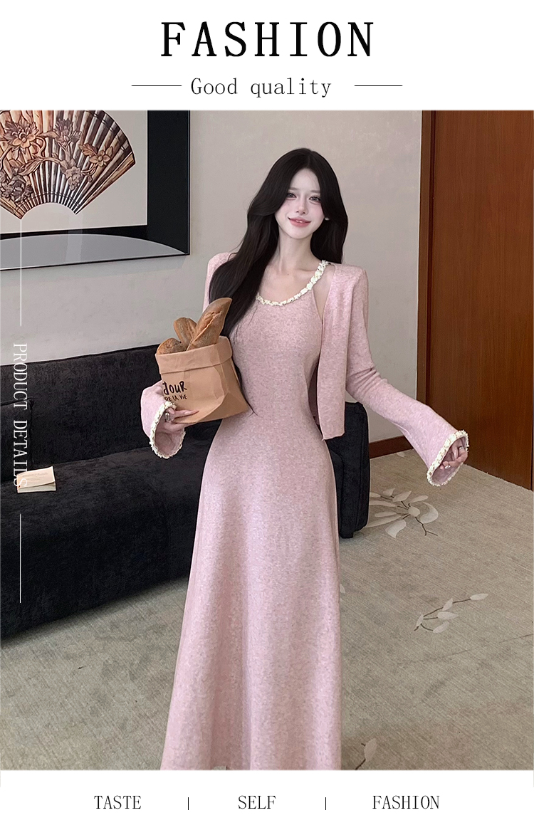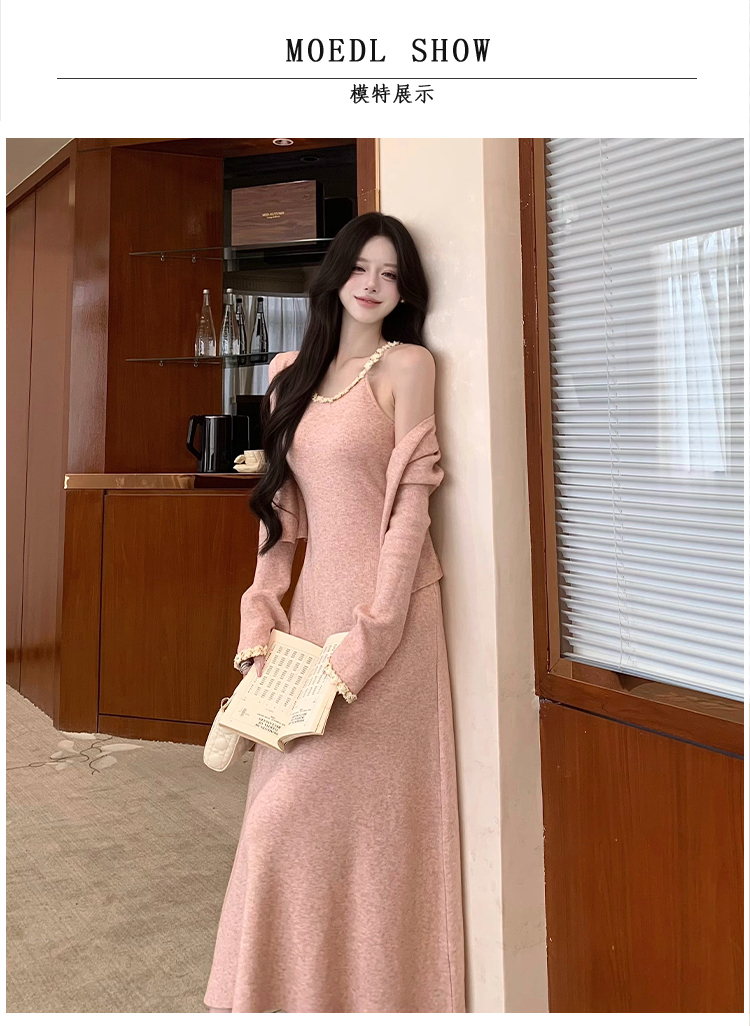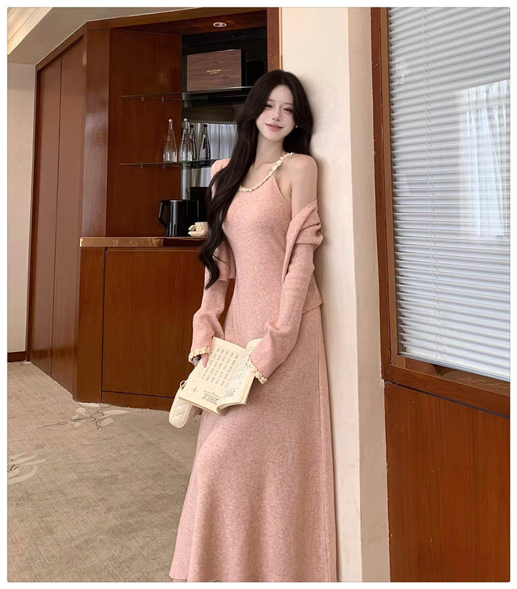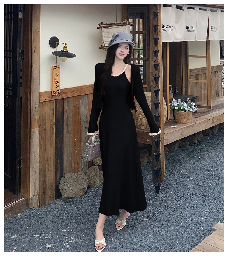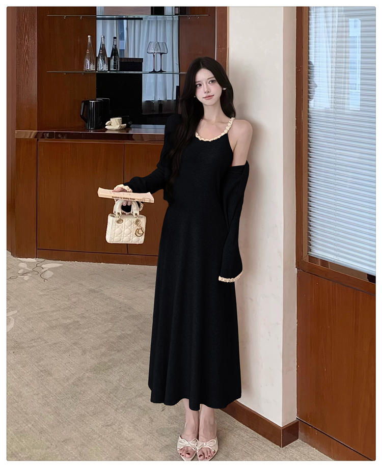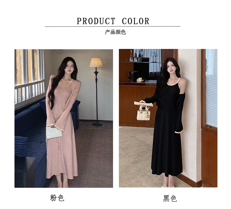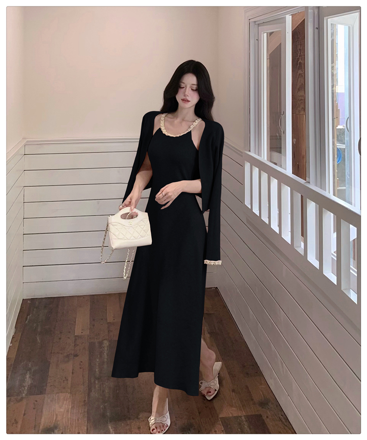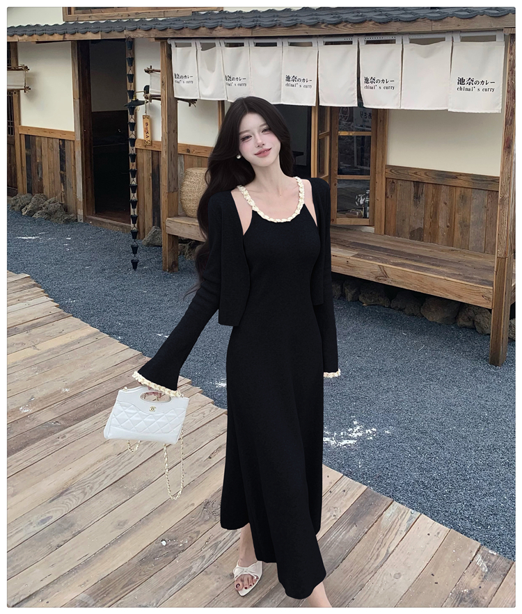 小香风链条吊带针织套装连衣裙女秋冬纯欲风修身A字长裙两件套