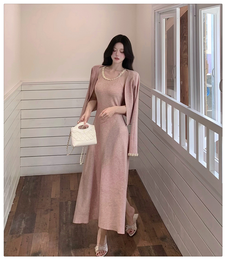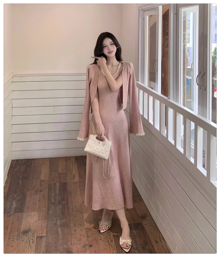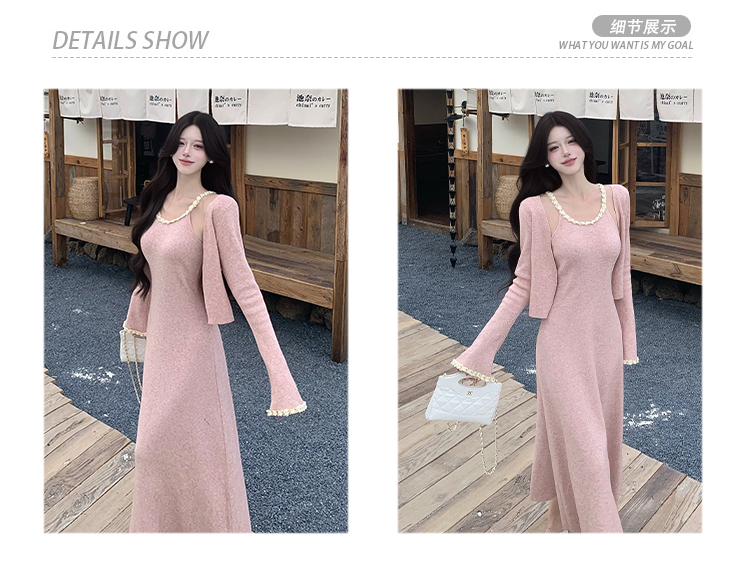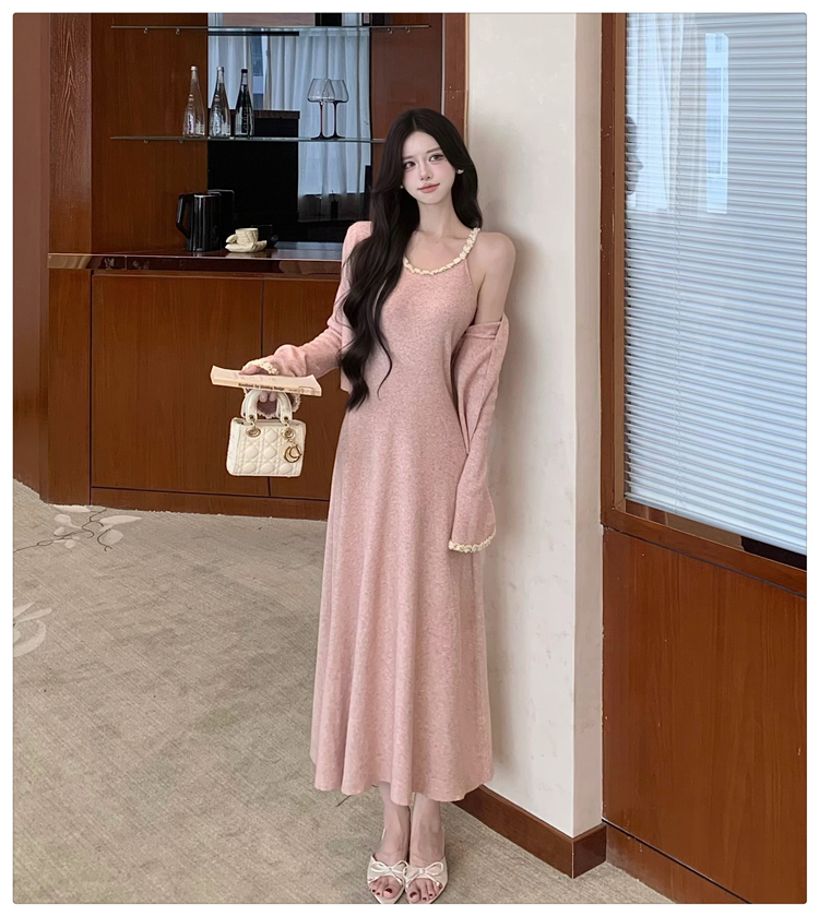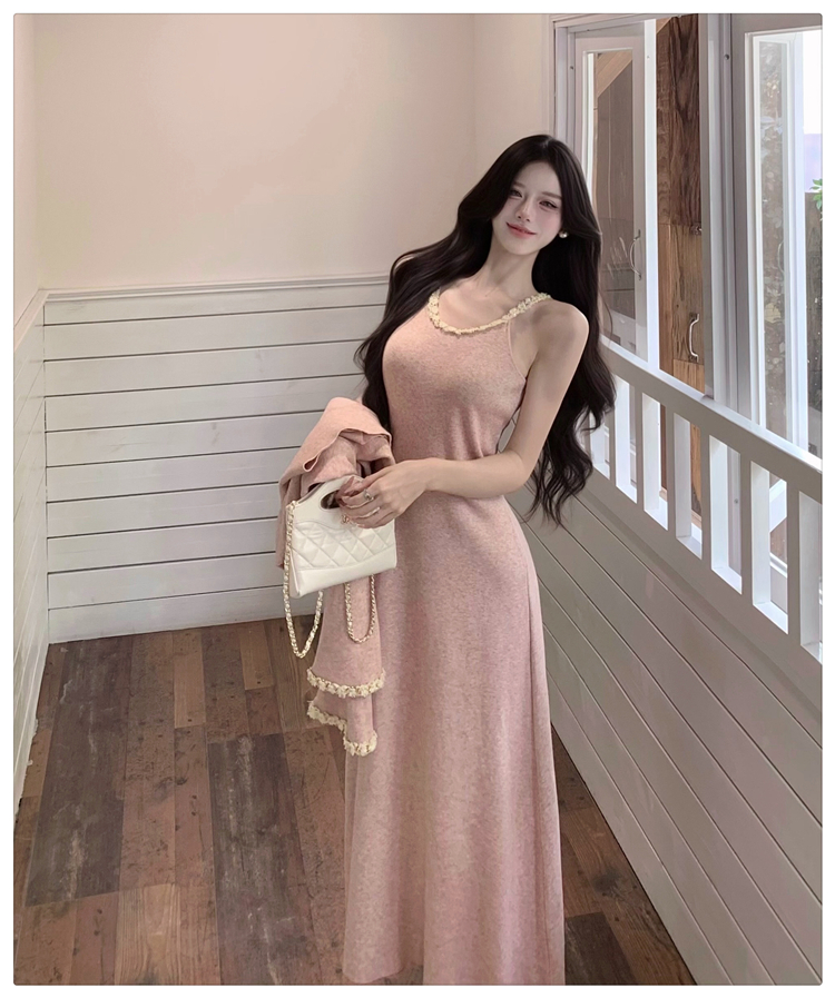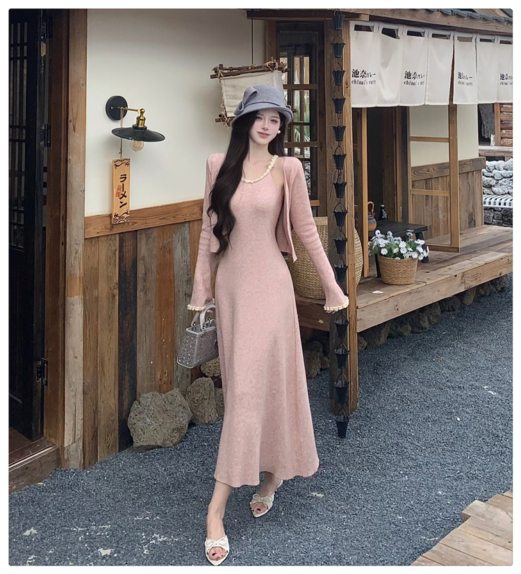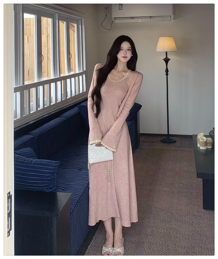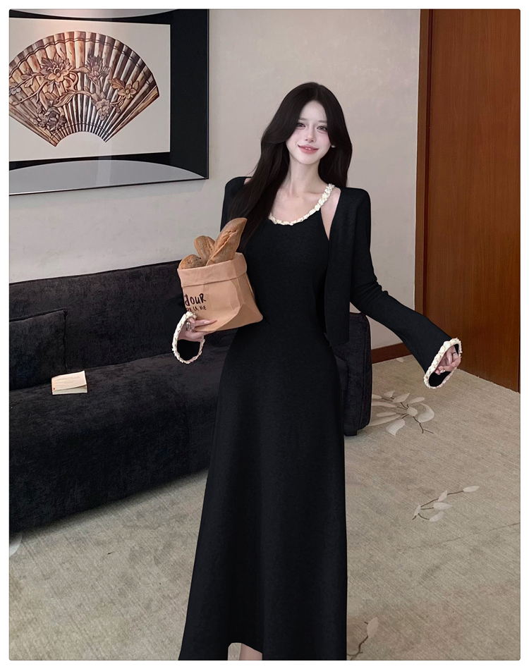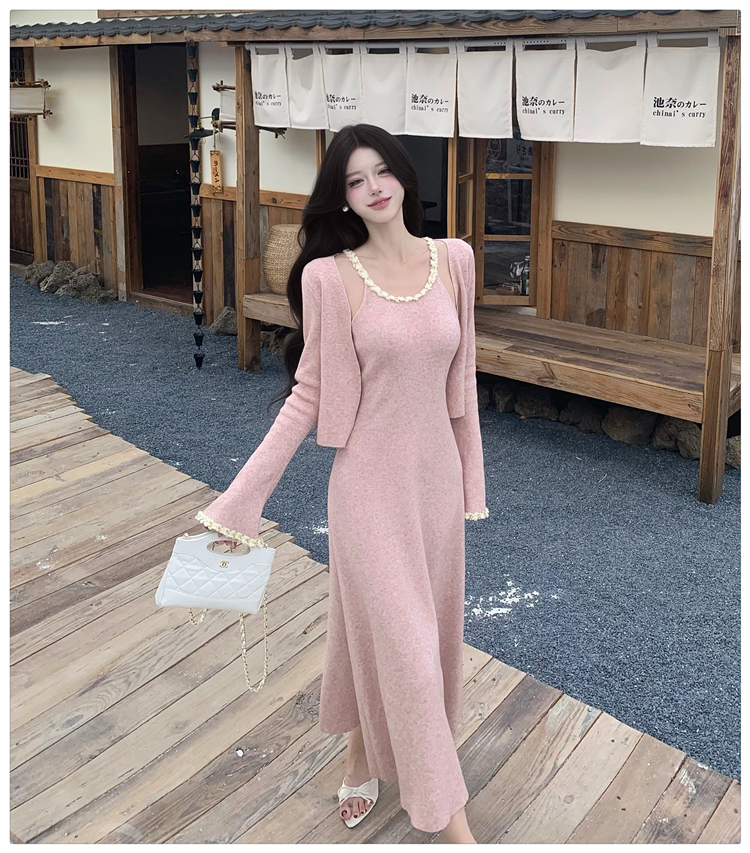 小香风链条吊带针织套装连衣裙女秋冬纯欲风修身A字长裙两件套