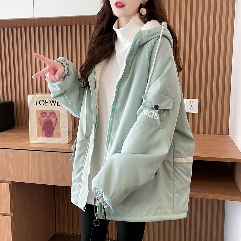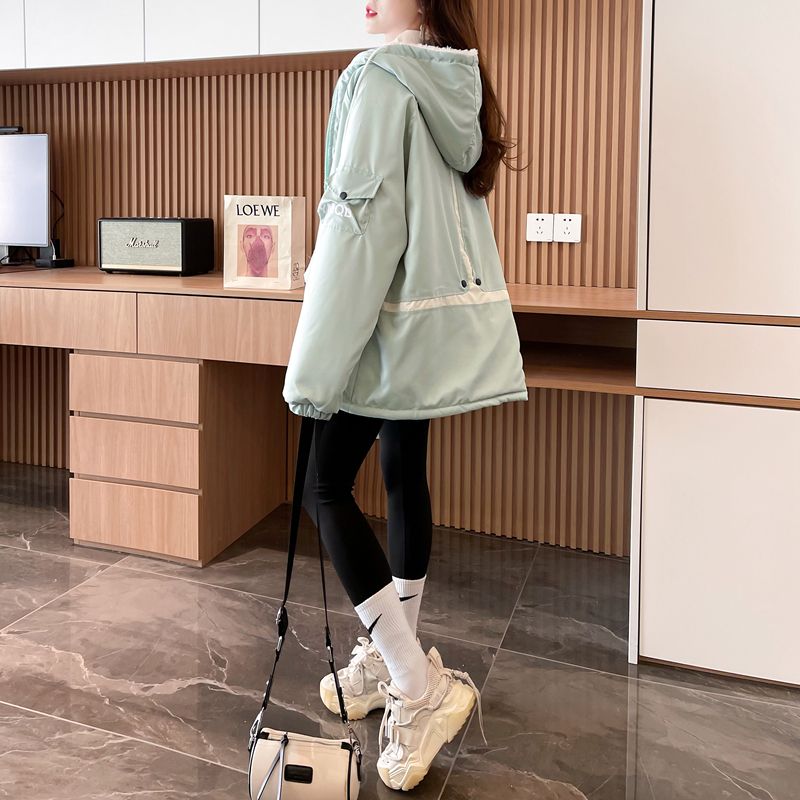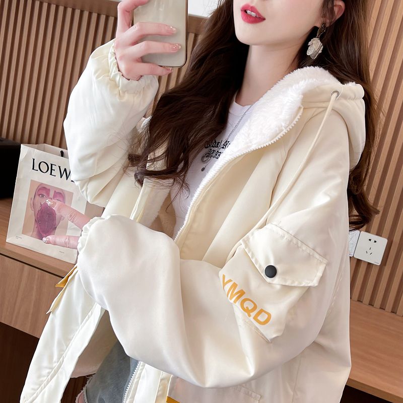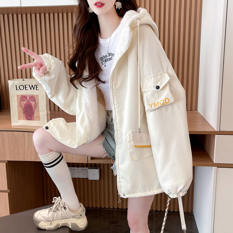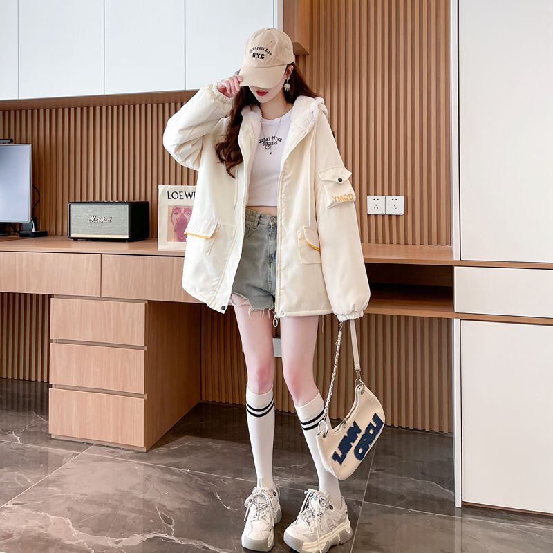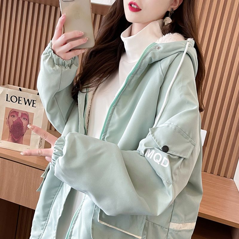 实拍外小牛津内冰岛绒加绒加厚连帽工装外套女秋冬季新款