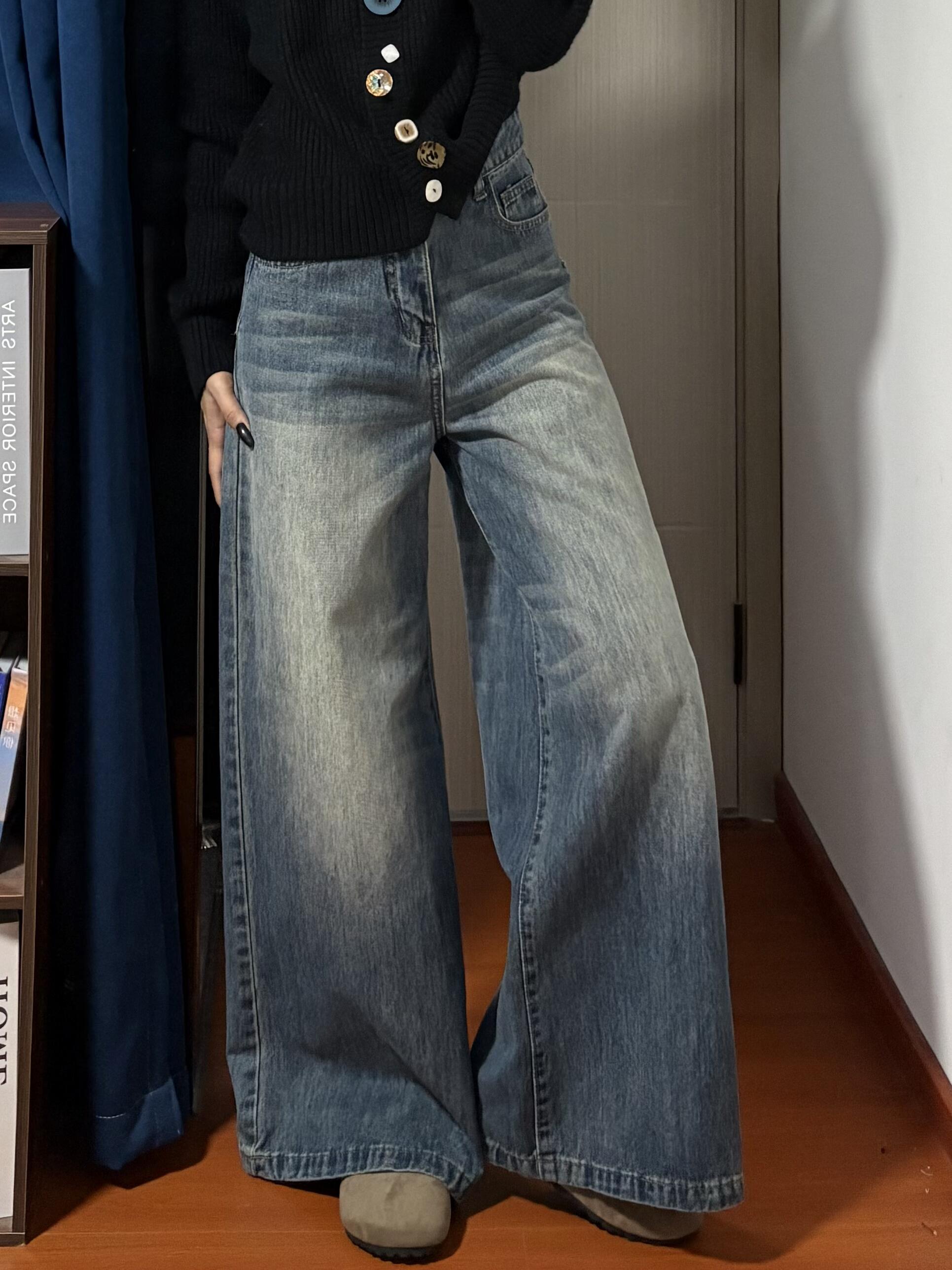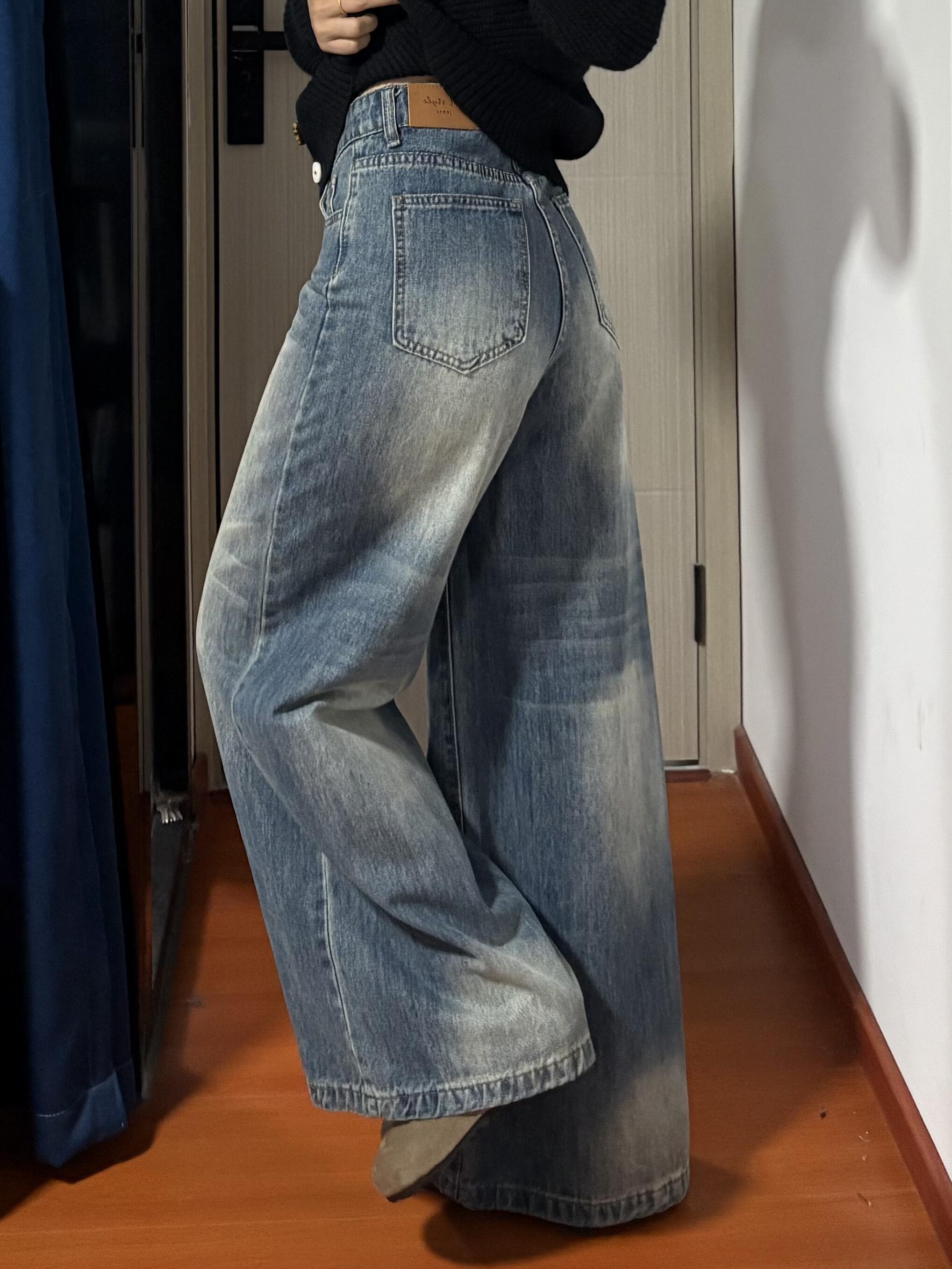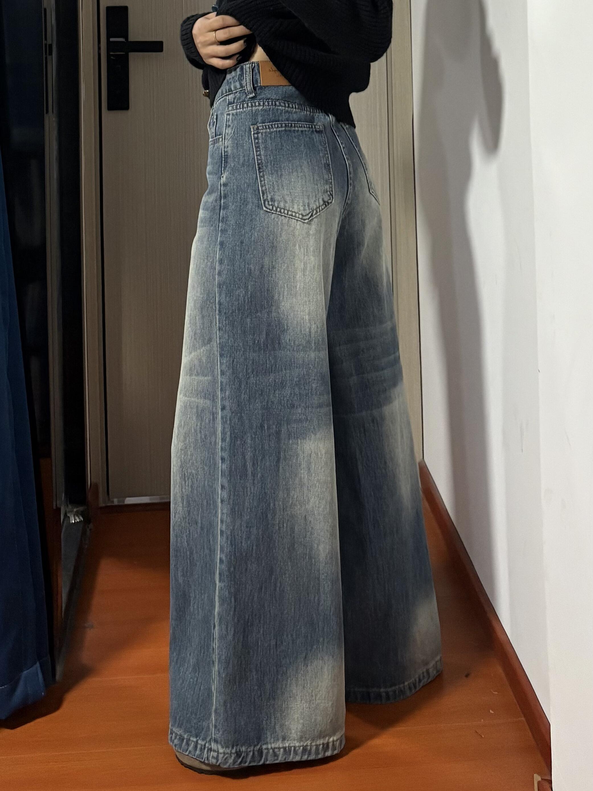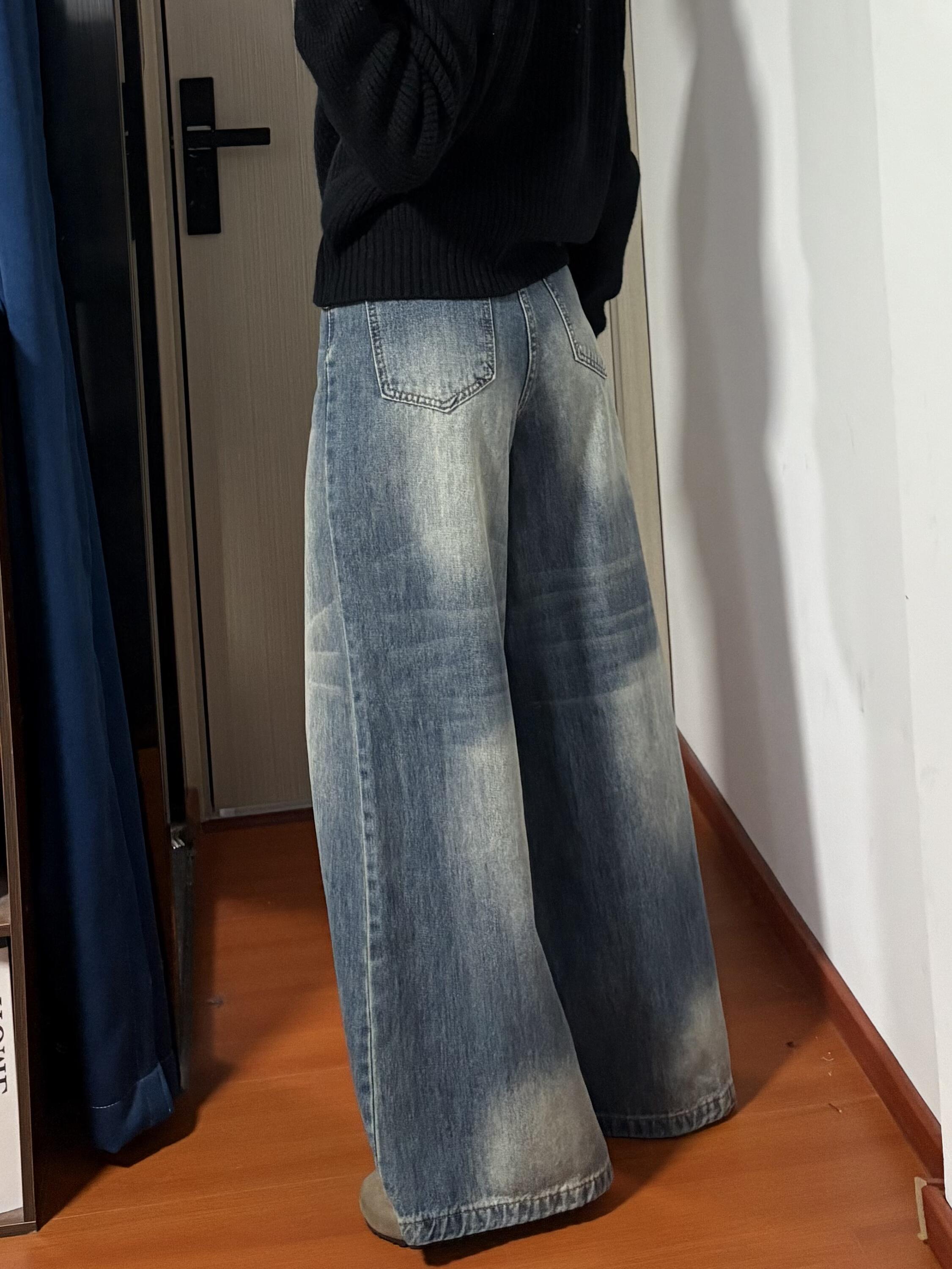 复古水洗直筒牛仔裤女款2025秋季新款宽松慵懒松弛阔腿拖地长裤潮