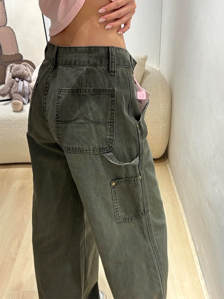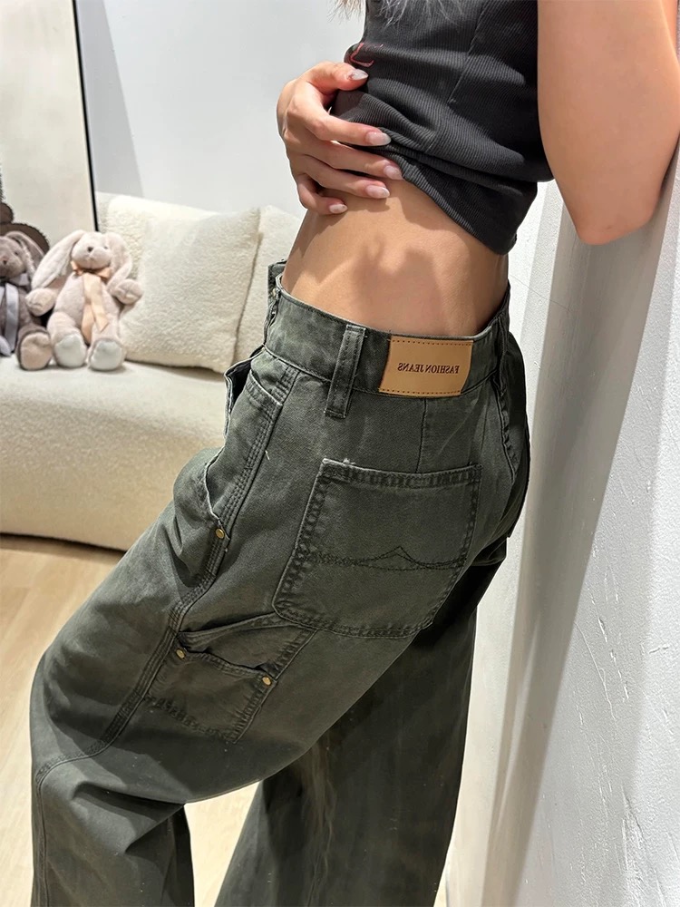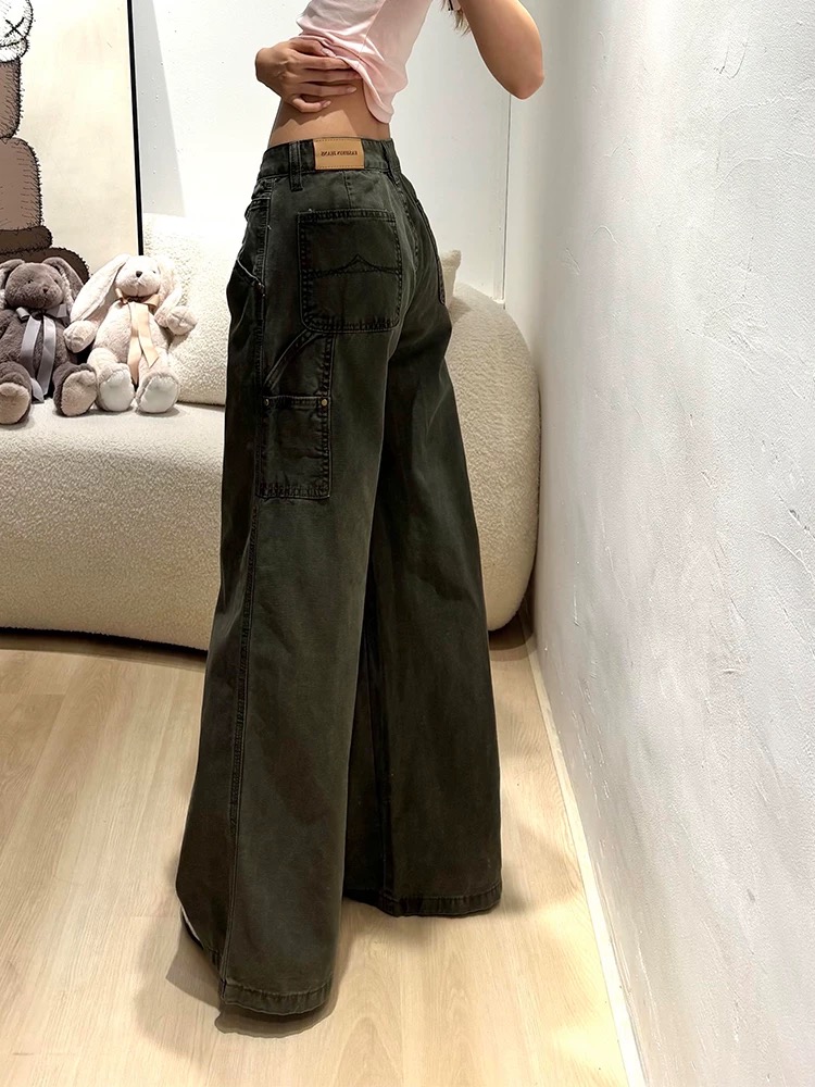 美式军绿色工装裤女新款多口袋复古休闲阔腿宽松直筒微喇牛仔裤子