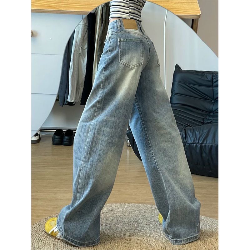 小个子美式弯刀竹节纹阔腿牛仔裤女秋季新款高腰显瘦直筒拖地裤潮