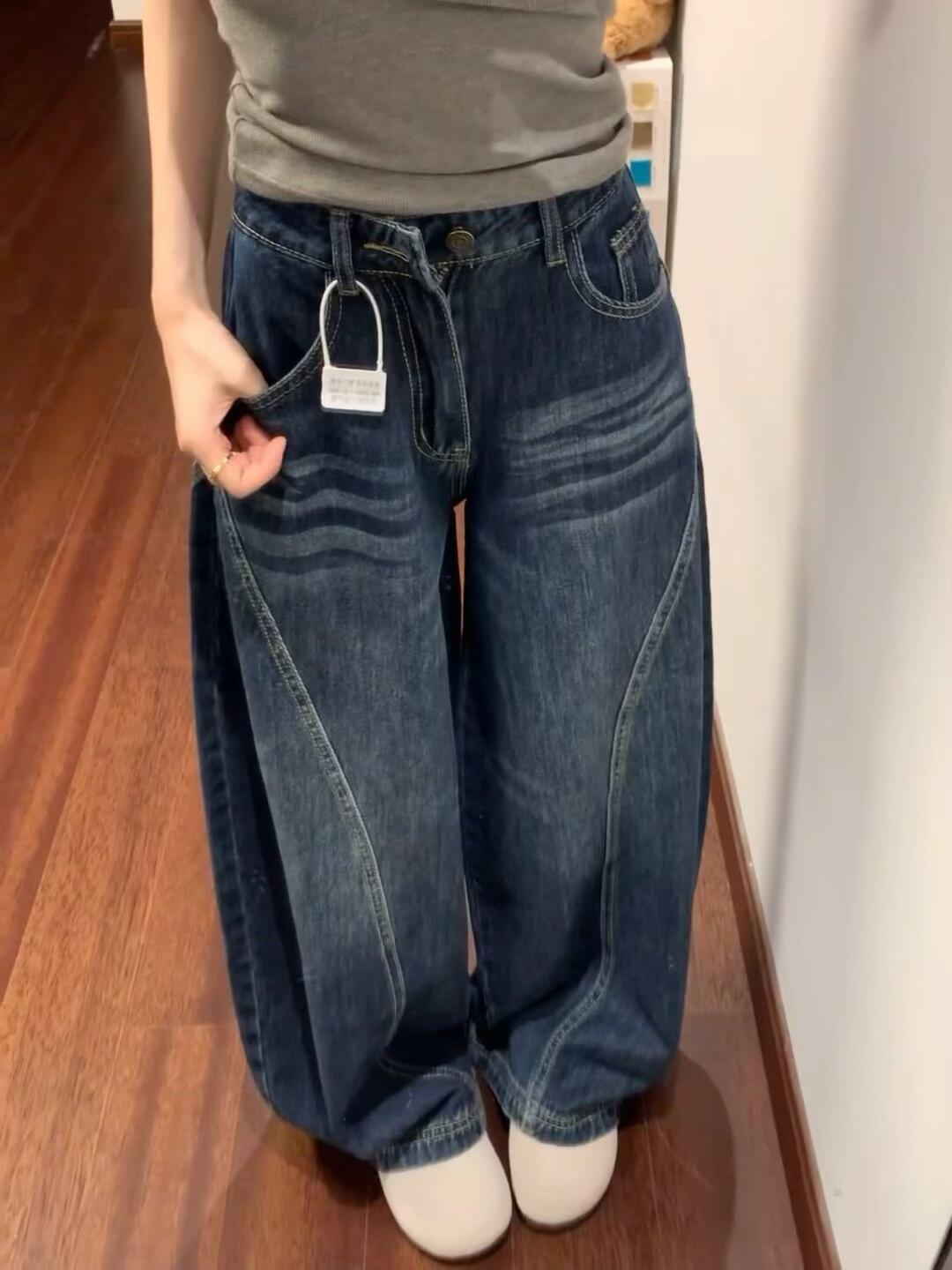 小个子美式复古水洗弯刀阔腿牛仔裤女秋季高腰显瘦宽松垂感拖地裤