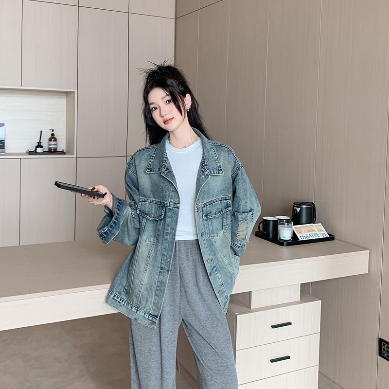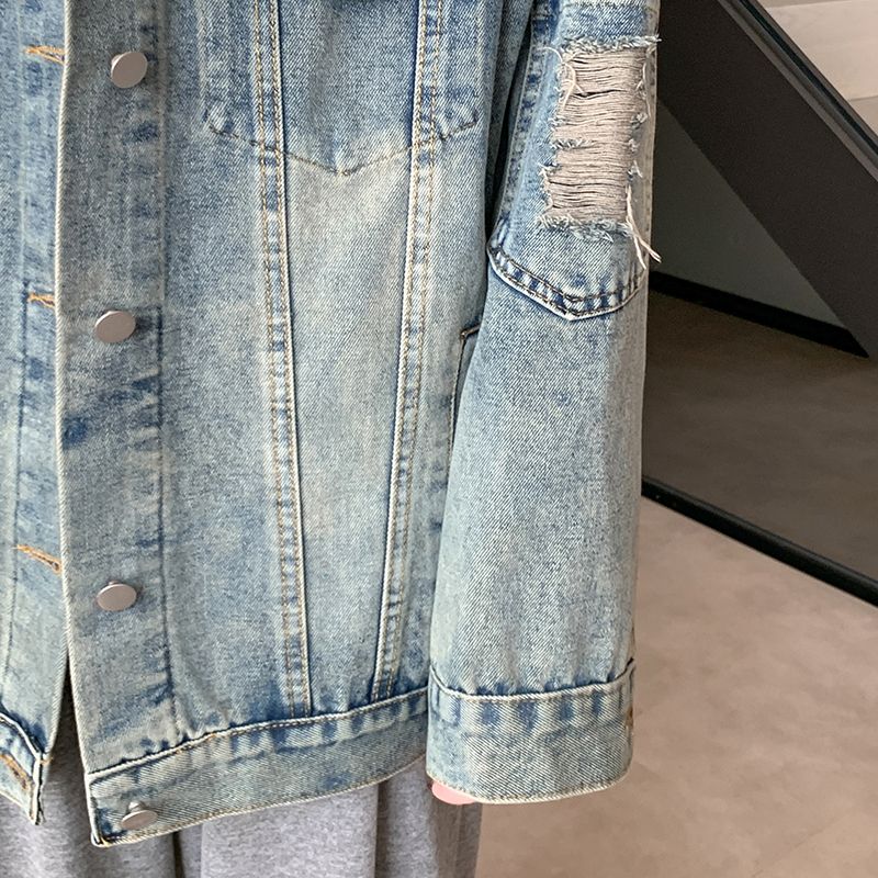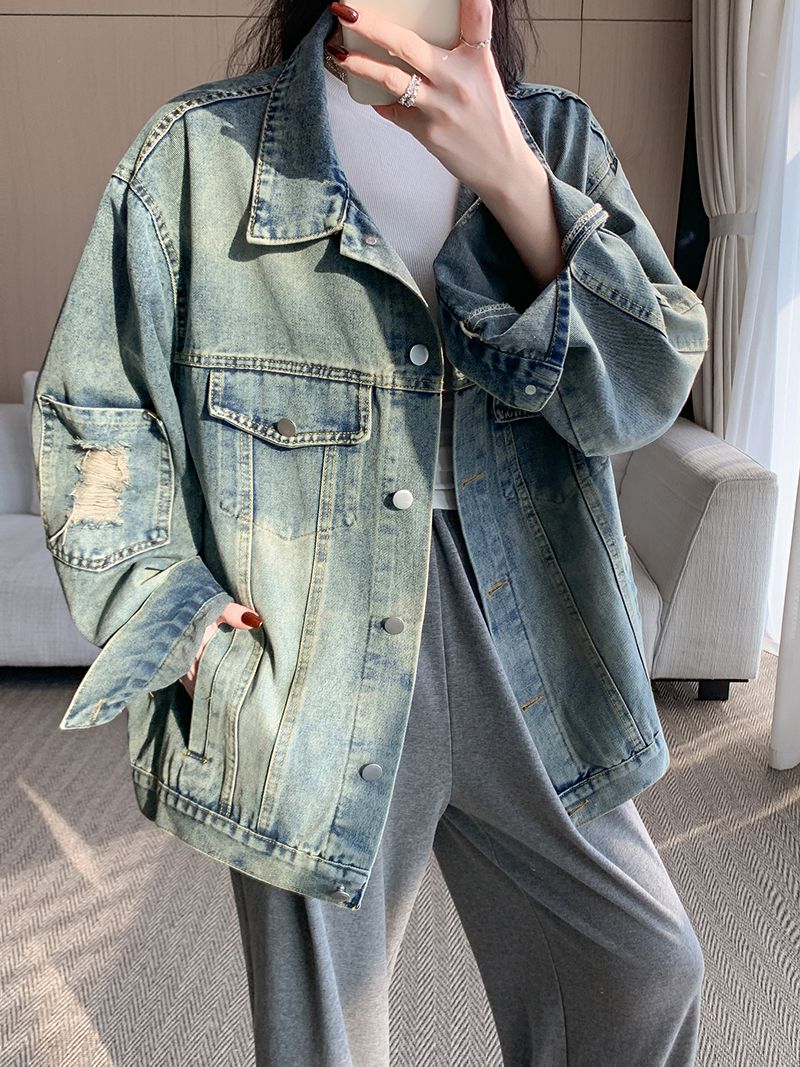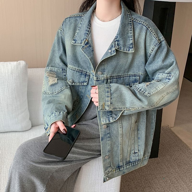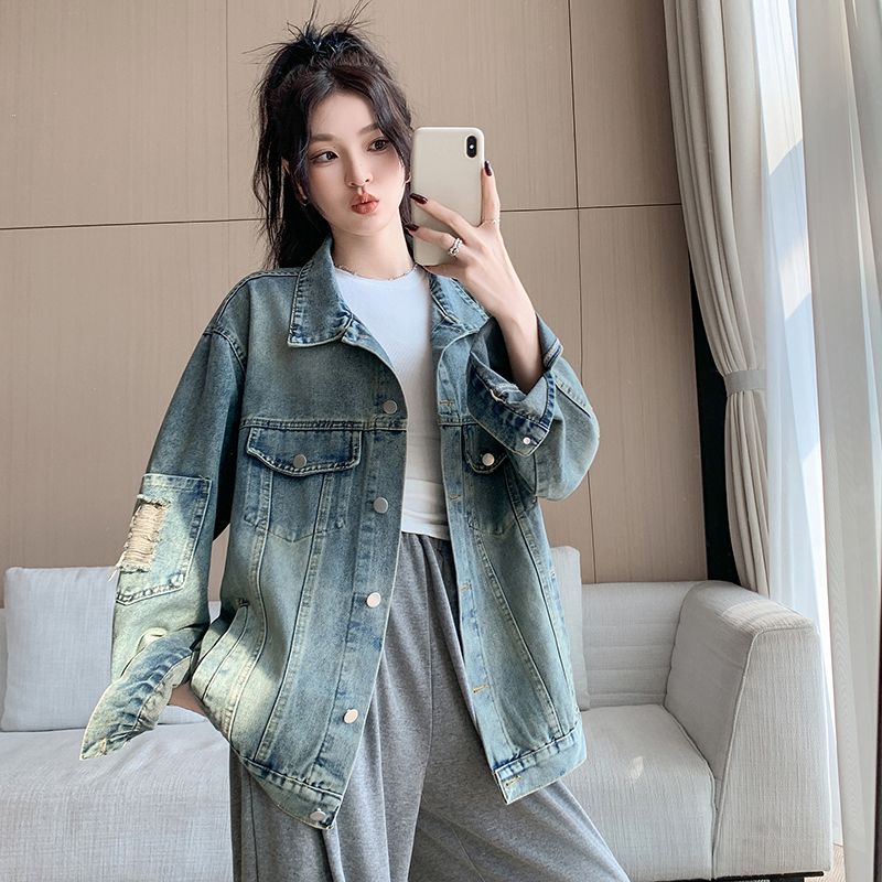 实拍实价~复古做旧破洞牛仔外套女秋季中长款宽松显瘦百搭上衣潮