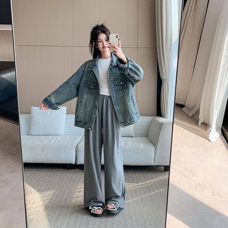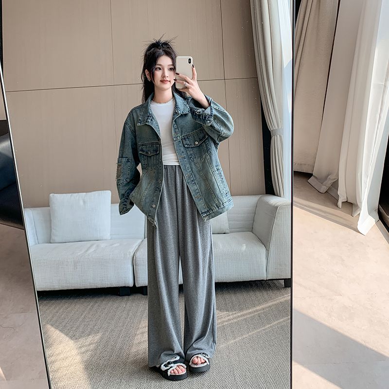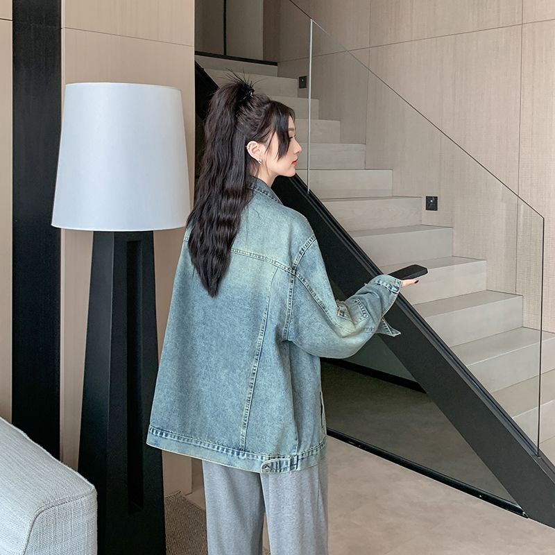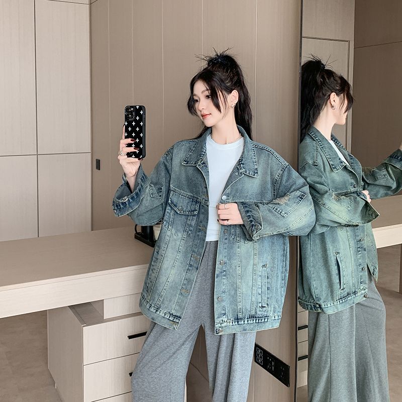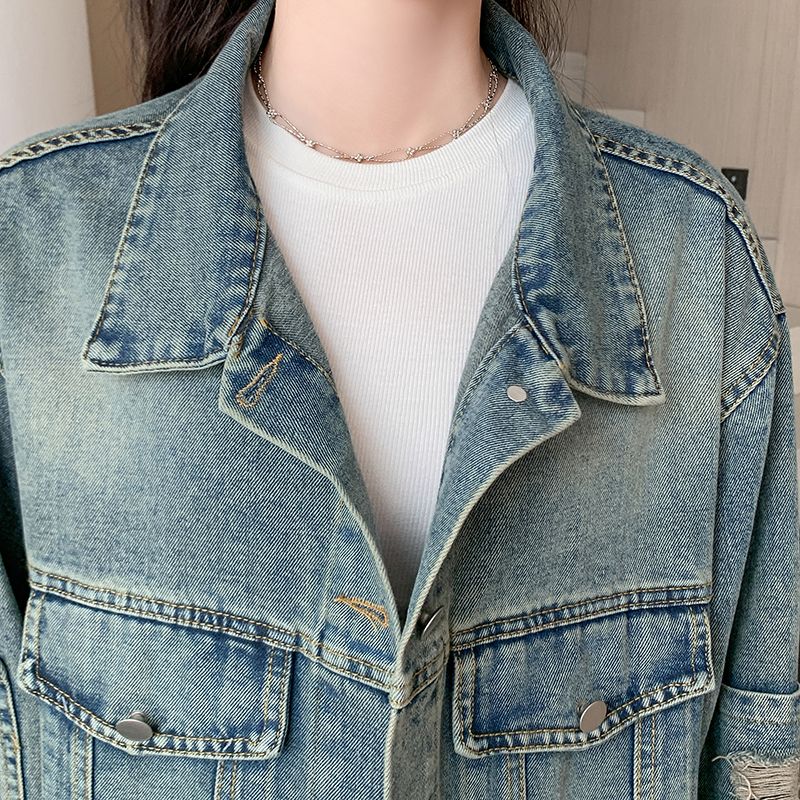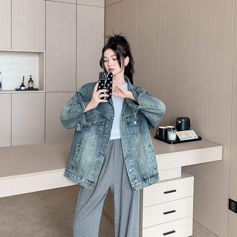 实拍实价~复古做旧破洞牛仔外套女秋季中长款宽松显瘦百搭上衣潮