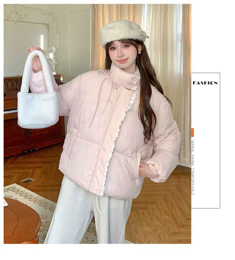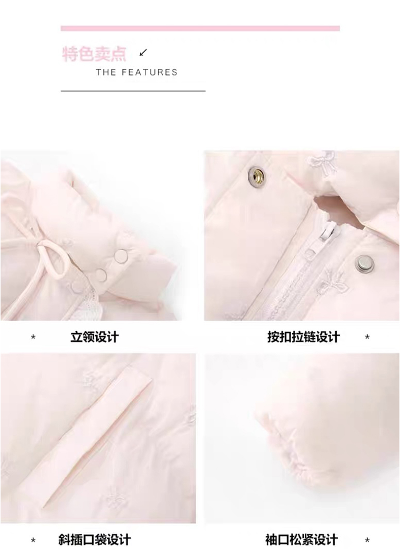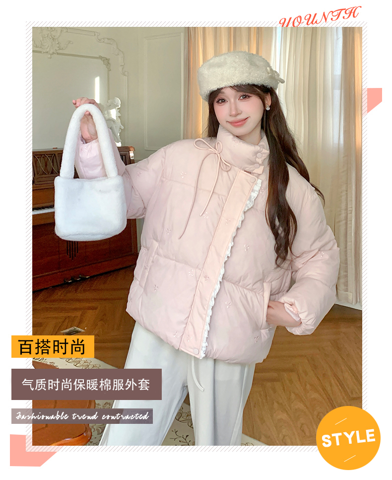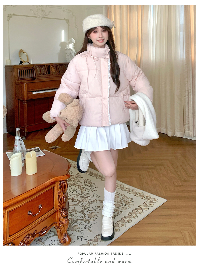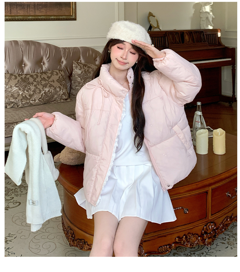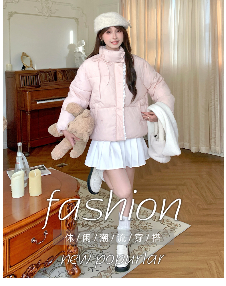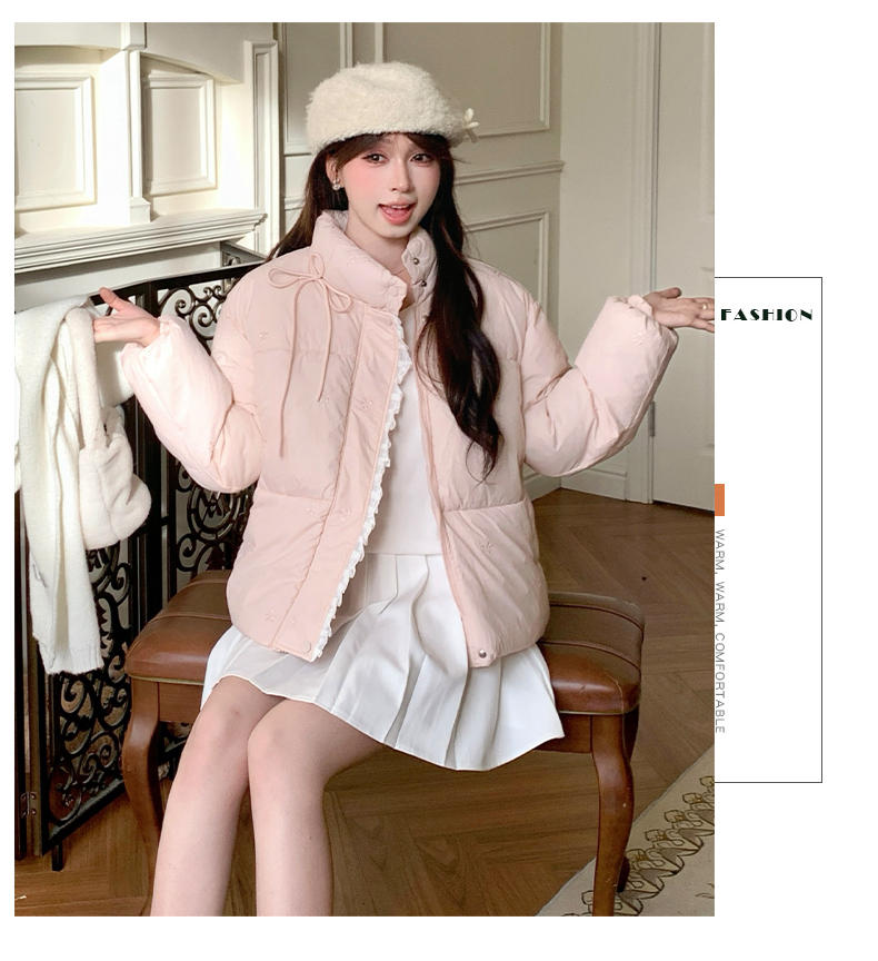 实拍韩版甜美粉色蝴蝶结立领棉服女新款小个子加厚面包服棉衣外套