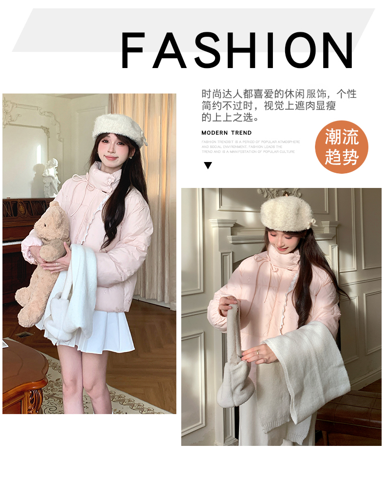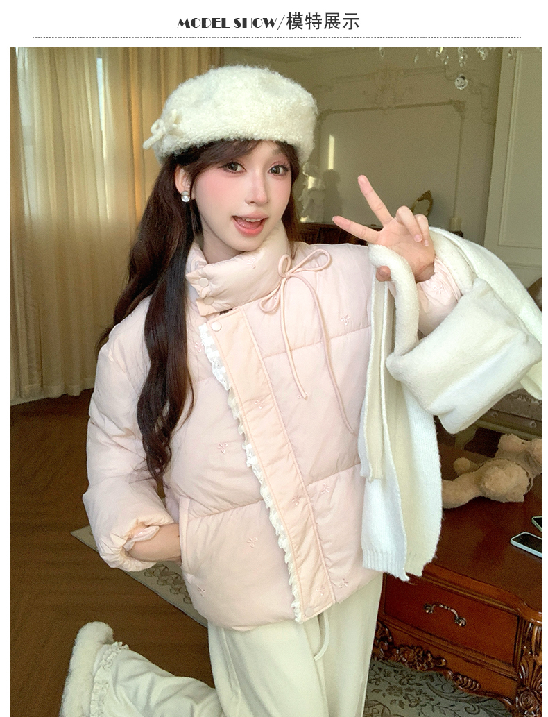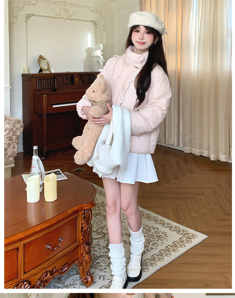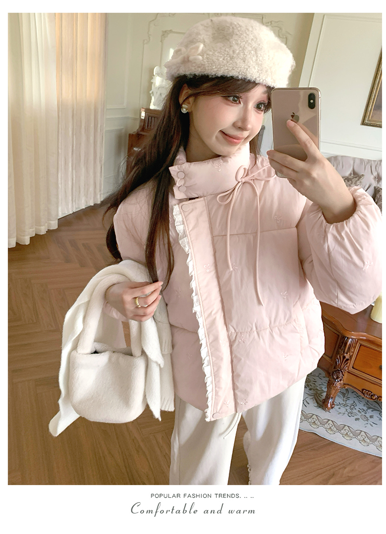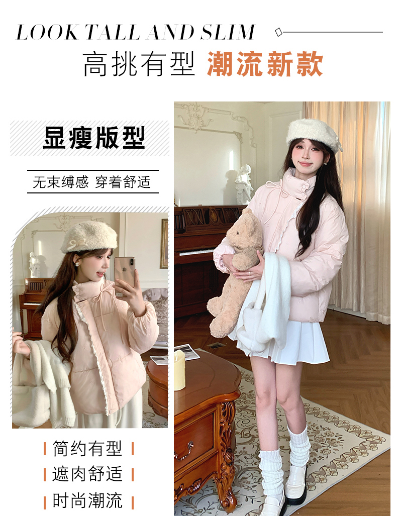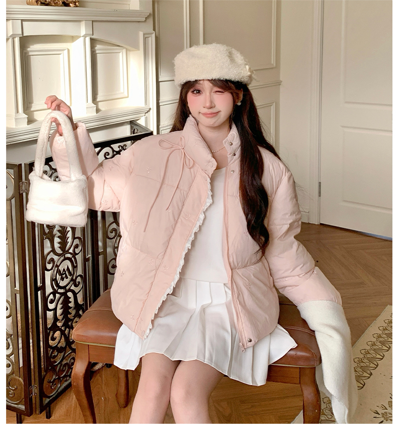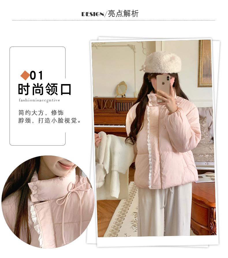 实拍韩版甜美粉色蝴蝶结立领棉服女新款小个子加厚面包服棉衣外套