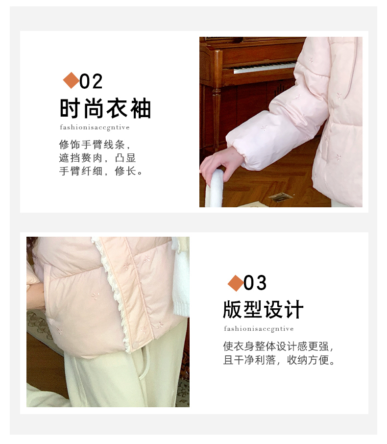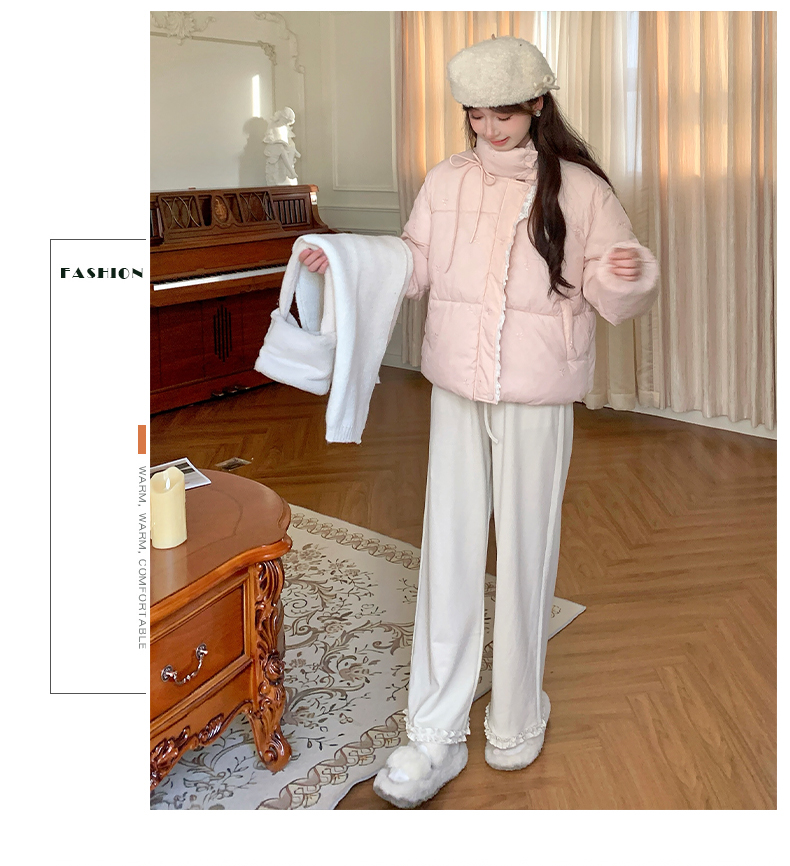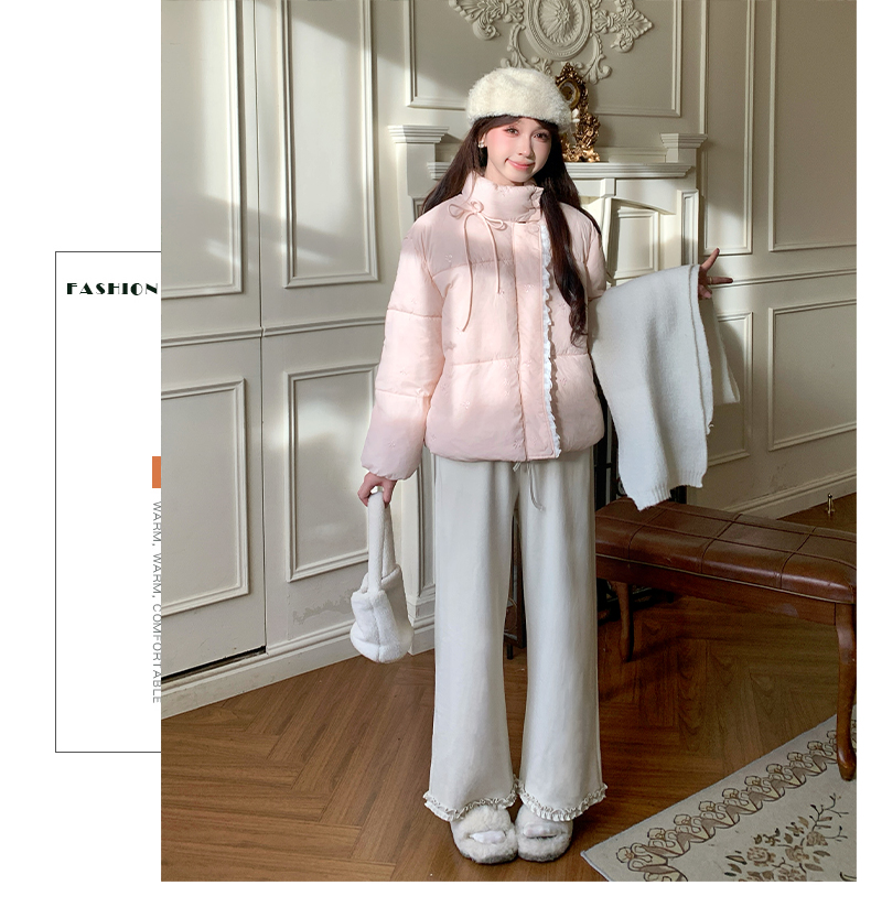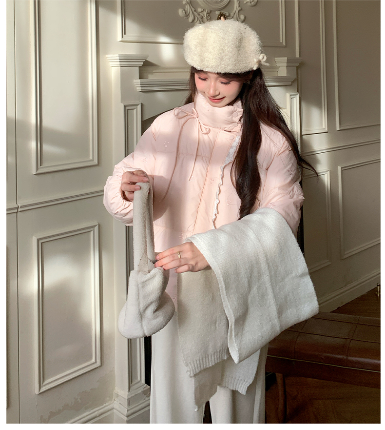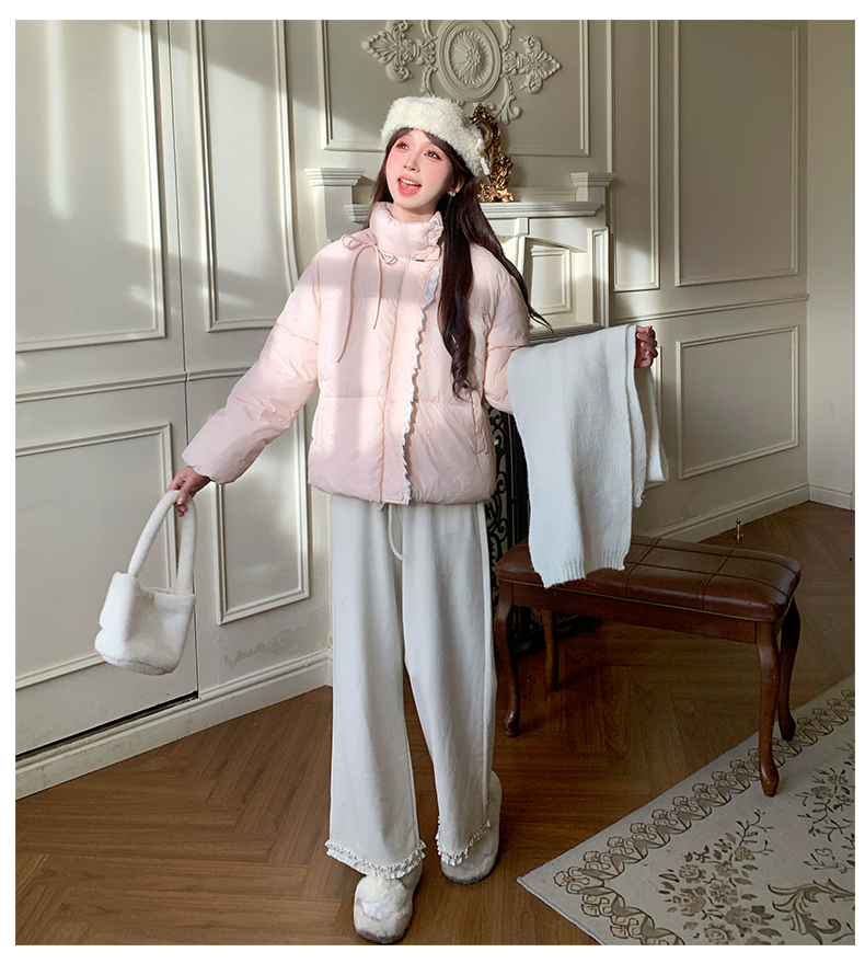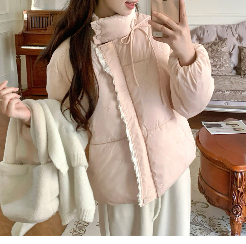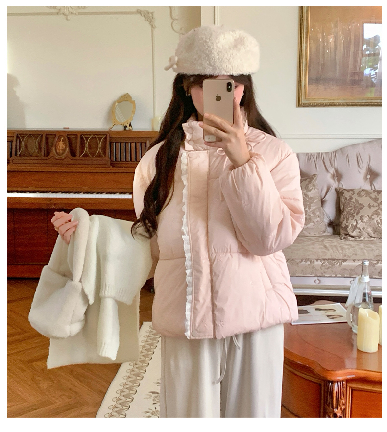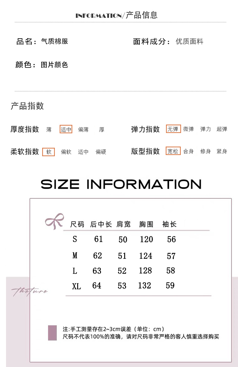 实拍韩版甜美粉色蝴蝶结立领棉服女新款小个子加厚面包服棉衣外套