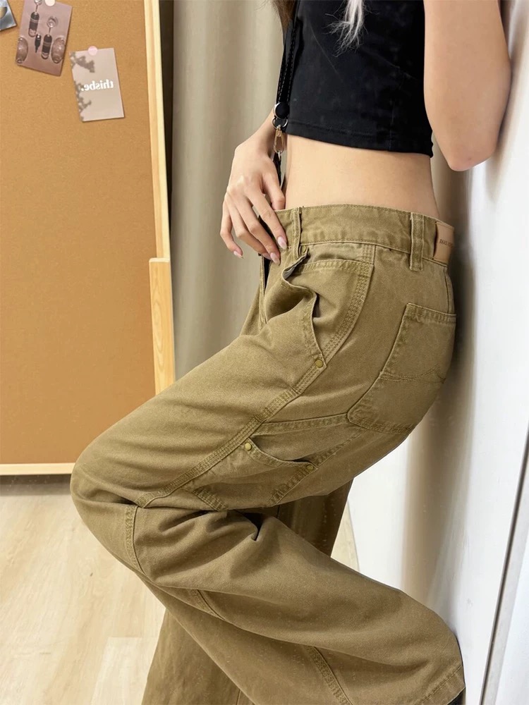 美式复古卡其色工装牛仔裤女秋季新款高腰宽松垂感直筒阔腿拖地裤