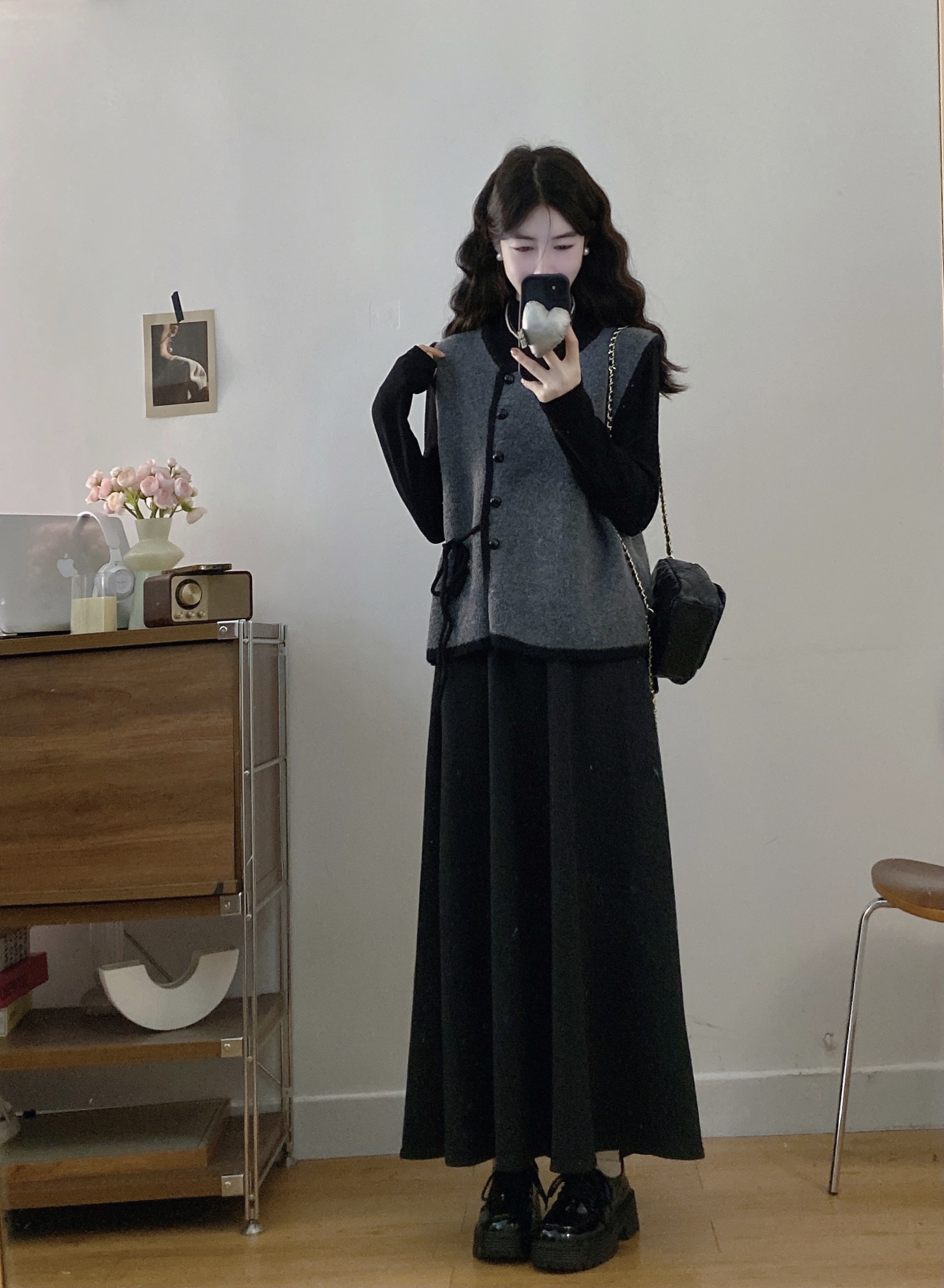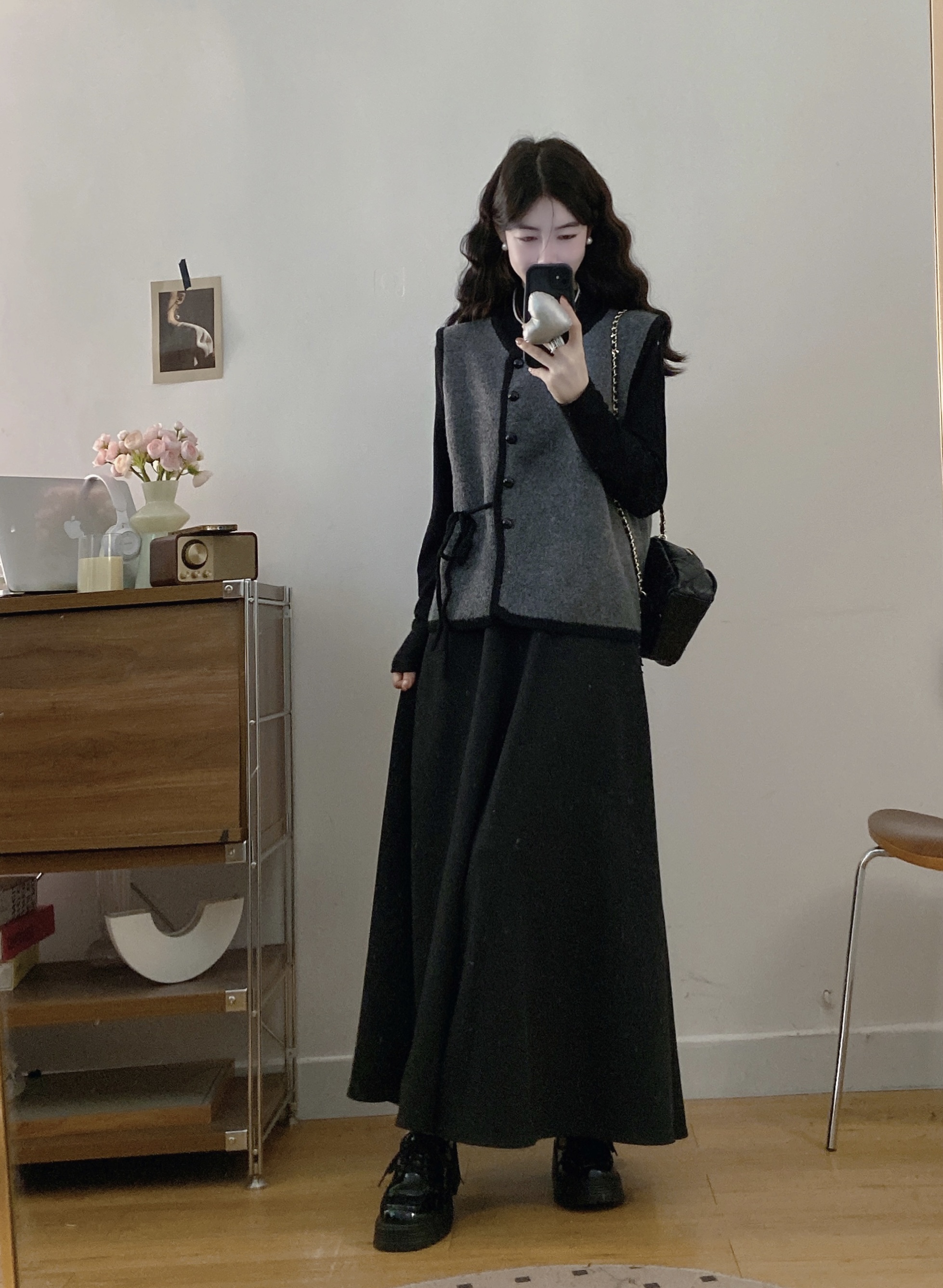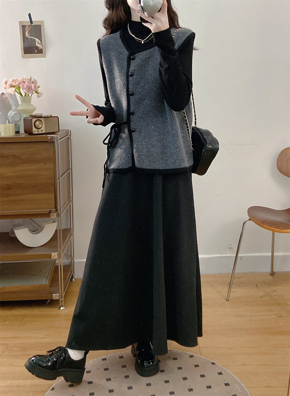 实拍~大码法式小香风针织马甲背心+长袖打底衫+半身裙三件套