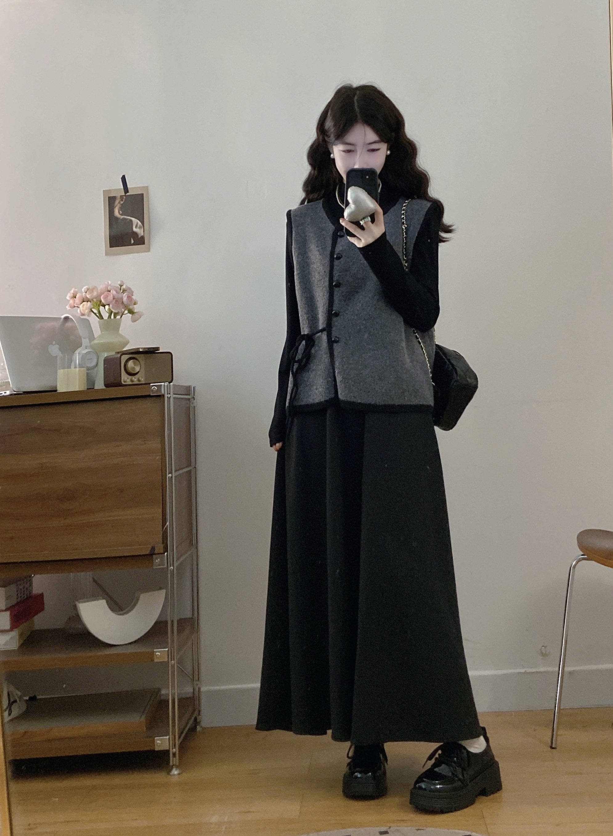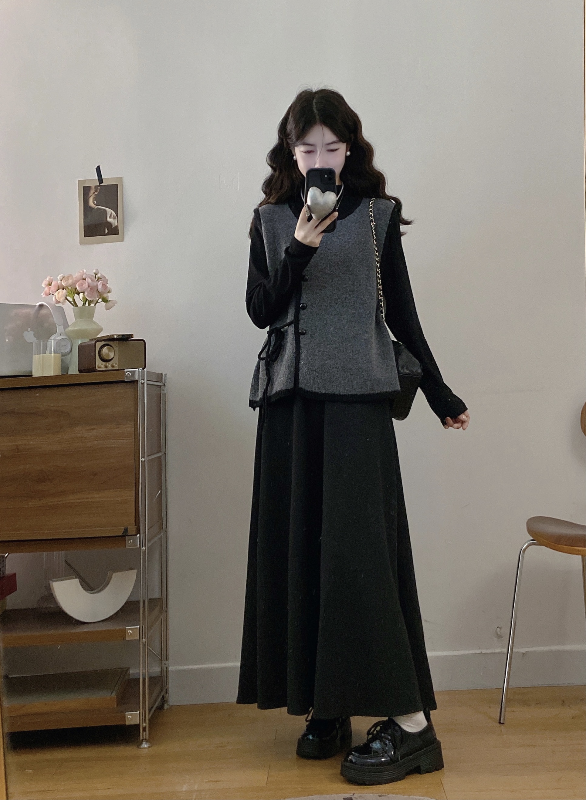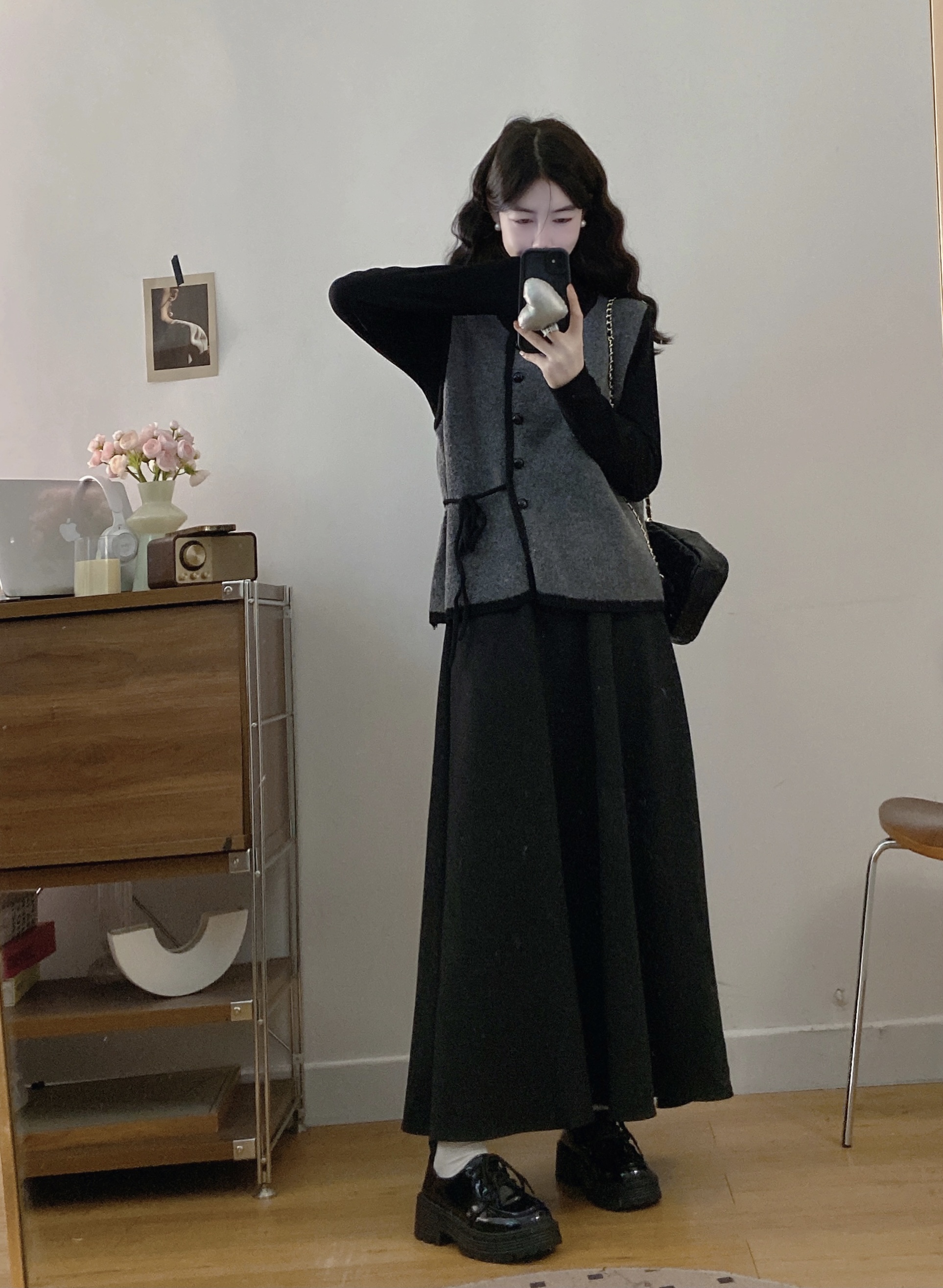实拍~大码法式小香风针织马甲背心+长袖打底衫+半身裙三件套