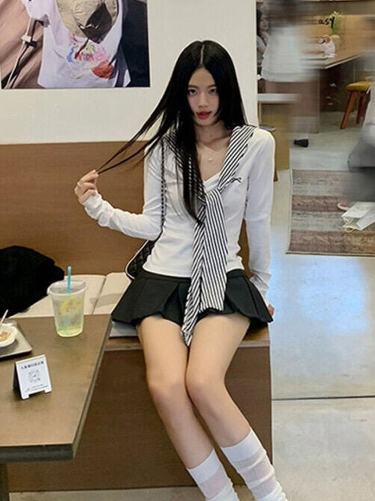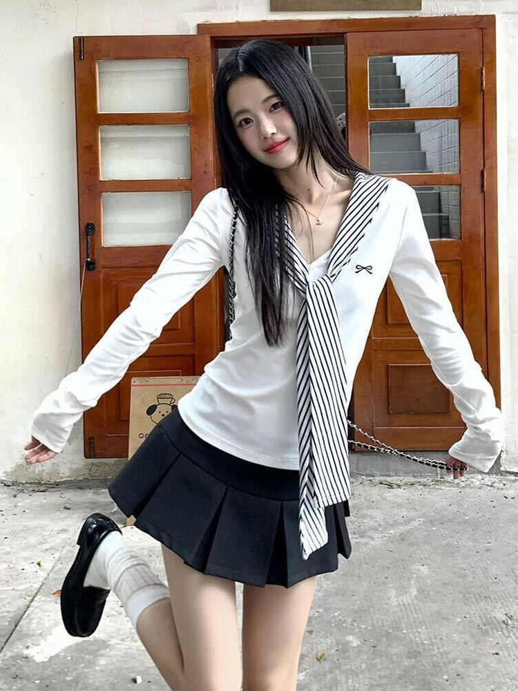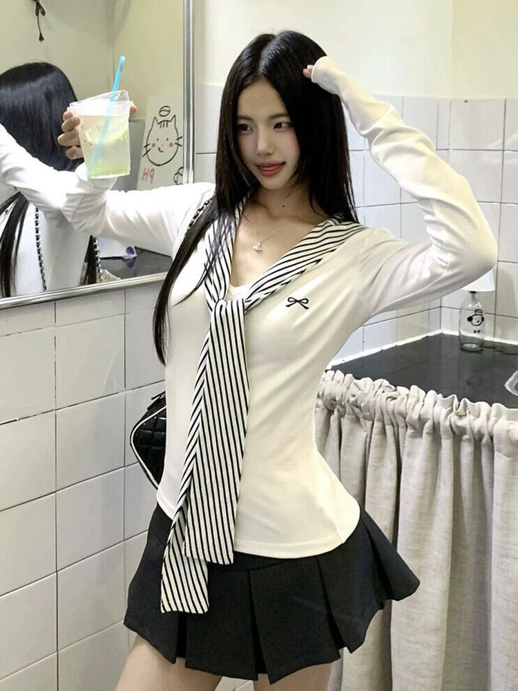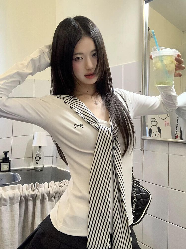 人棉莫代尔1*1随心裁韩版蝴蝶结刺绣长袖T恤女秋季修身上衣