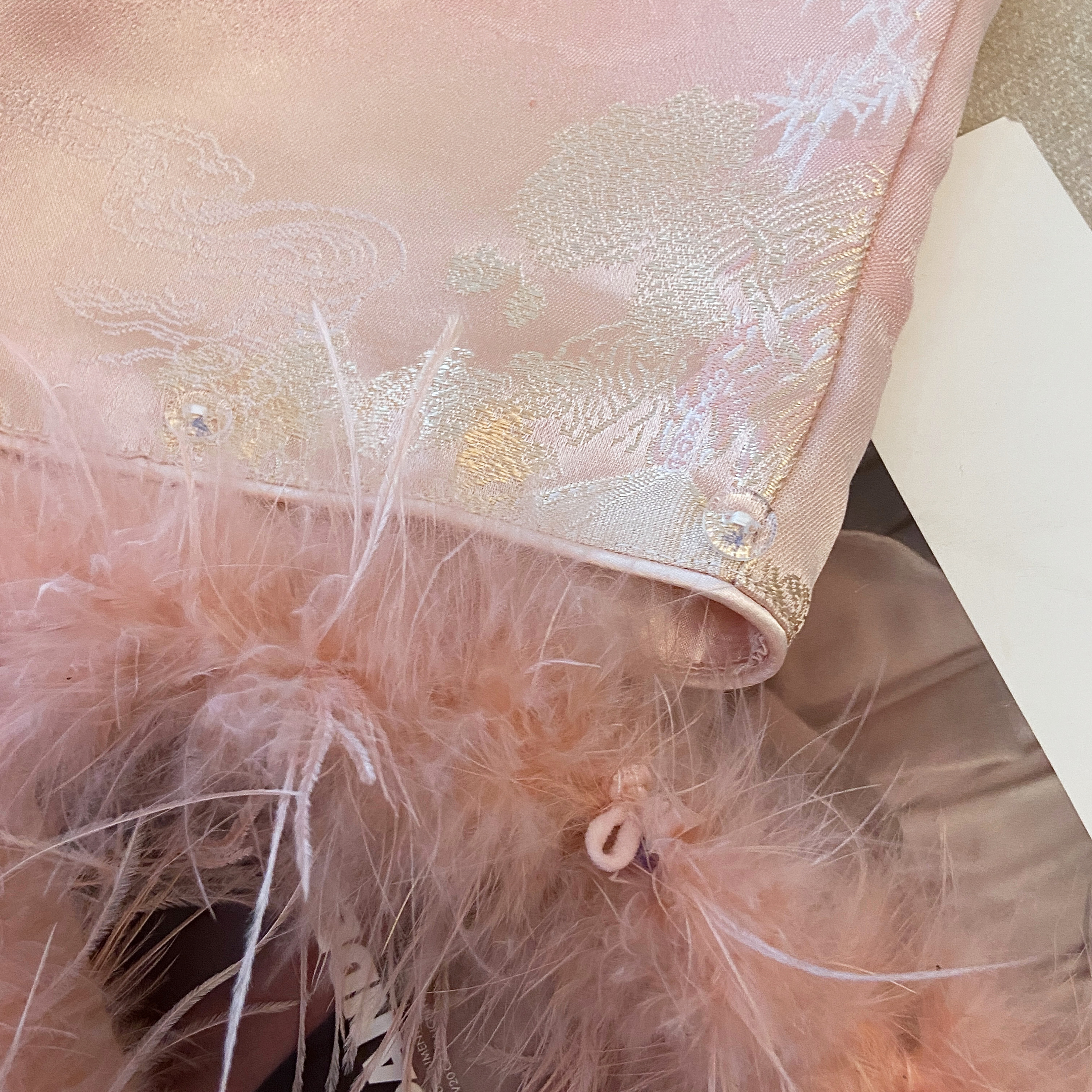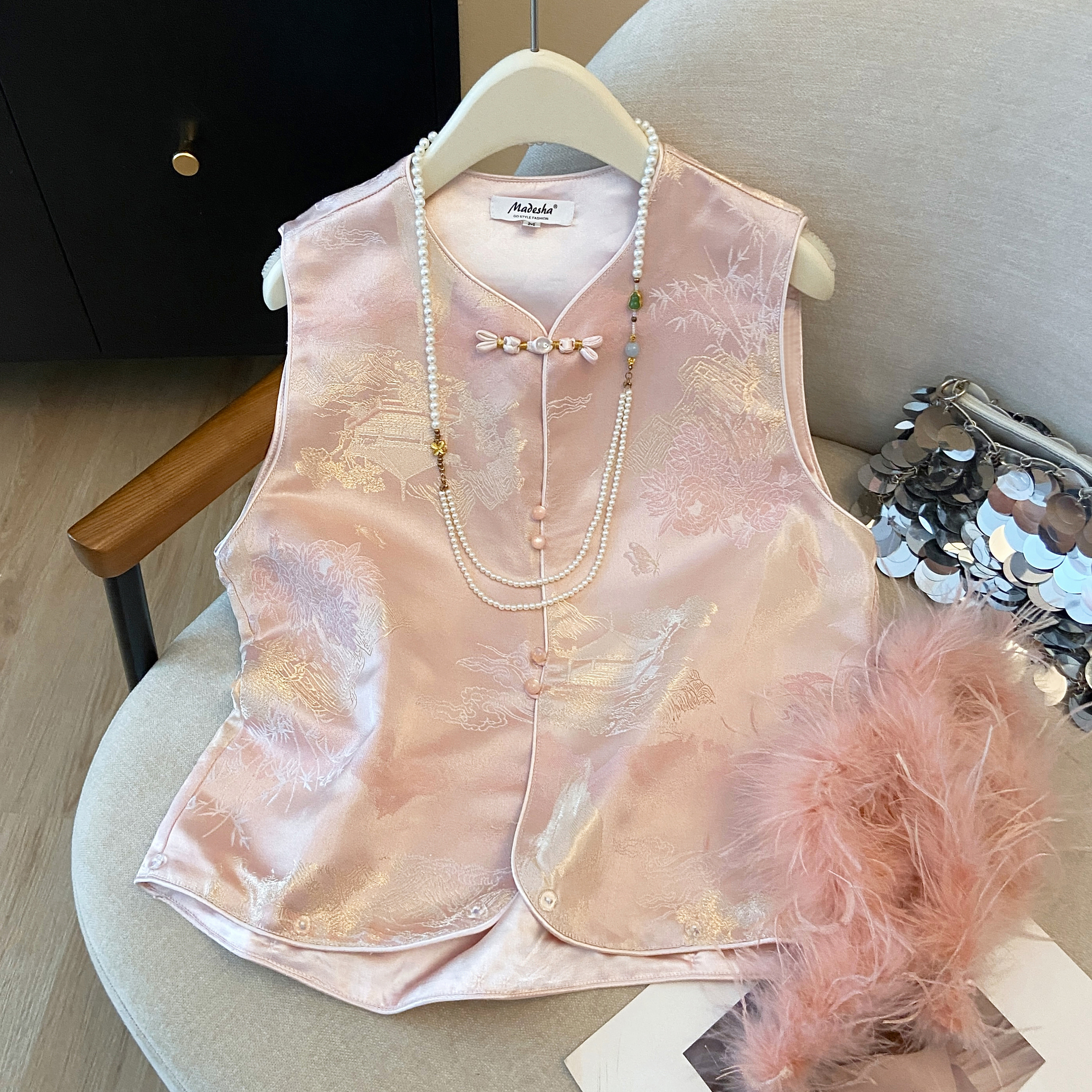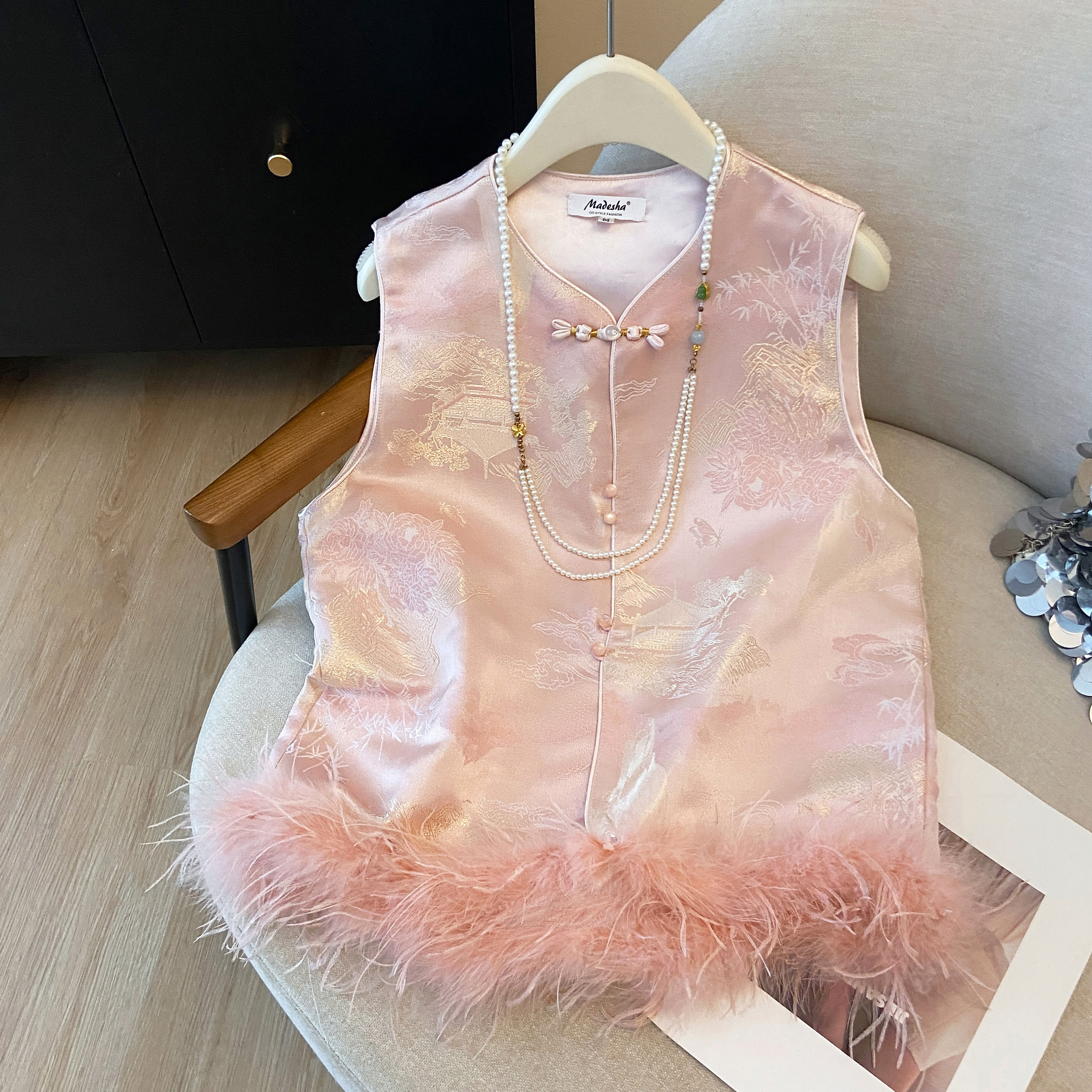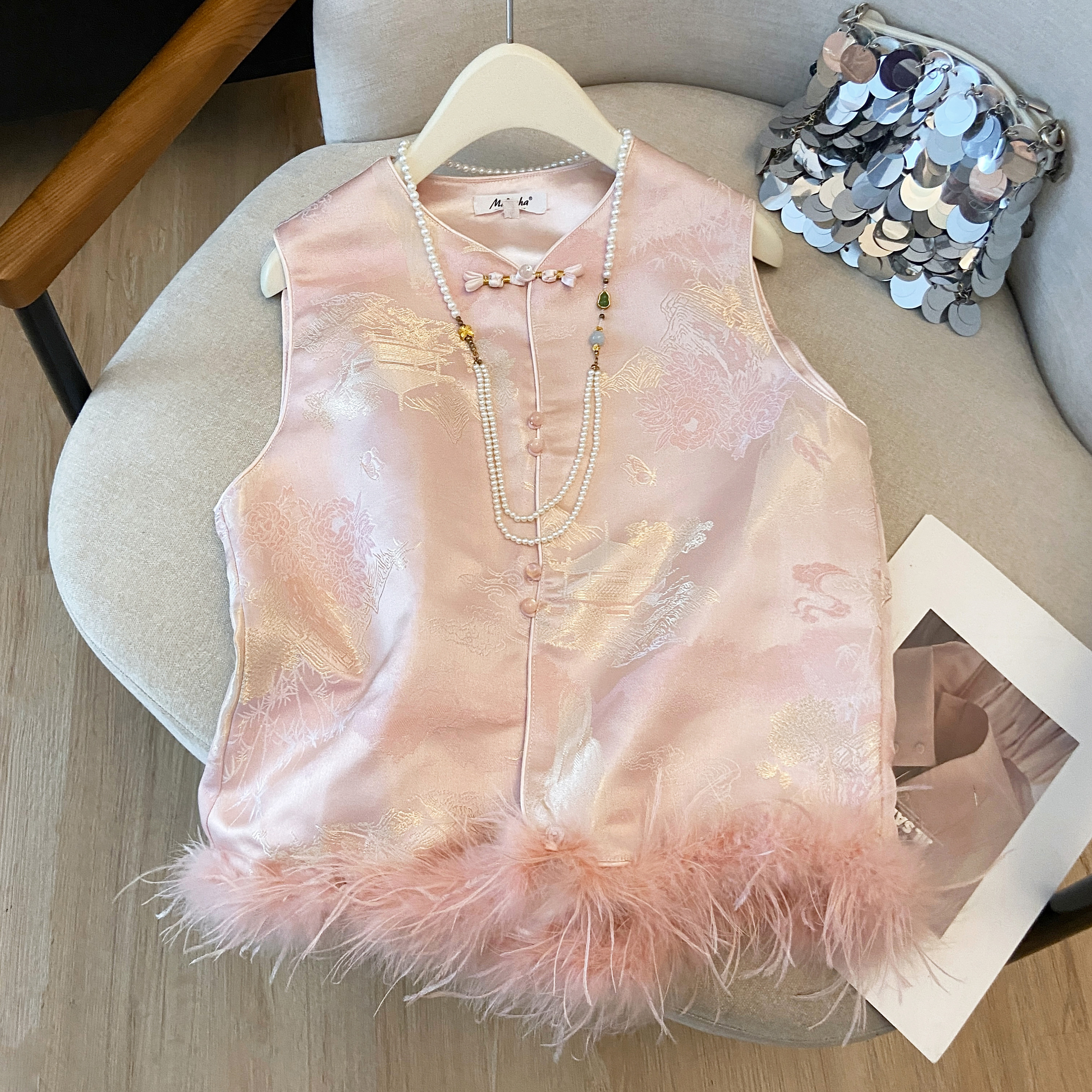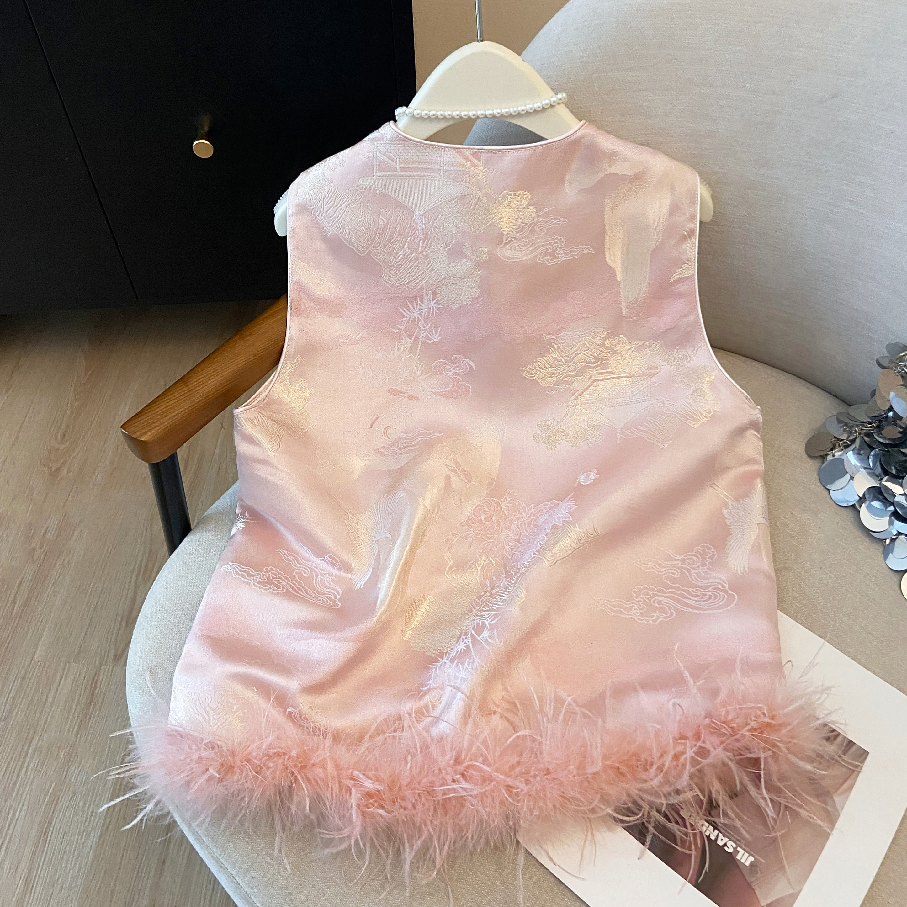 实拍 2025新款新中式驼鸟毛秋冬夹棉马甲背心女加厚提花国风外套
