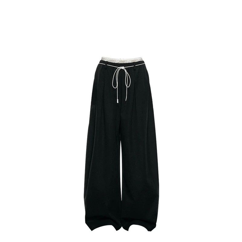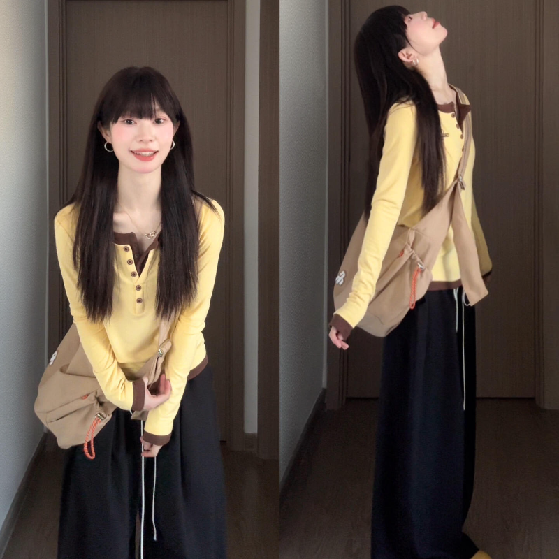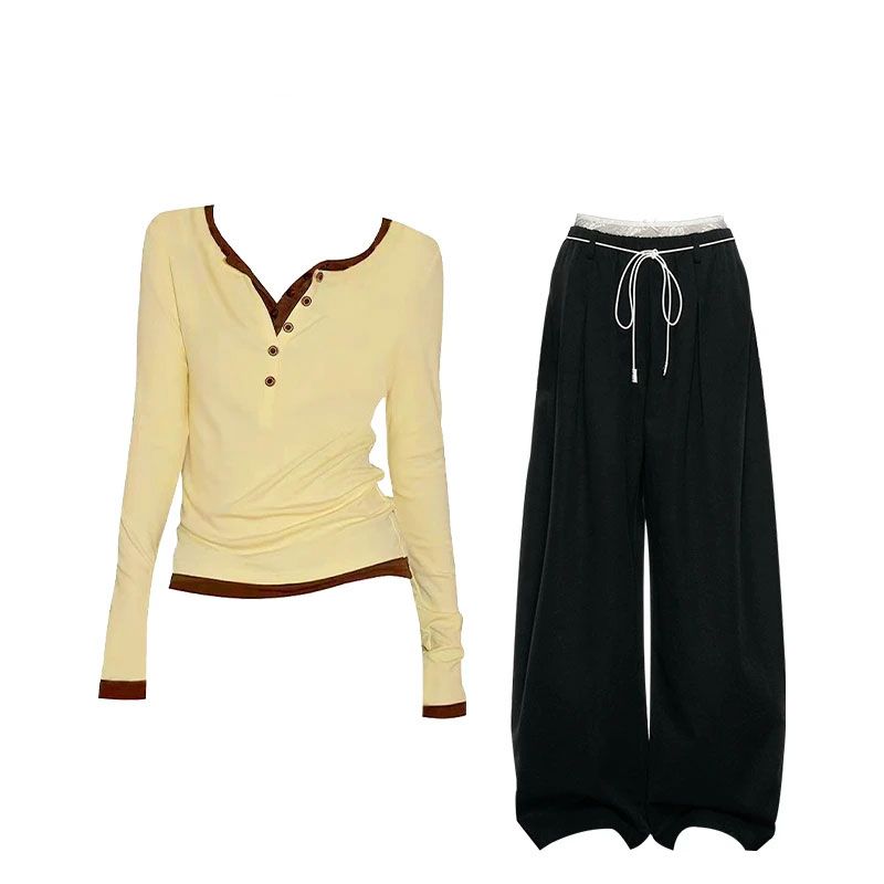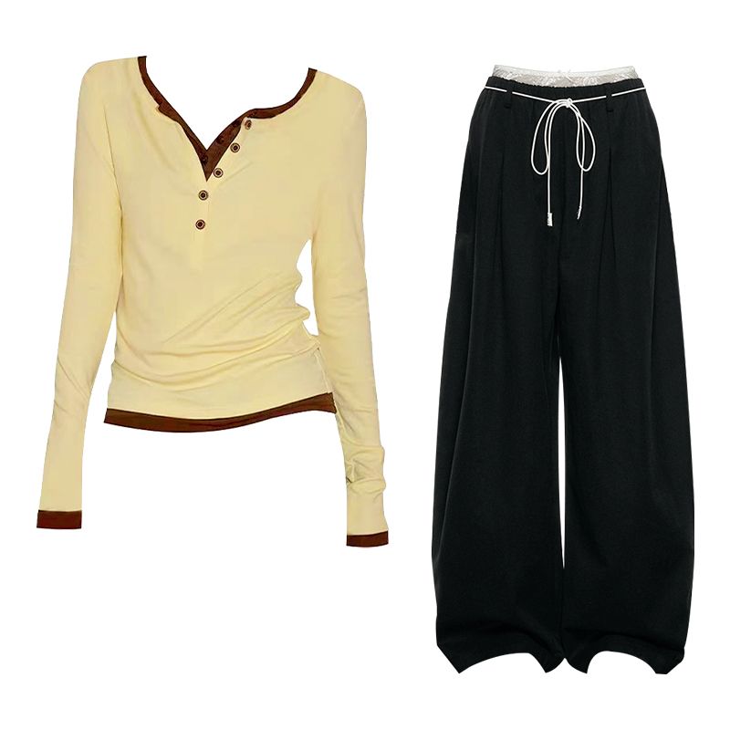 巨好看的早秋一整套韩系假两件长袖T恤蕾丝阔腿裤套装女秋季新款