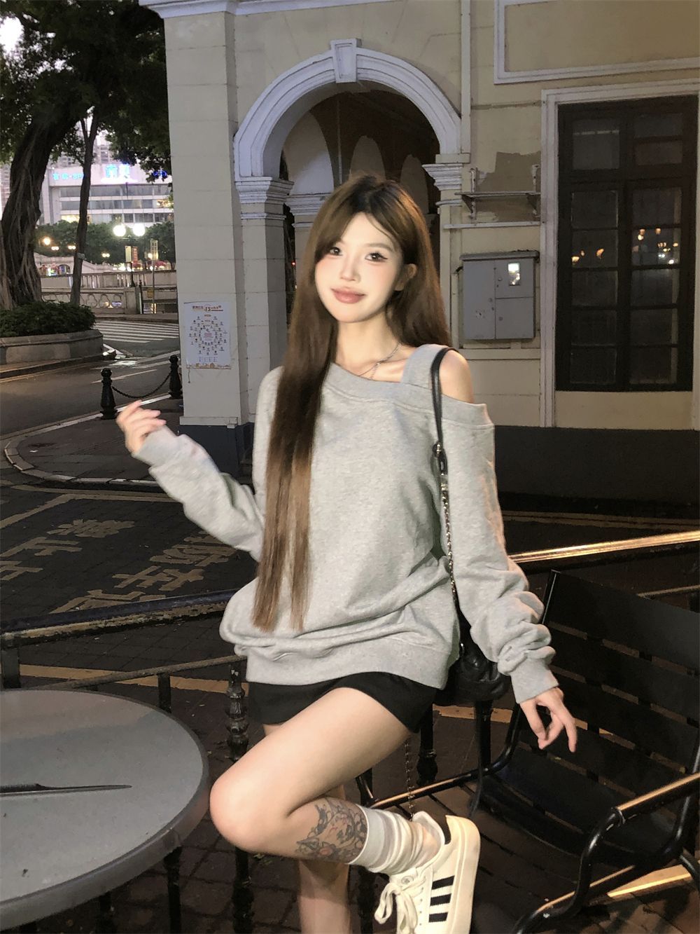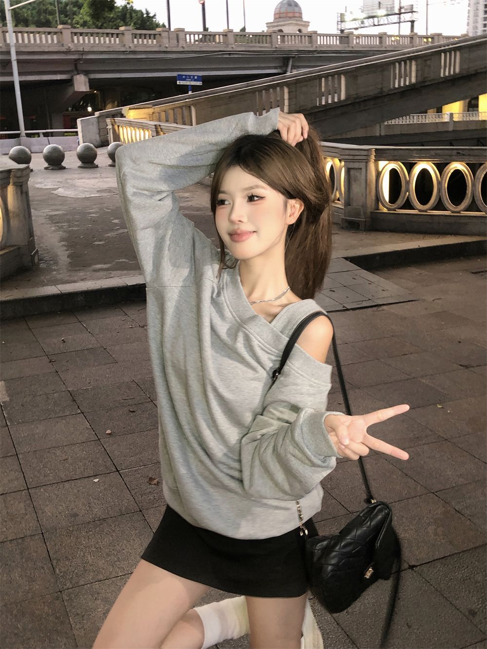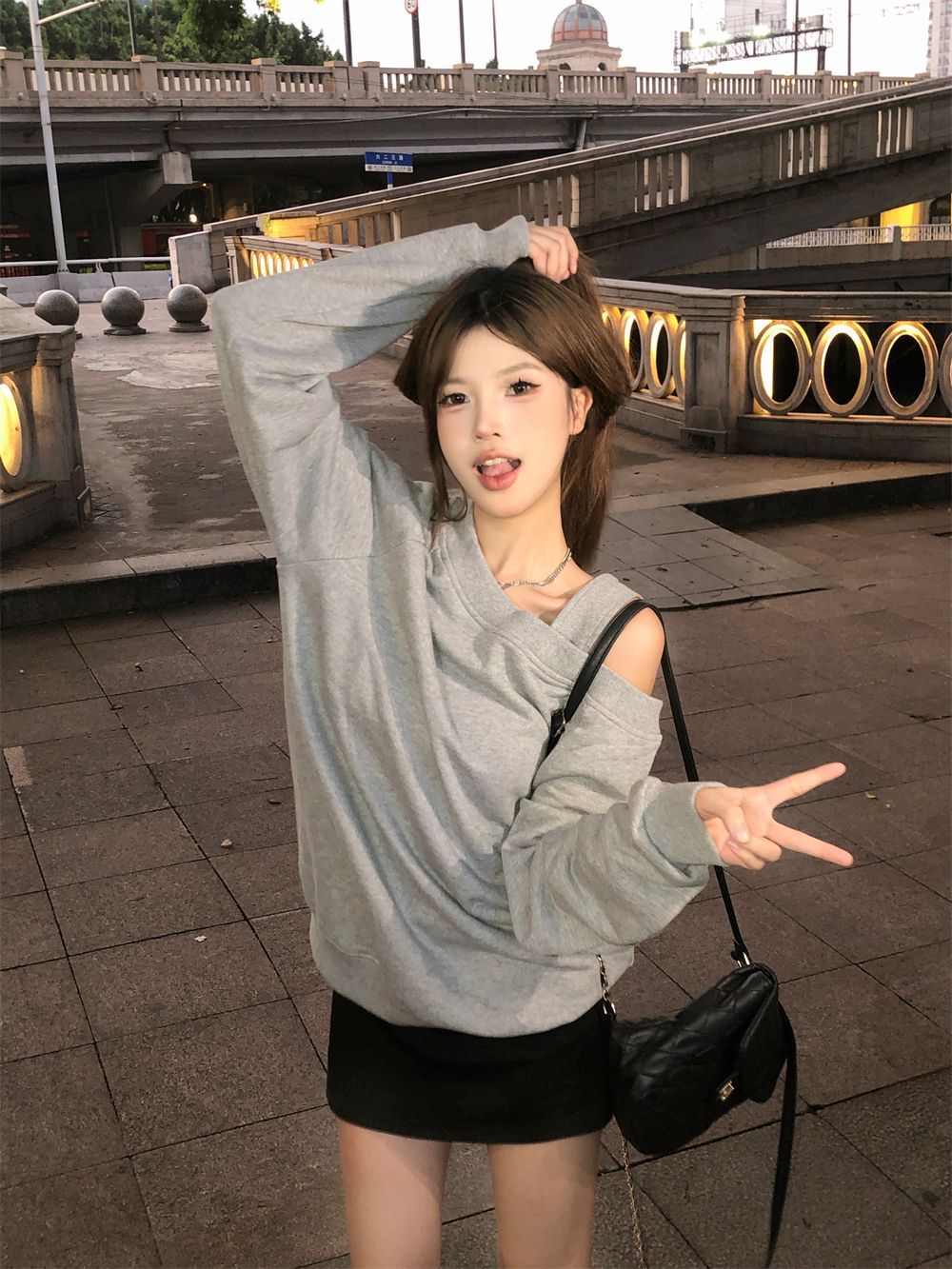 已出货 慵懒风露肩长袖显瘦别致斜肩上衣