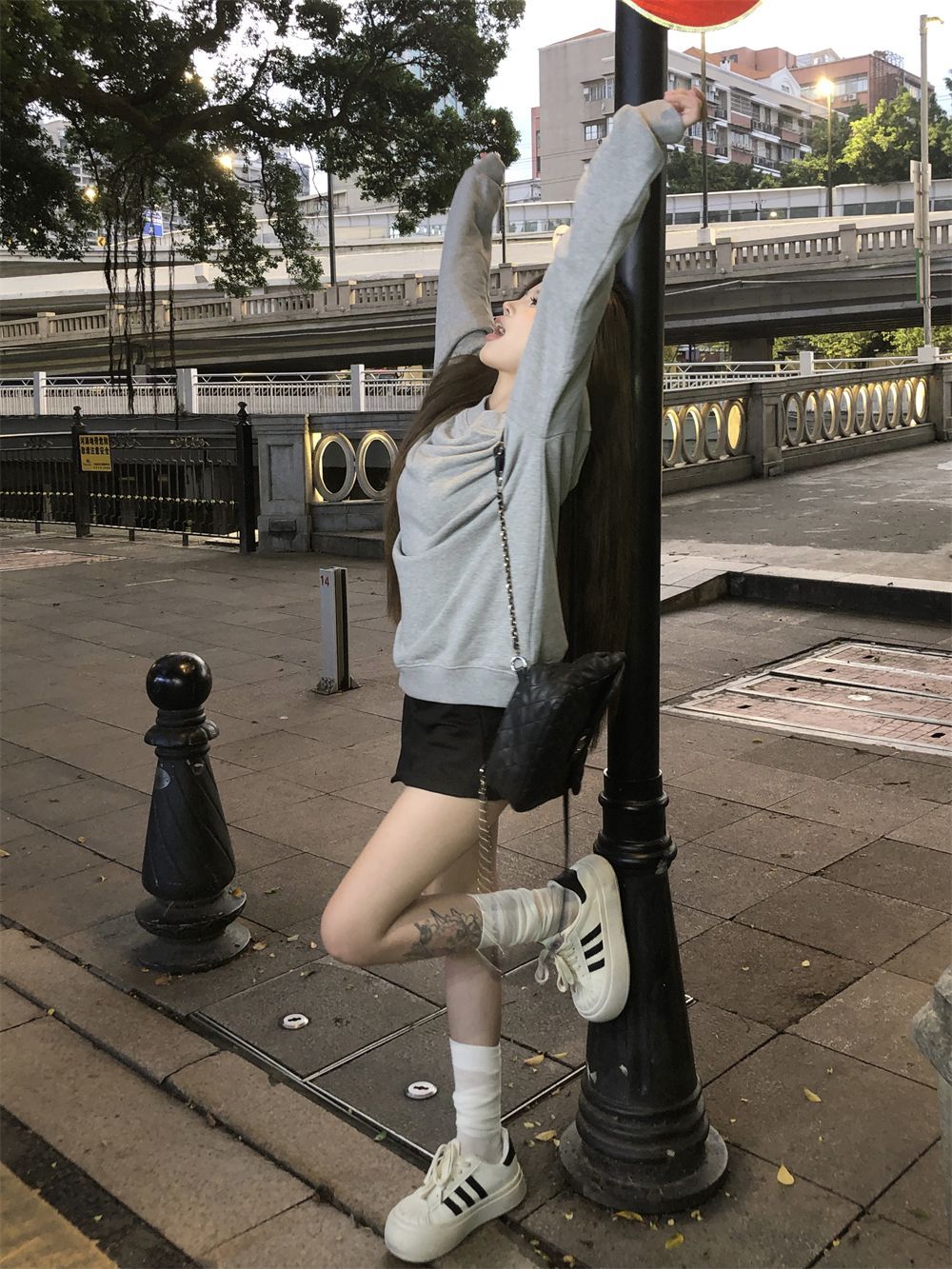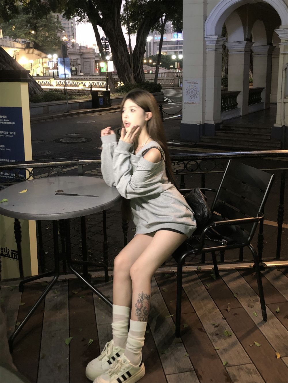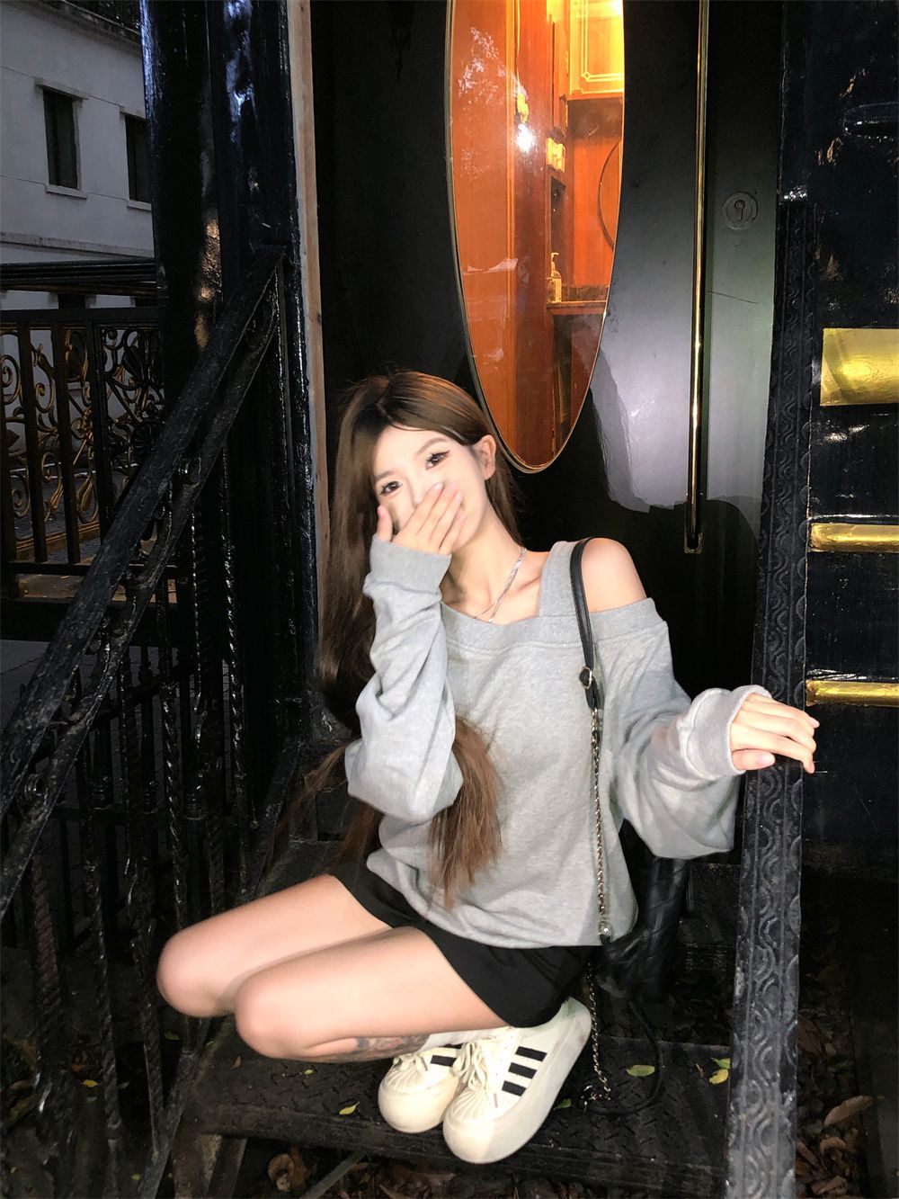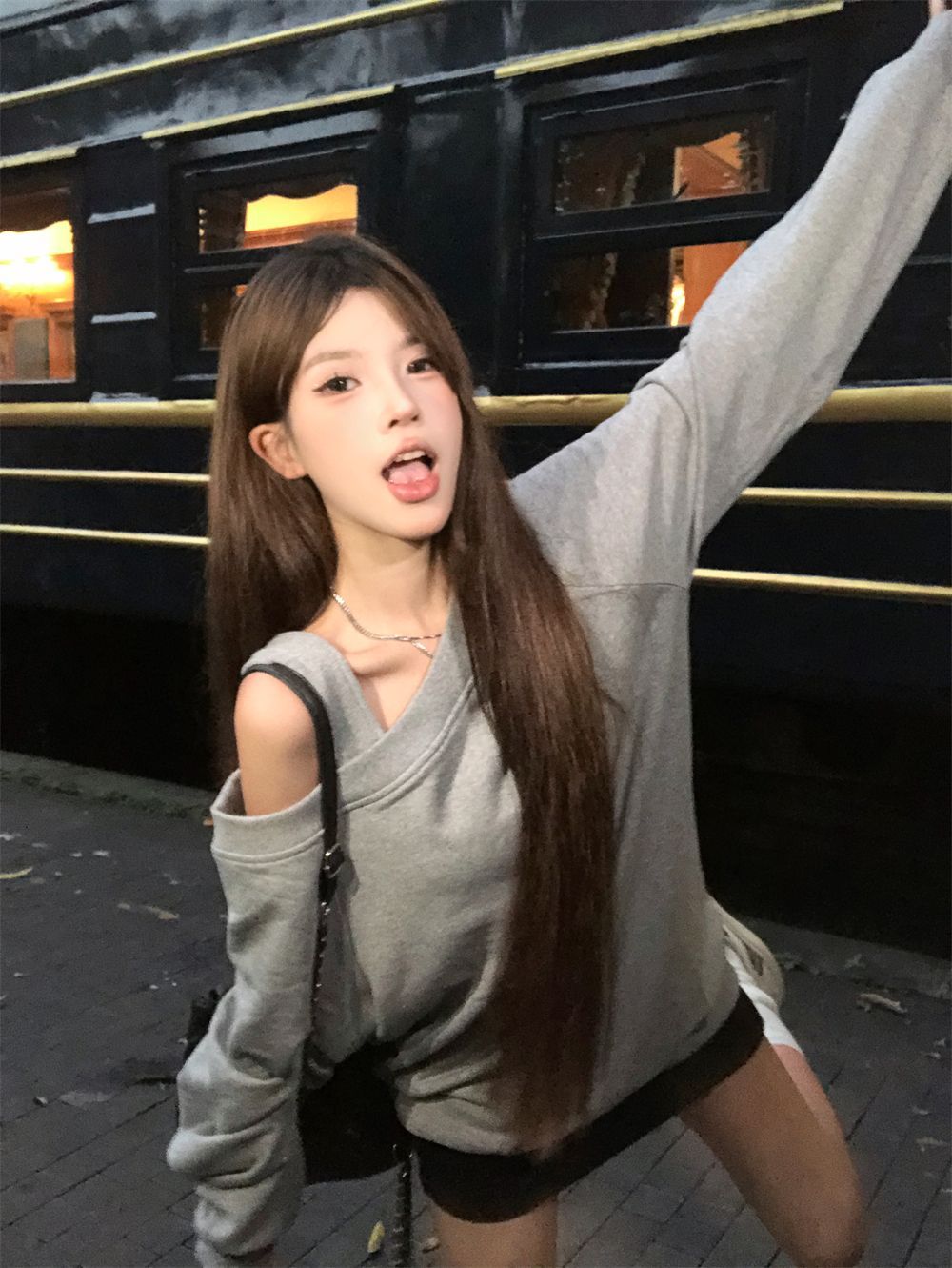 已出货 慵懒风露肩长袖显瘦别致斜肩上衣