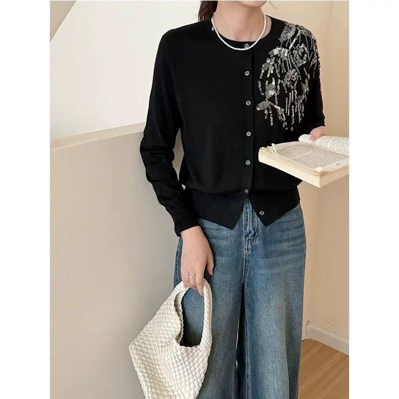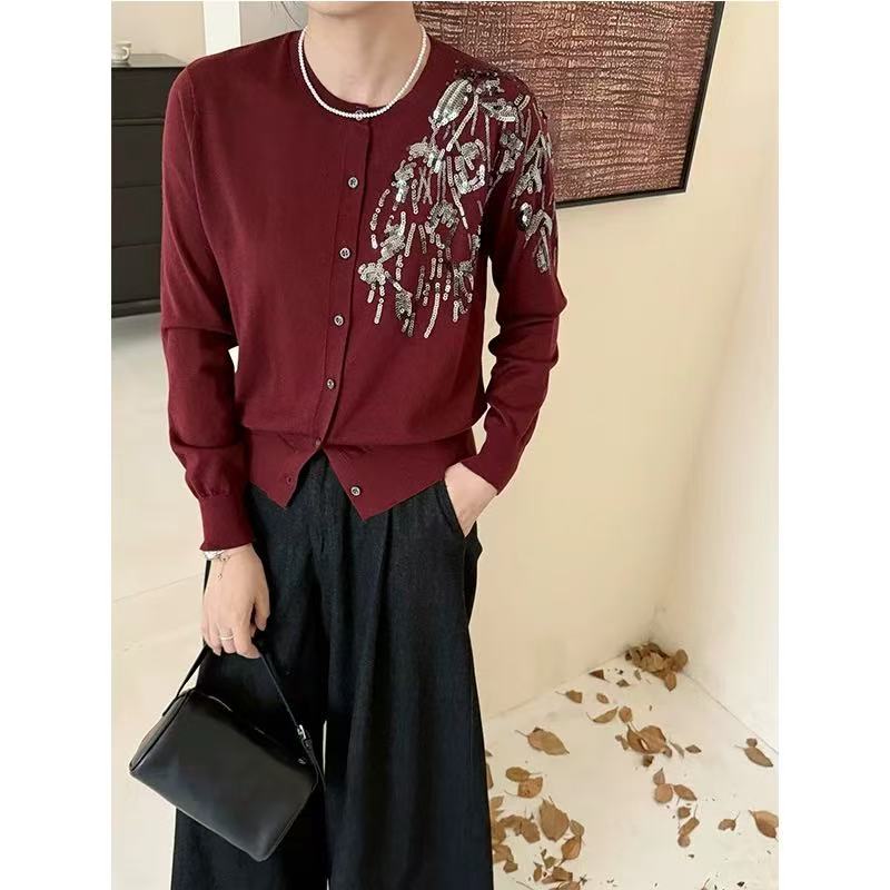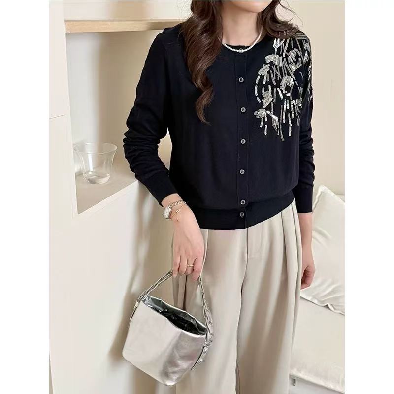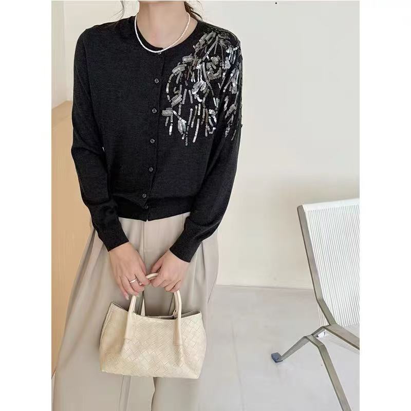 2025超火单肩亮片设计圆领针织开衫秋季女款气质轻熟显瘦羊毛外套