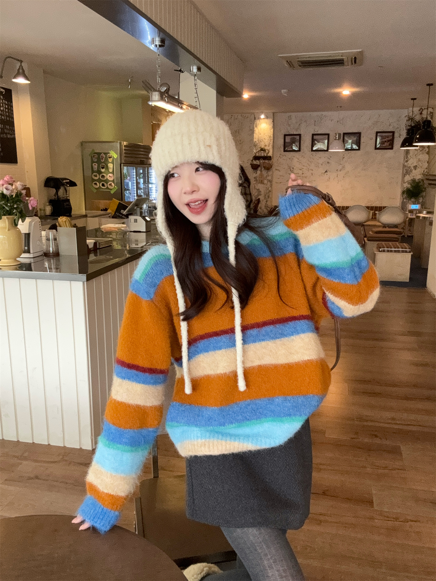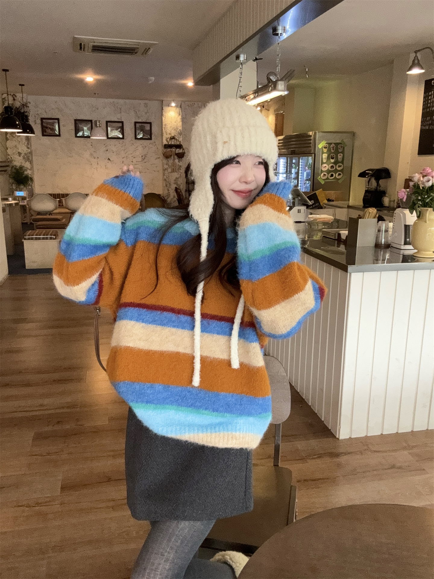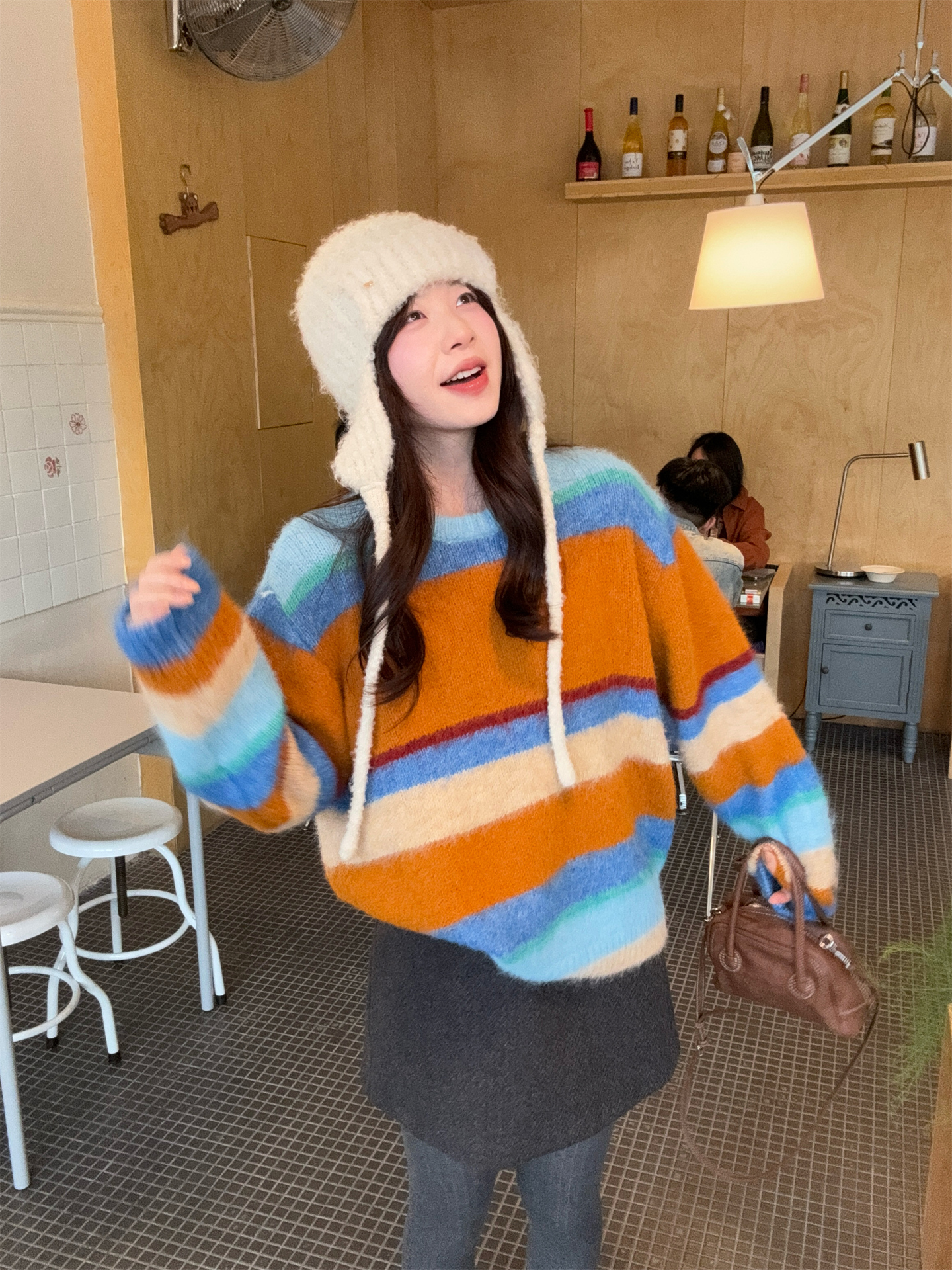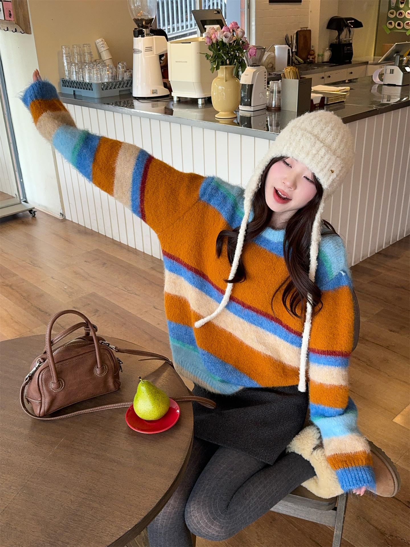 实拍 2025秋冬新款韩版拼色条纹撞色宽松长袖毛衣女宽松针织衫